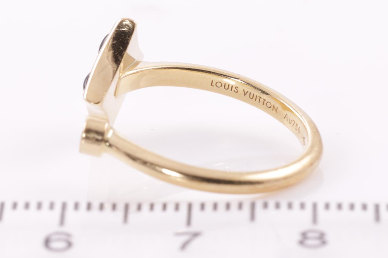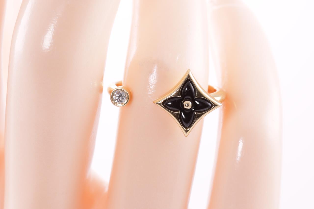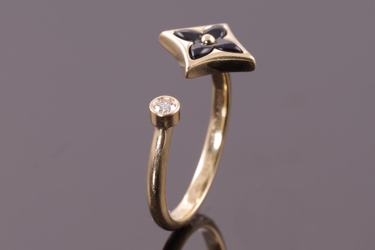 Louis Vuitton Colour Blossom Mini Star ring with Onyx and a round Diamond of 0.04ct. Motif 9.5mm. 18ct yellow gold. Made in France. Louis Vuitton stamped size 50, L - ring resizing is not recommended. Weight: 3.3g. With Louis Vuitton box. (Pre-owned)
