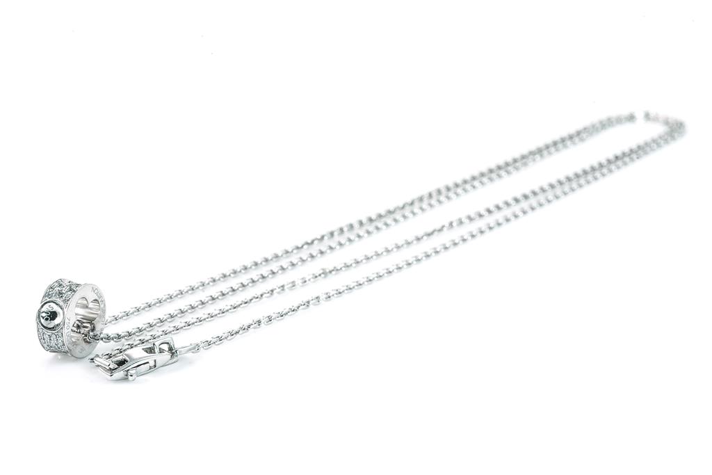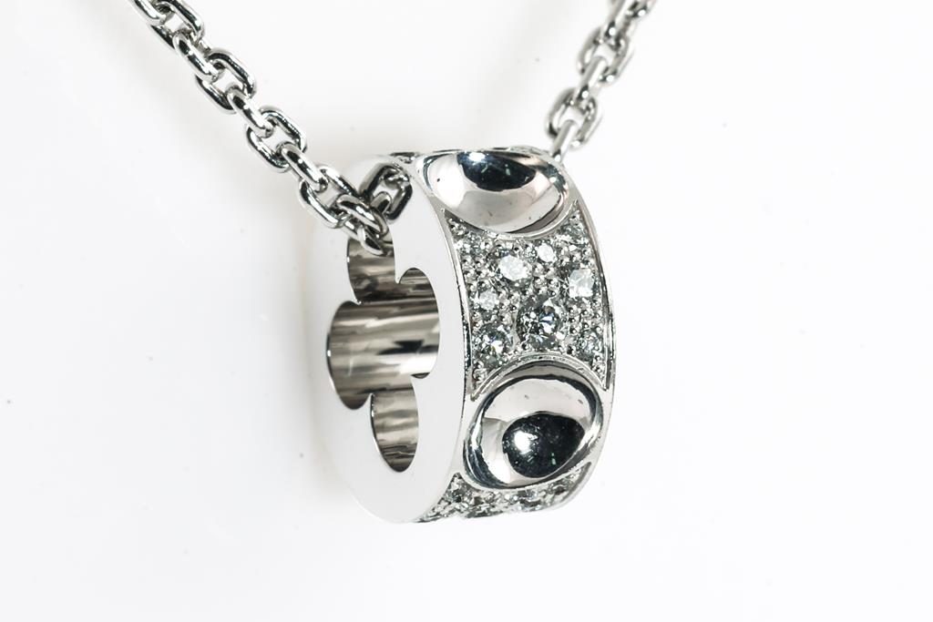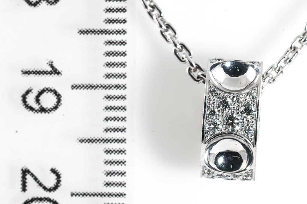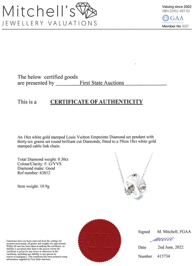 Louis Vuitton Empreinte Pendant. Dimensions 11mm x 5mm. With 36 round Diamonds totalling approximately 0.30cts (Estimated grading F-G VVS). 18ct white gold with 18ct white gold 59cm chain. Weight 10.9g. With certificate #415734. (Pre-owned)