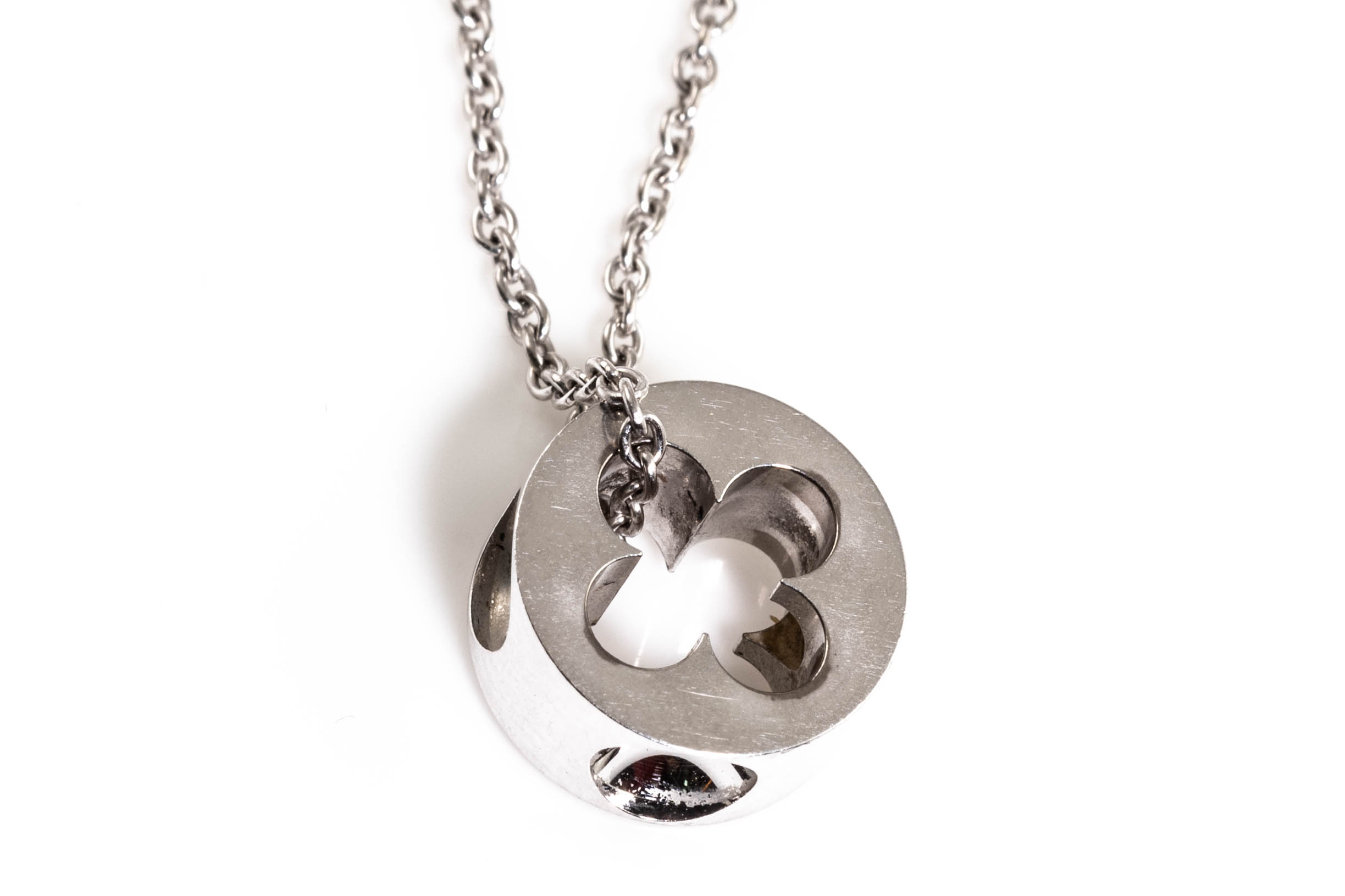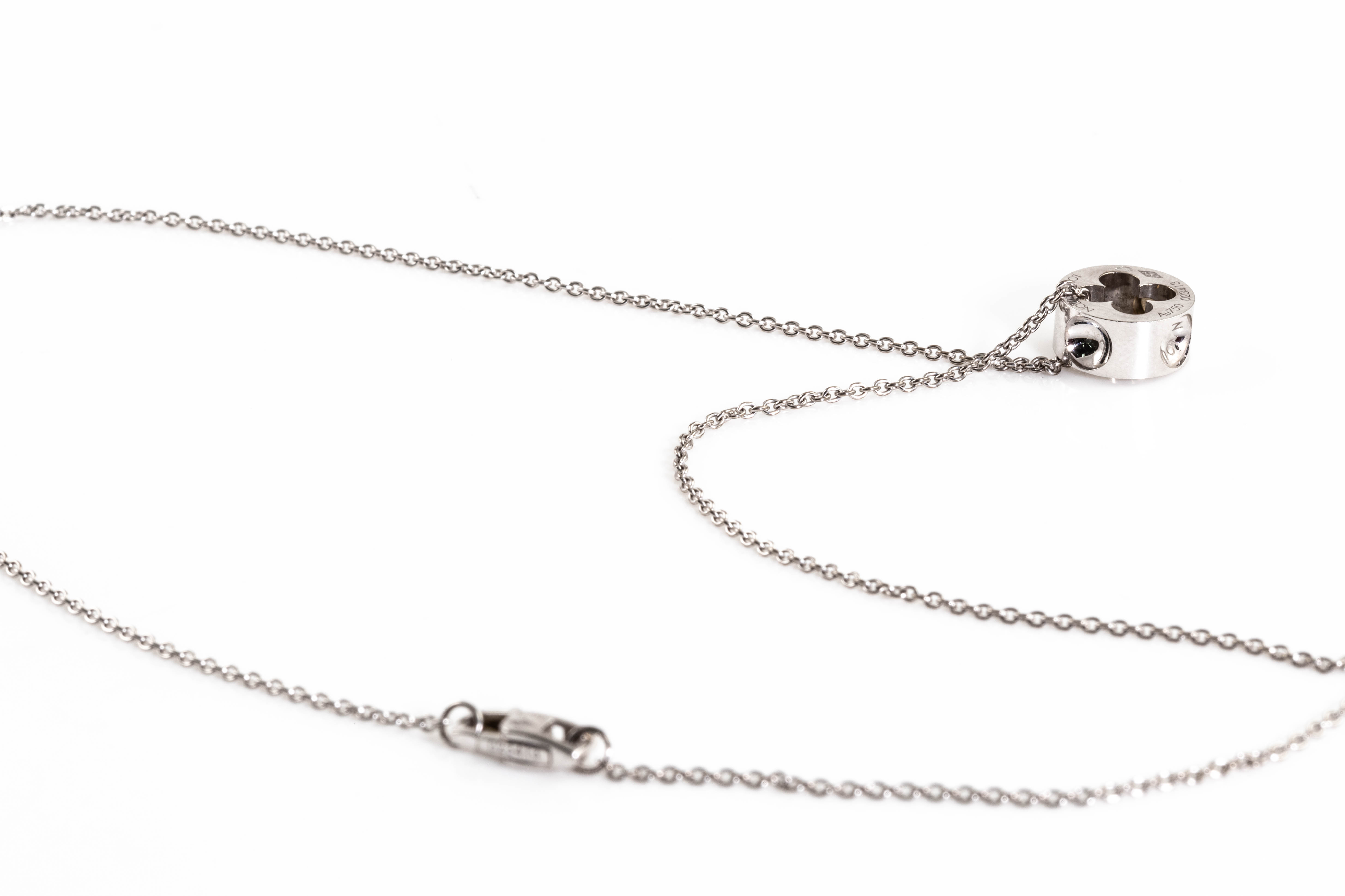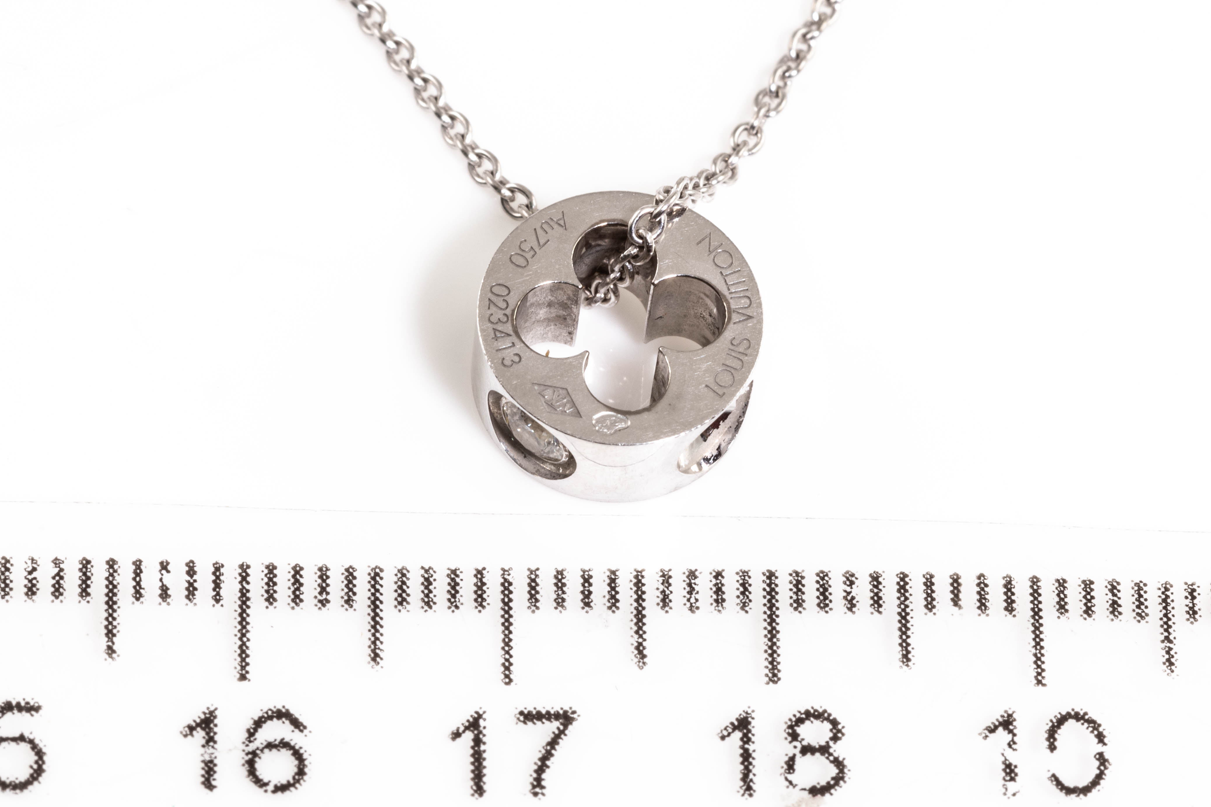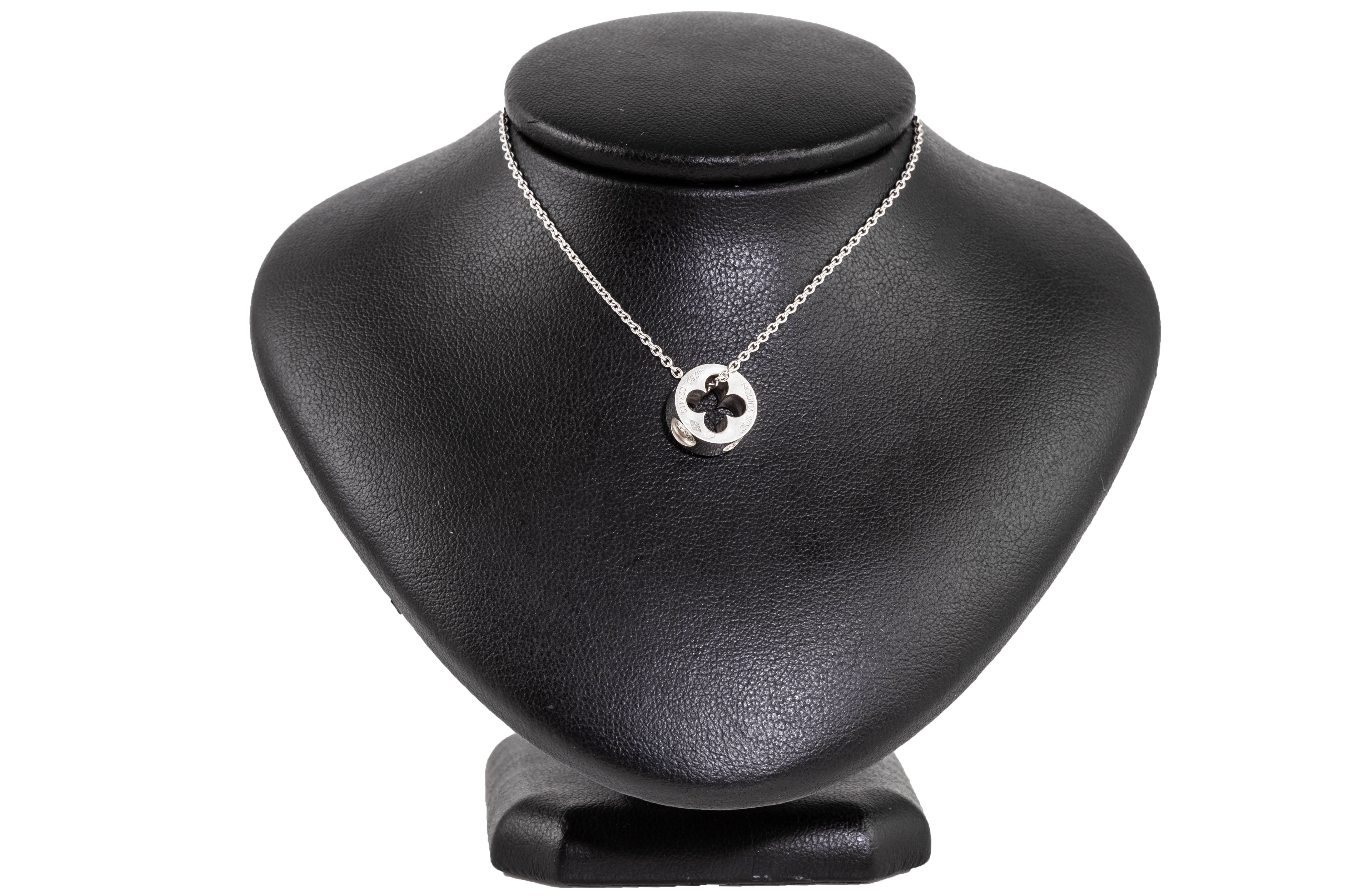 Louis Vuitton Empreinte pendant with Monogram Flower cut-out motif. With 1 round Diamond of 0.10ct. 18ct white gold with Louis Vuitton 18ct white gold 40cm chain. Weight: 6.6g. (Pre-owned)