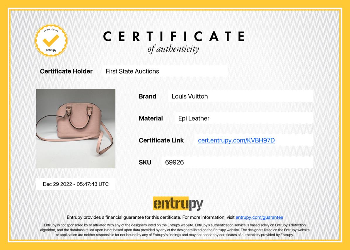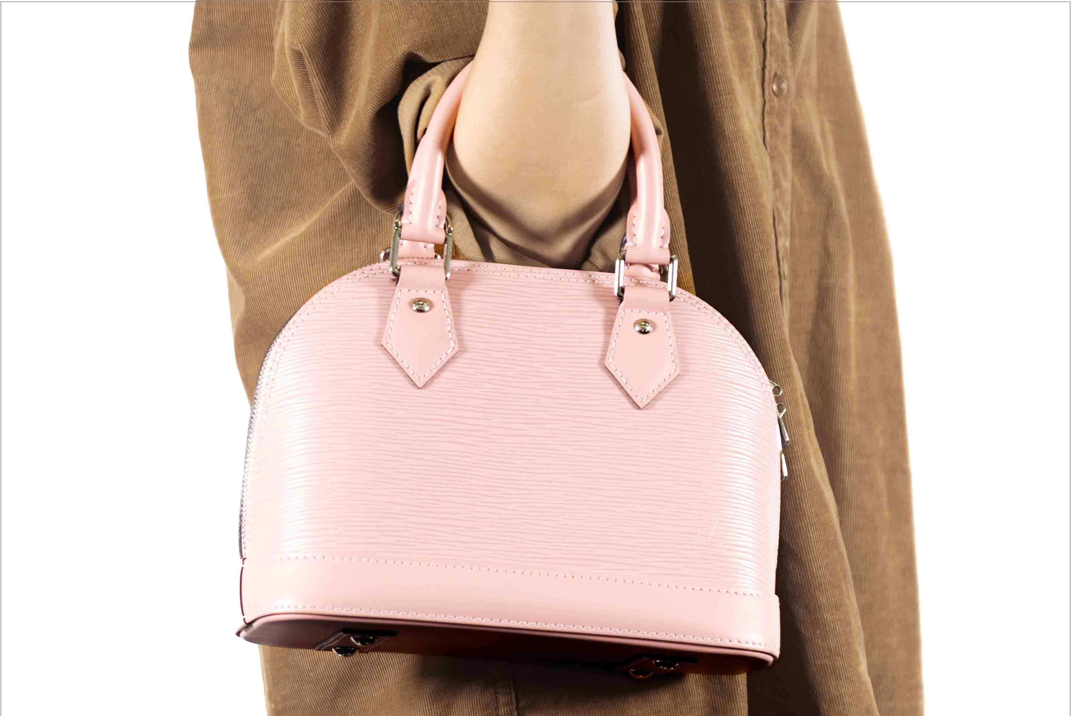 Louis Vuitton Epi Alma BB in Rose ballerine pink Epi cowhide Leather. Featuring pink microfiber lining, silver-tone hardware, double zip closure and one inside flat pocket. Approximate dimensions: 23.5cm (L) x 17.5cm (H) x11.5cm (D), 9cm handle drop, and 56cm removable strap drop. Accompanied by LV gift receipt (purchased Jan 2022), papers, dust bag and box, padlock, clochette and keys. With Entrupy Certificate of Authenticity. (Pre-owned)