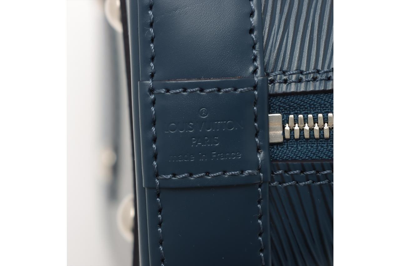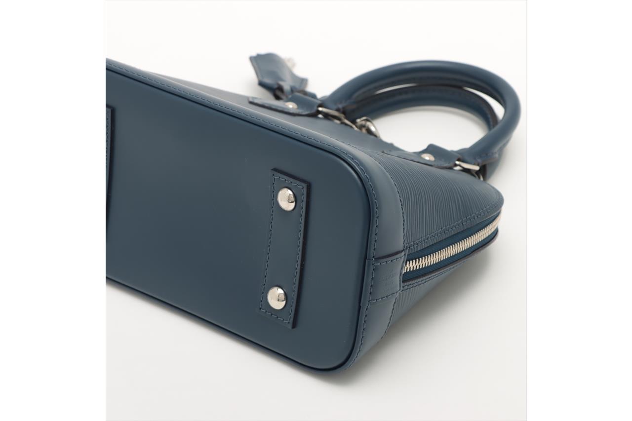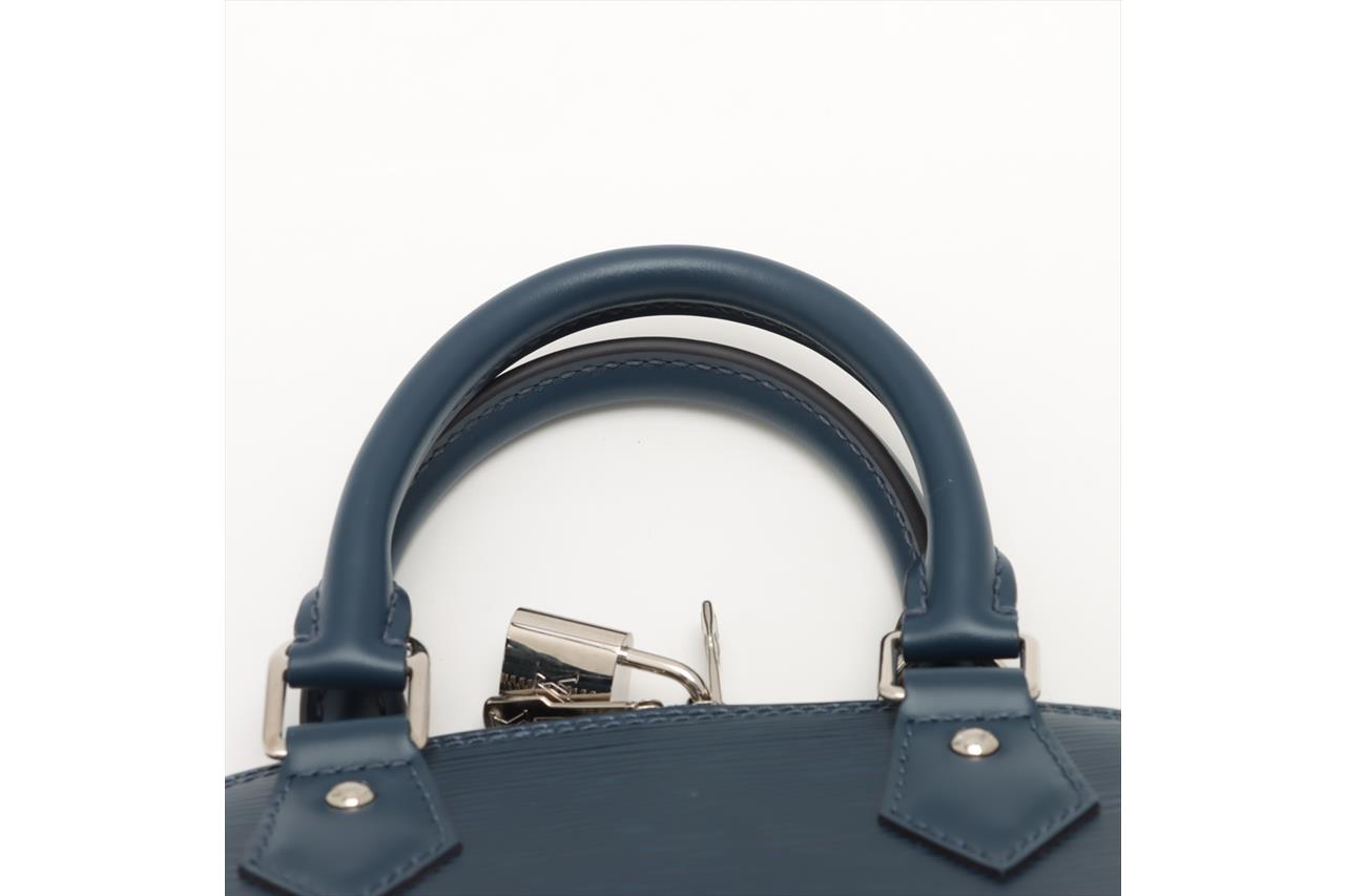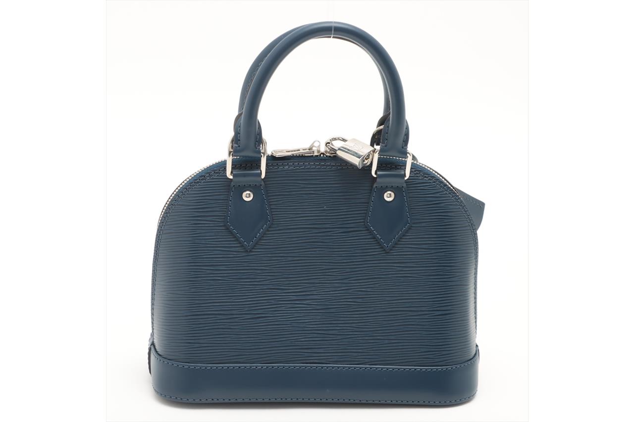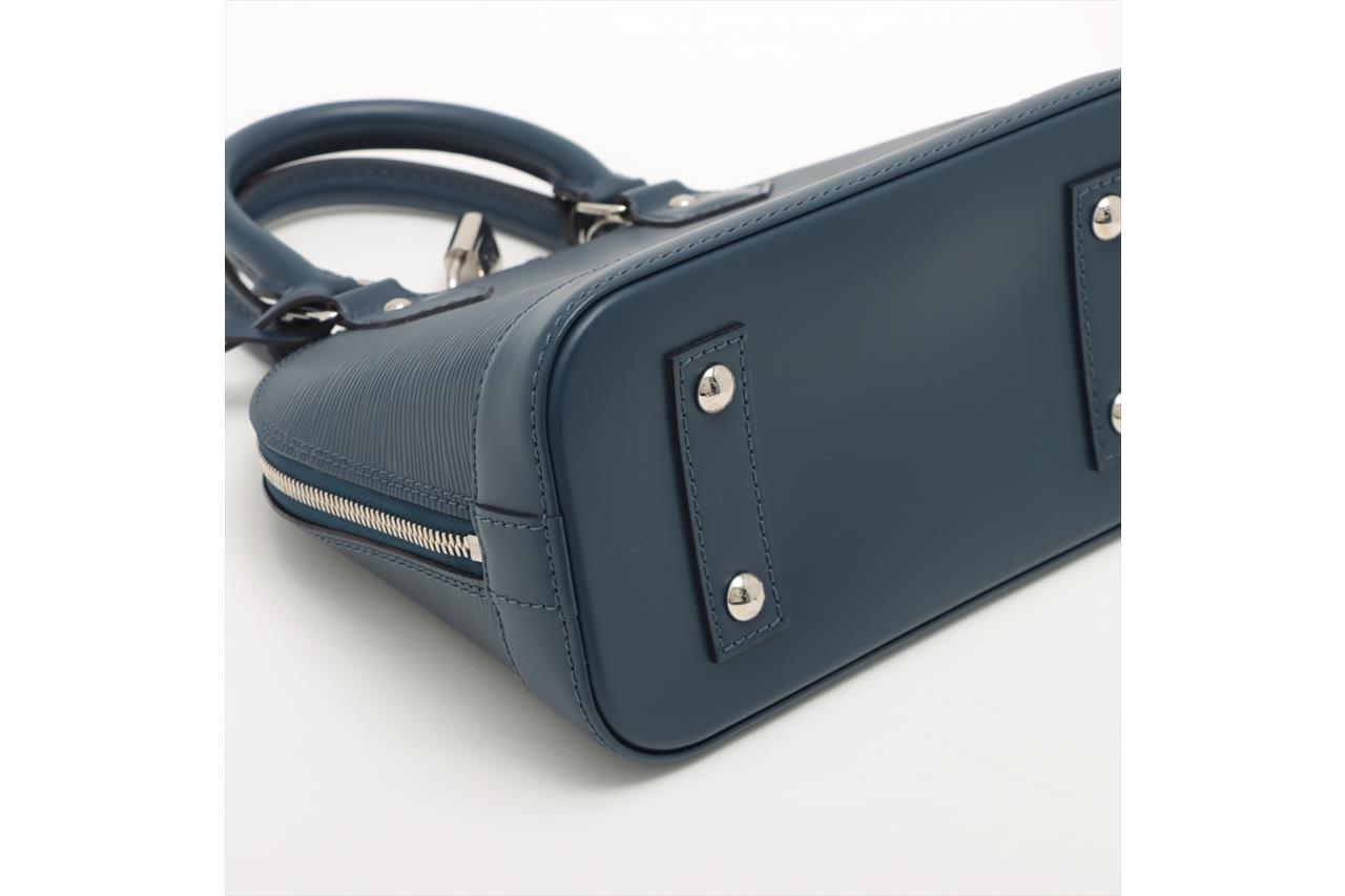 Louis Vuitton Alma BB bag in Indigo blue Epi Cowhide leather. Featuring smooth cowhide-leather trim, microfibre lining, dual handles, silver-colour hardware, double zip closure and inside flat pocket. Approximate dimensions: 24cm (L) x 16.5cm (H) x 11.5cm (D), 9cm handle drop and 56cm detachable strap drop. Accompanied by Louis Vuitton padlock, key bell, and dust bags. With Entrupy Certificate of Authenticity. (Pre-owned)