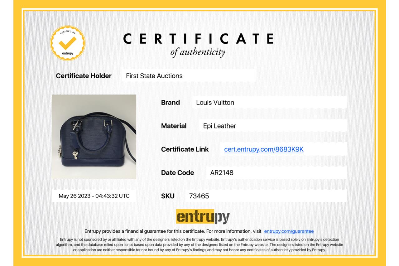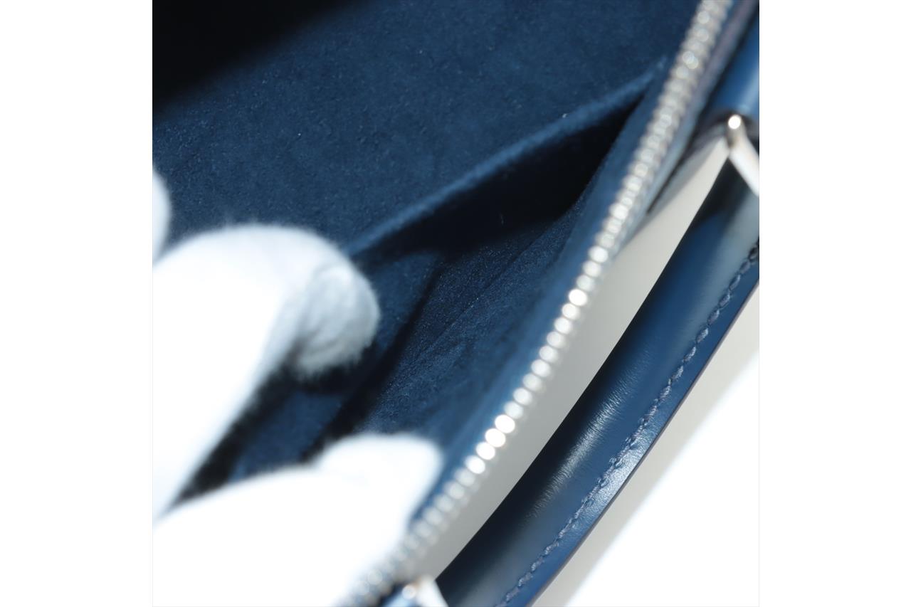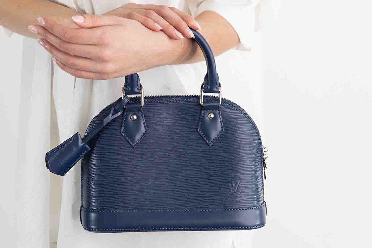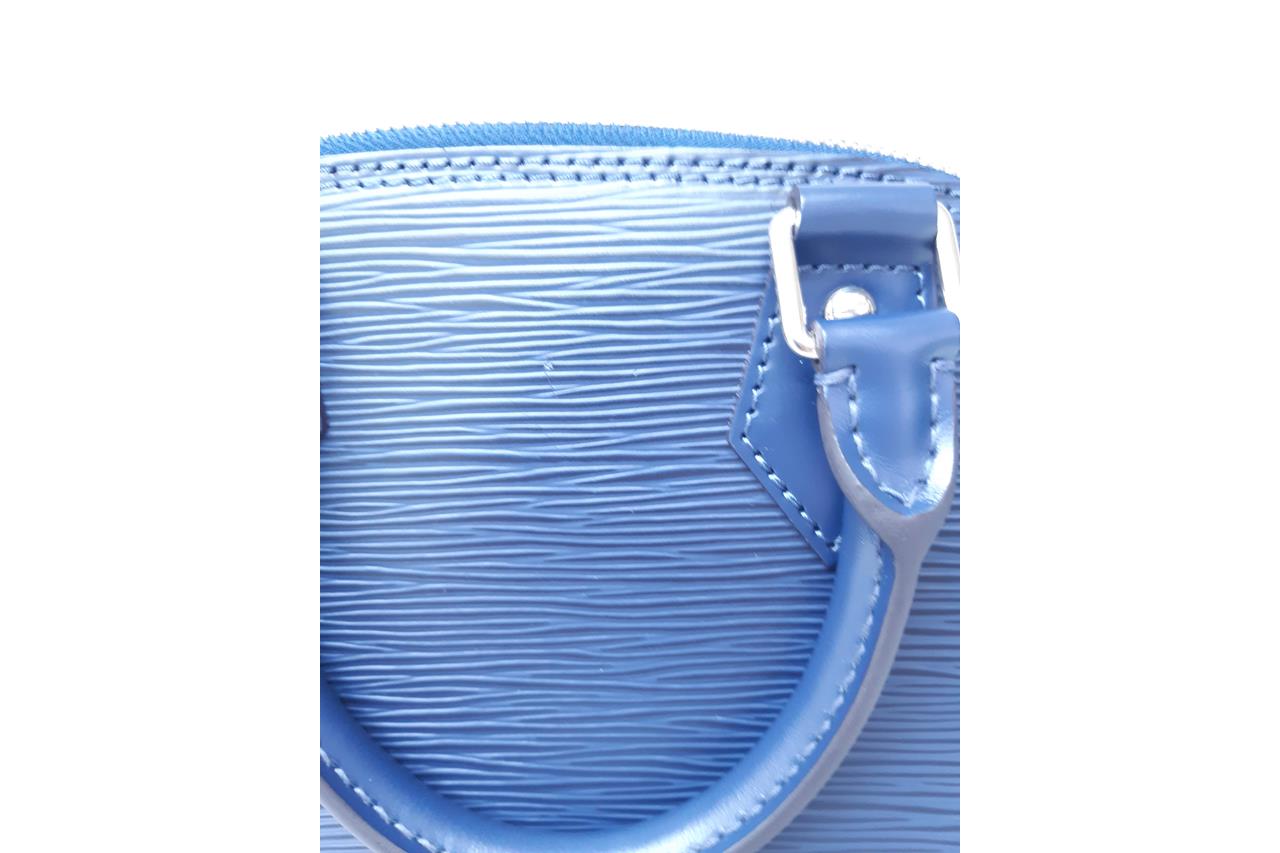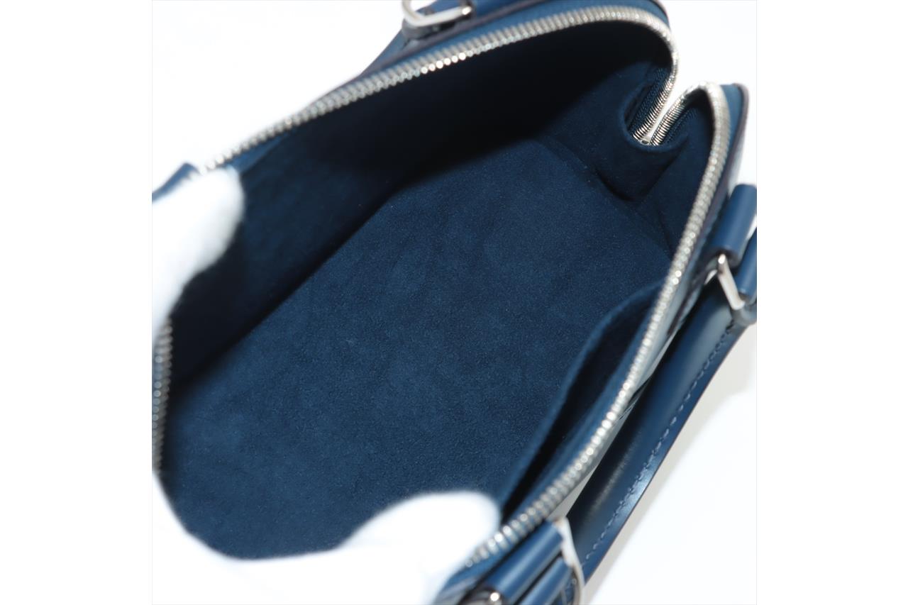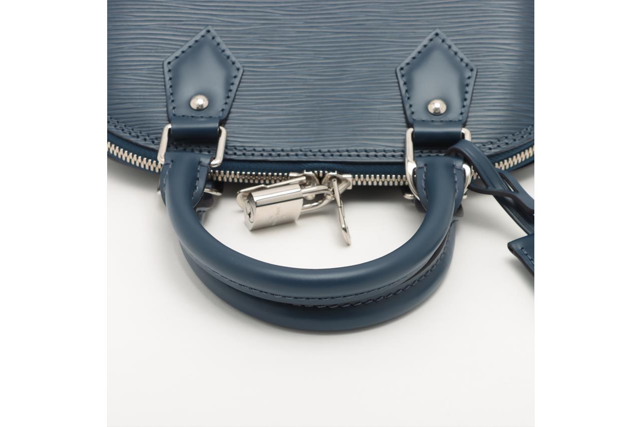 Louis Vuitton Alma BB bag in Indigo blue Epi Cowhide leather. Featuring smooth cowhide-leather trim, microfibre lining, dual handles, silver-colour hardware, double zip closure and inside flat pocket. Approximate dimensions: 24cm (L) x 16.5cm (H) x 11.5cm (D), 9cm handle drop and 56cm detachable strap drop. Accompanied by Louis Vuitton padlock, key bell, and dust bags. With Entrupy Certificate of Authenticity. (Pre-owned)