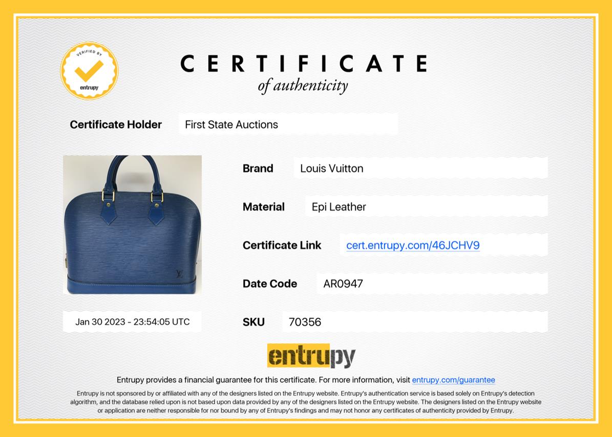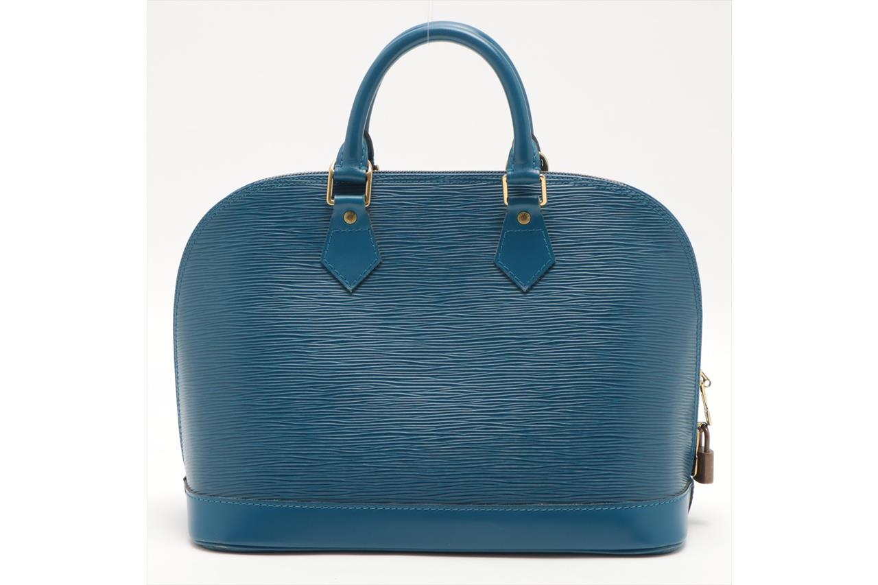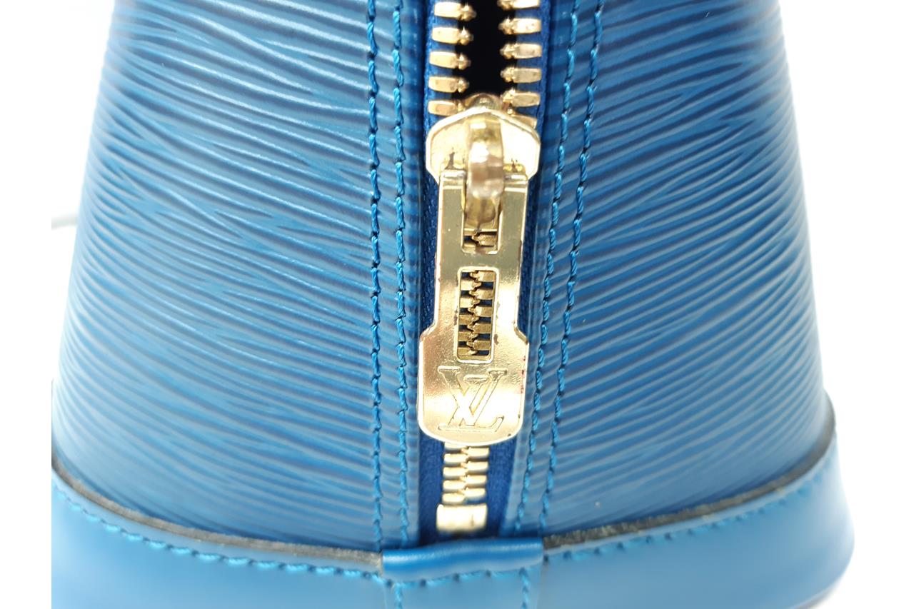 Louis Vuitton Alma PM bag in blue Eip leather (circa 1997). Featuring gold-toned hardware, two-way zip closure on top, it opens to blue microfibre lining interior with single patch pocket. Approximate dimensions: 30.5cm(L) x 22.5cm(H) x 16.5cm(D), 9cm handle drop. With Entrupy Certificate of Authenticity. (Pre-owned)