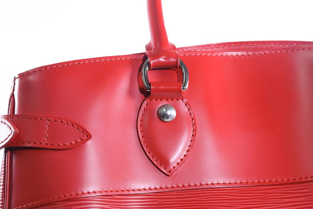 Louis Vuitton Passy GM in Red Epi Leather. Featuring silver-tone hardware, LV monogram, rolled leather handles, nylon lining, three interior pockets with card slots and clasp closure at top. Approximate dimensions: 39cm (L) x 28cm (H) x 14cm (D), and 9cm handle height. Accompanied by Louis Vuitton dust bag. (Pre-owned)