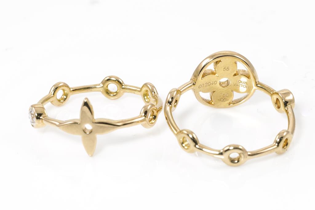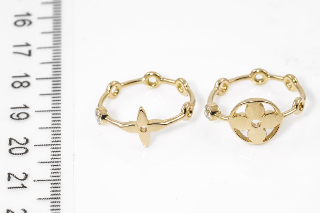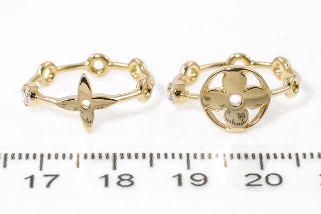 Louis Vuitton Monogram Idylle Blossom set of two rings with 2 round Diamonds totalling 0.20cts. 18ct yellow gold. Louis Vuitton stamped size 55. Actual size J1/2 - (as ring has been resized previously) . With Louis Vuitton box. Total weight: 4.1g. (Pre-owned)