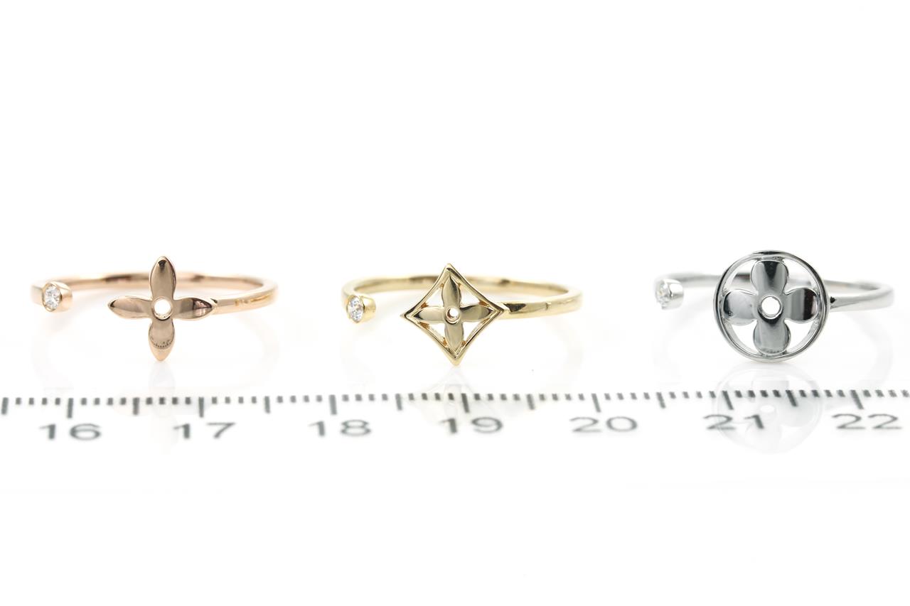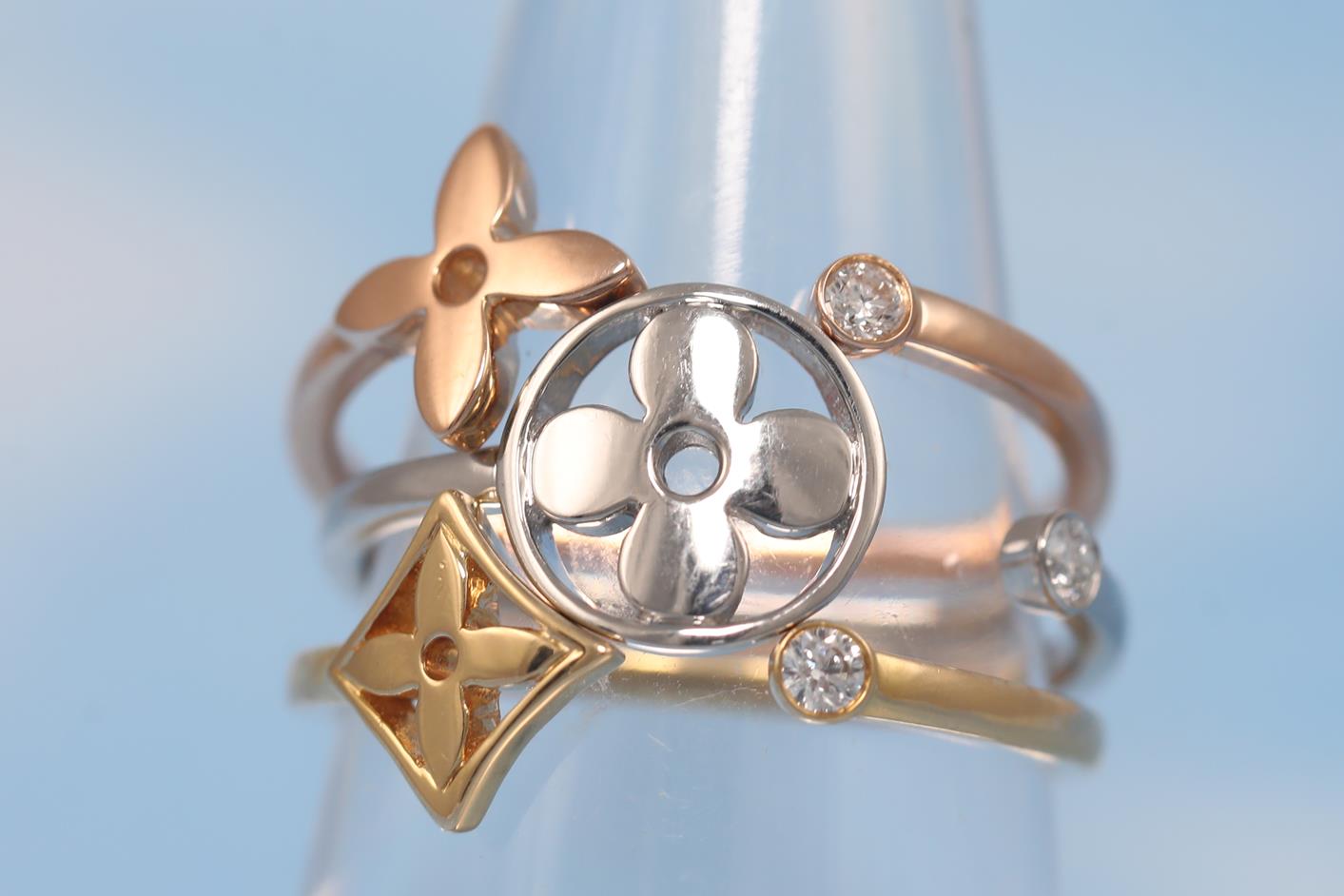 Louis Vuitton Idylle Blossom 3 ring set with round Diamonds totalling 0.10cts. 18ct yellow, white & rose gold. Total weight: 5.6g. Louis Vuitton stamped size 53, N - ring resizing is not recommended. With certificate #415259. (Pre-owned)