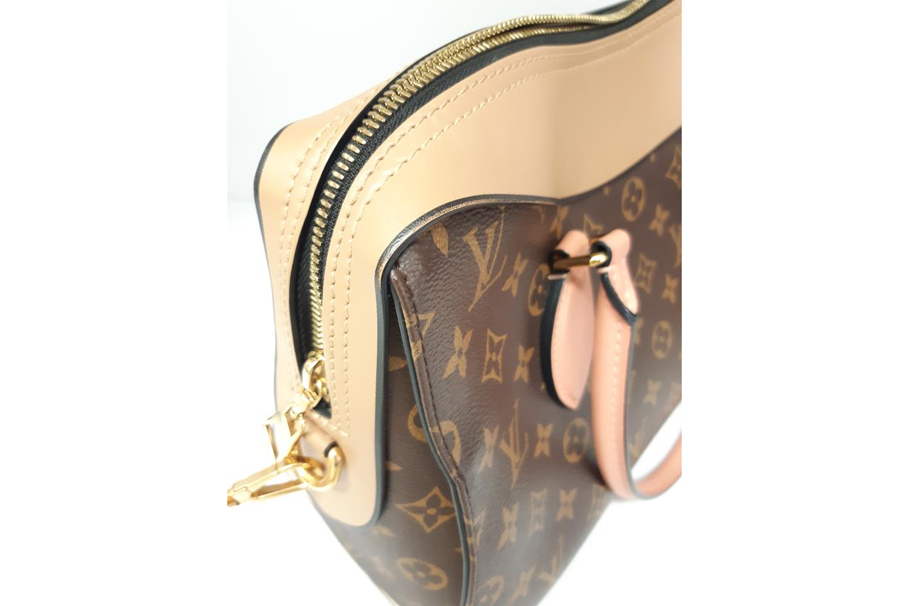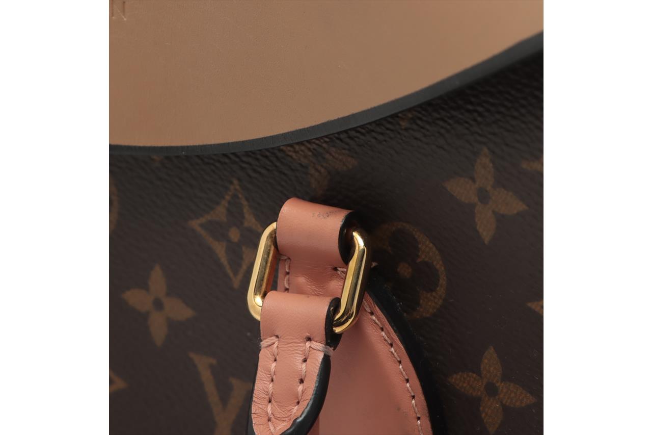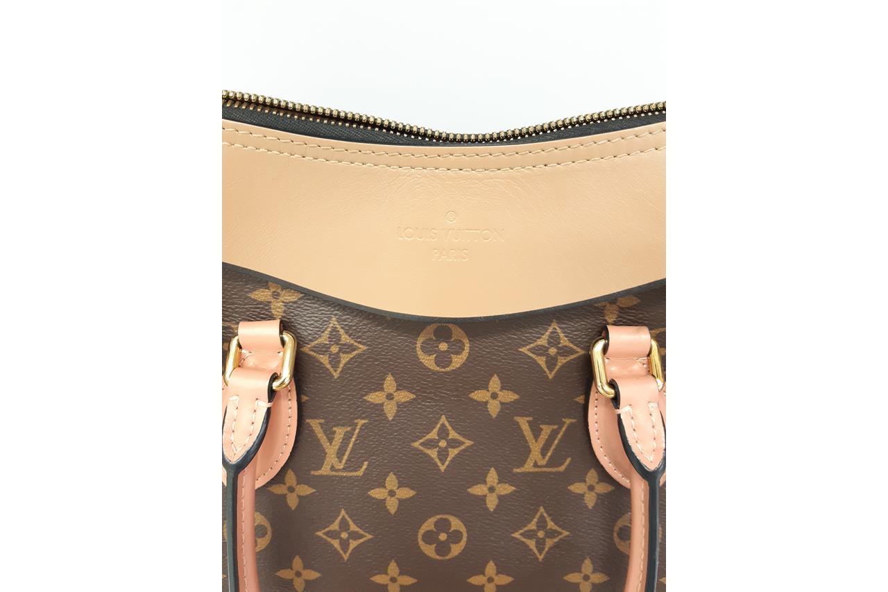 Louis Vuitton Tuileries bag in Monogram coated canvas and tri-colour cowhide leather. Featuring gold-toned hardware, pink leather top handles, an exterior pocket with 2-way zip closure at front. The top zippers open to a beige microfiber interior with patch pockets. Approximate dimensions: 34.5cm(W) x 21.5cm(H) x 14cm(D), 12.5cm handle drop and 30cm removable strap drop. Accompanied by LV dust bag and box. With Entrupy Certificate of Authenticity. (Pre-owned)