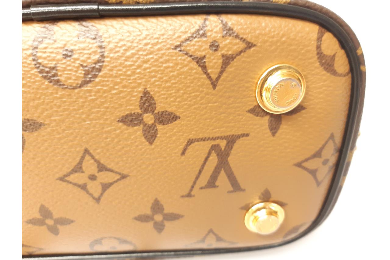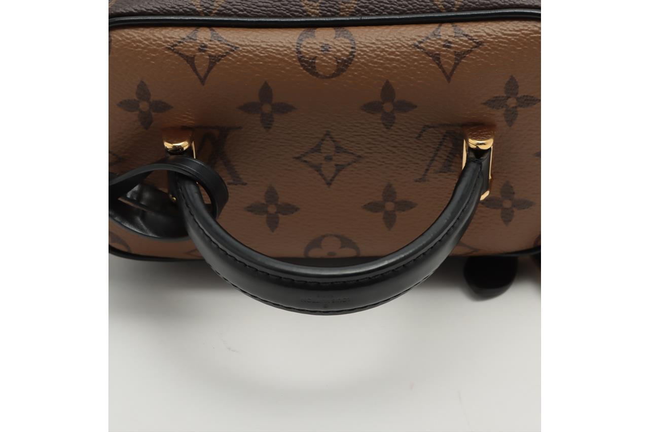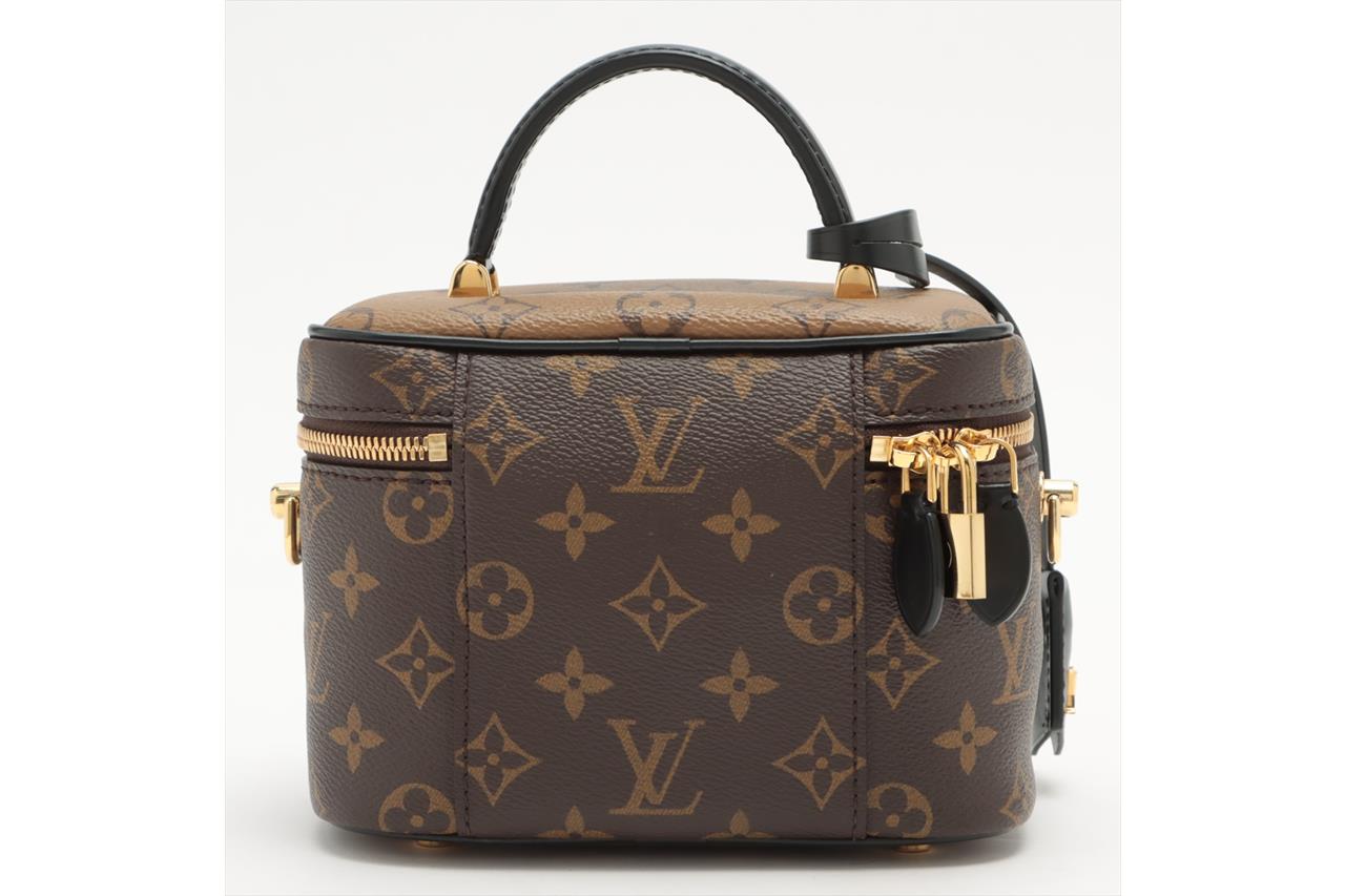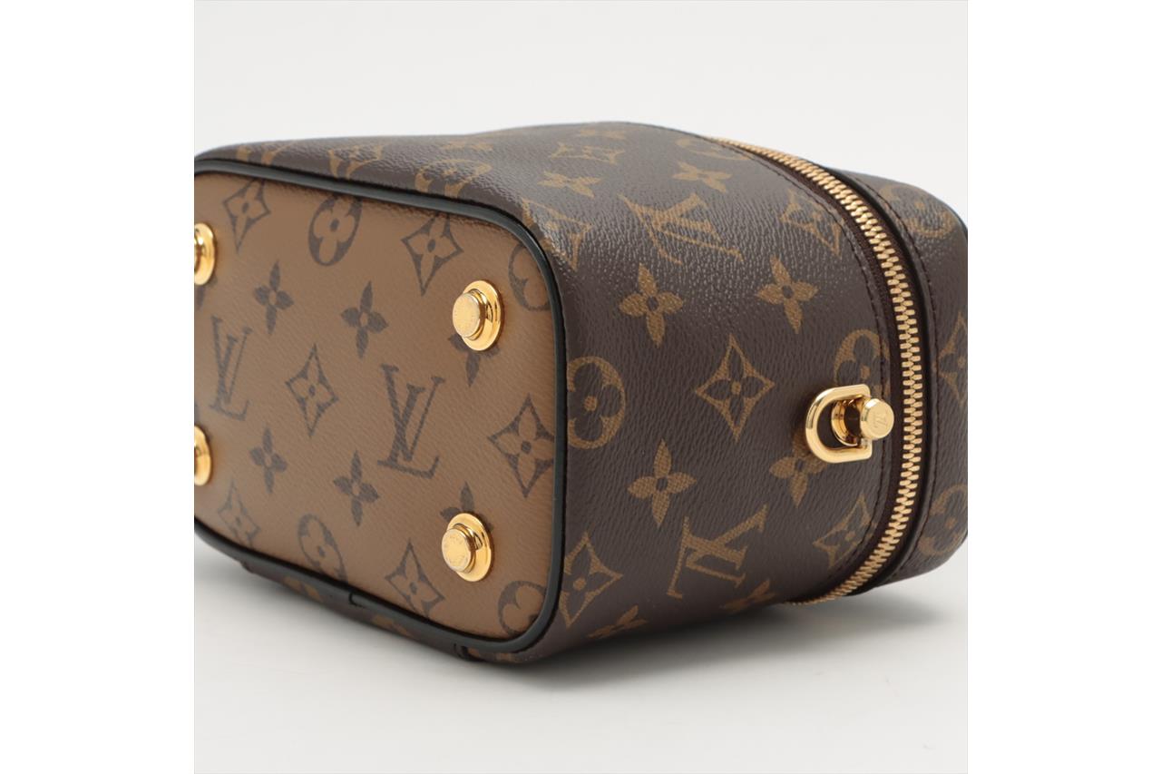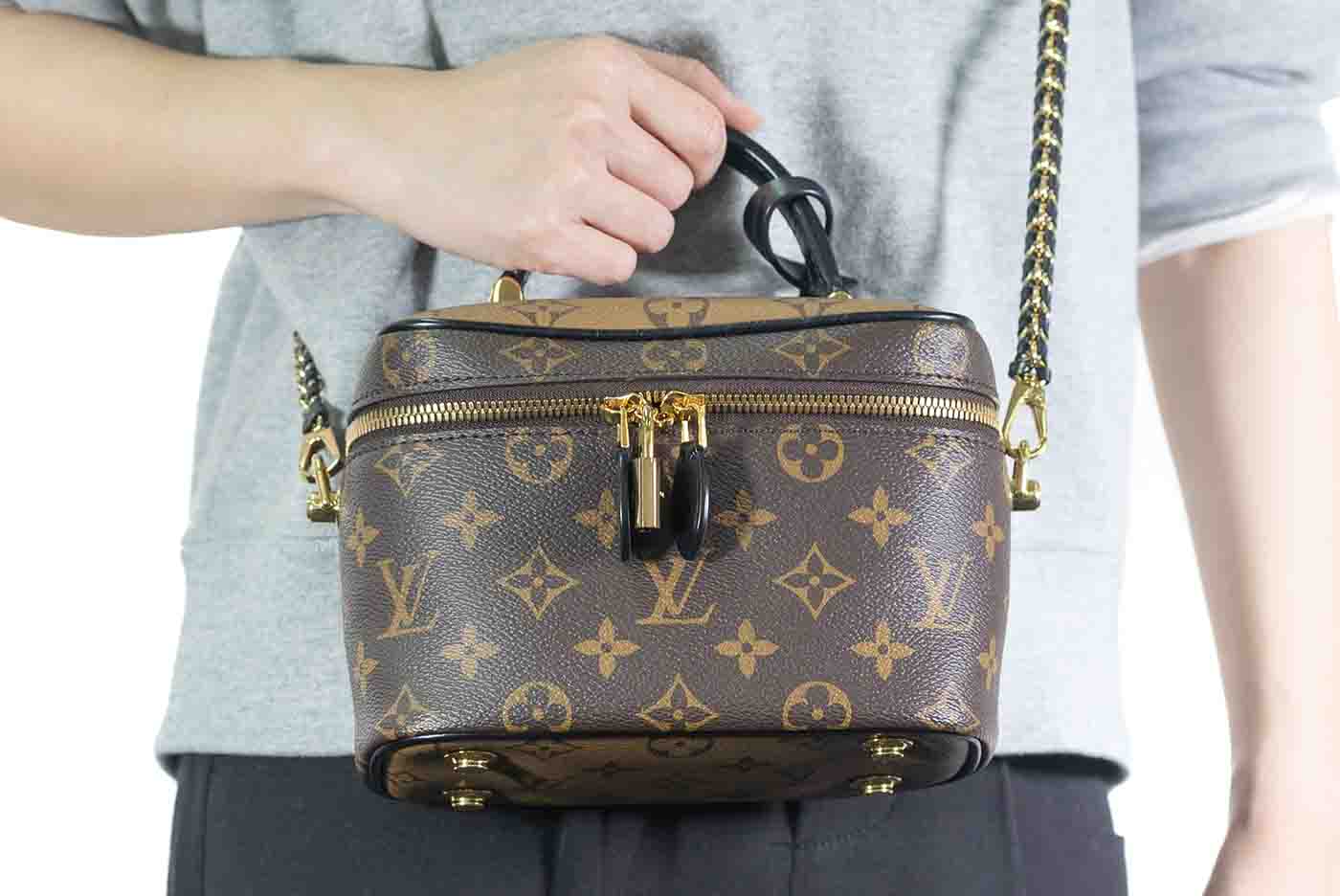 Louis Vuitton Vanity PM in Monogram and Monogram Reverse coated canvas, calfskin-leather trim, gold-tone hardware. Black microfiber lining interior with single patch pocket, double zip closure with padlock. Approximate dimensions: 19cm(L) x 13cm(H) x 11cm(D), 6cm handle height, 45cm detachable chain drop. Accompanied by Louis Vuitton key bell, padlock and dust bag. With Entrupy Certificate of Authenticity. (Pre-owned)