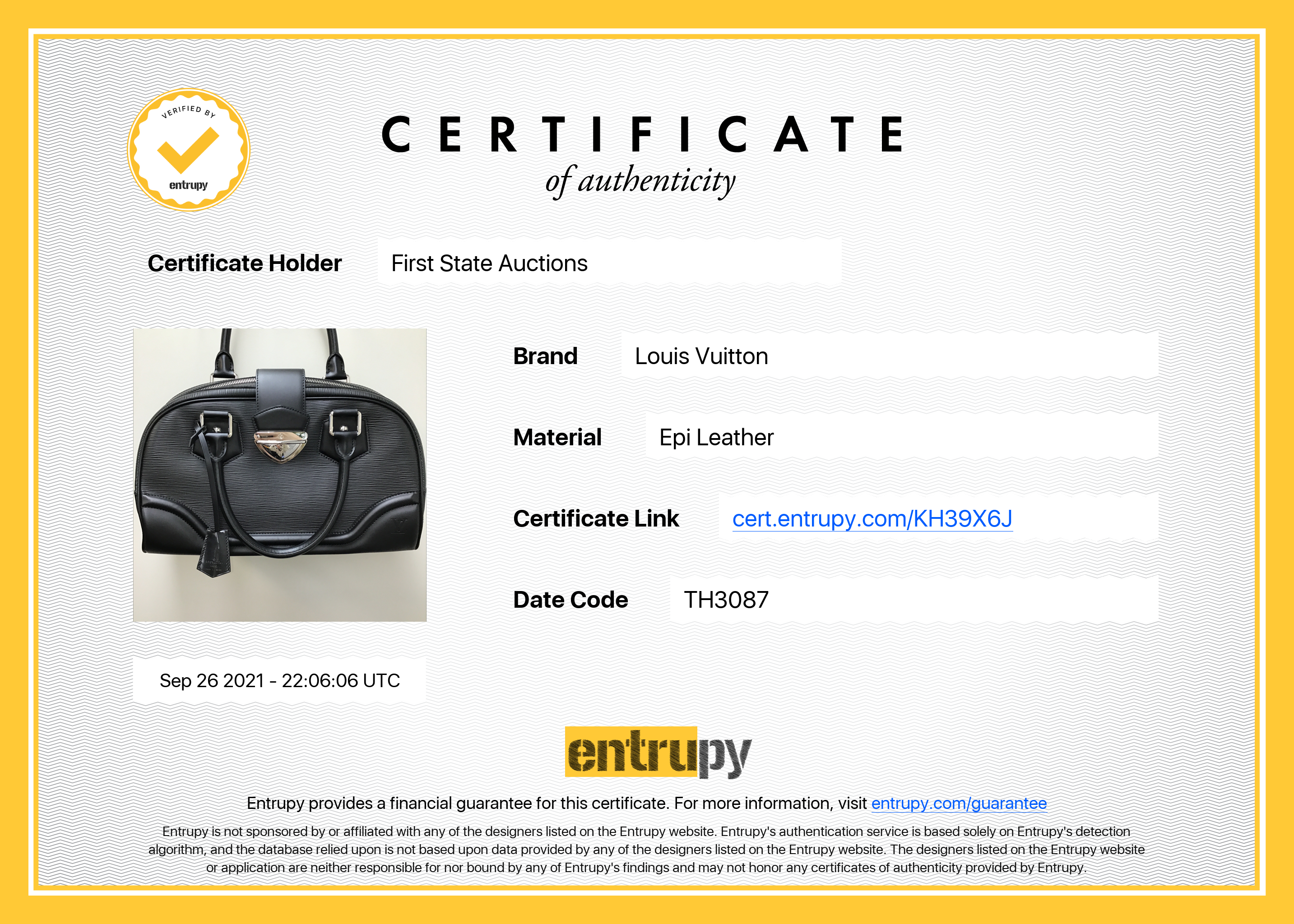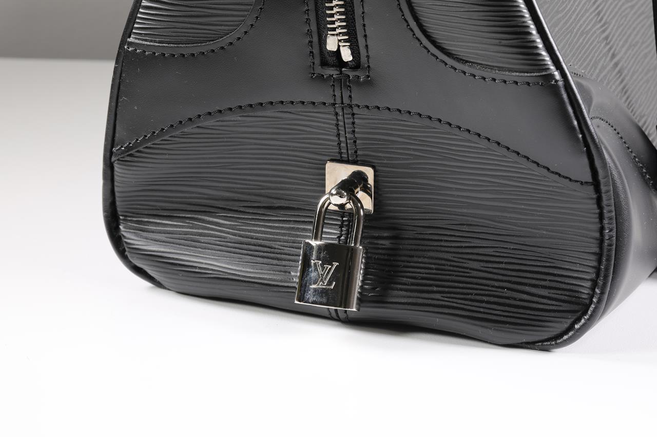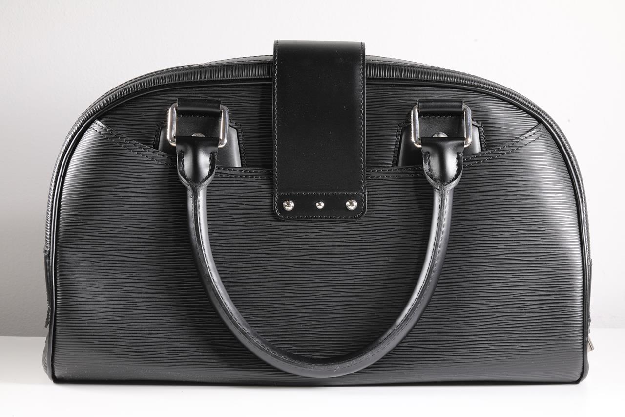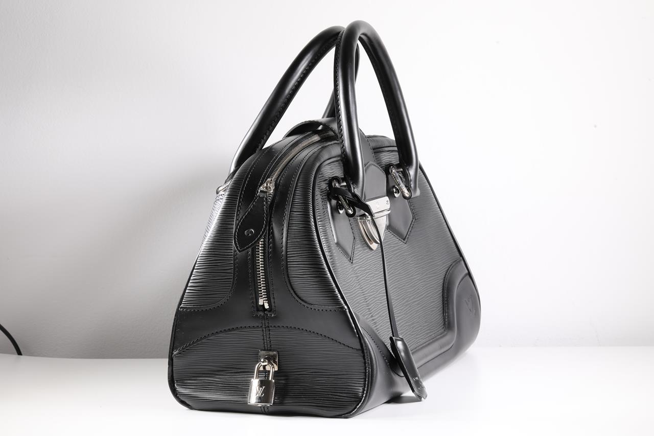 Louis Vuitton Montaigne Bowling Epi Black Leather GM Bag. Duel-rolled leather handles with single zip closure. Silver-tone hardware. Approximate dimensions: 22cm (H) x 36cm (L) x 17cm (D) and 17cm handle drop. Made in France. With Louis Vuitton dust bag and Entrupy Certificate of Authenticity. (Pre-owned)