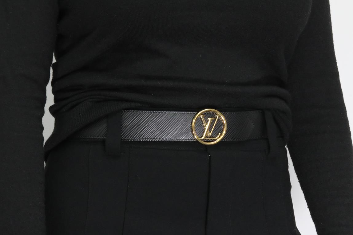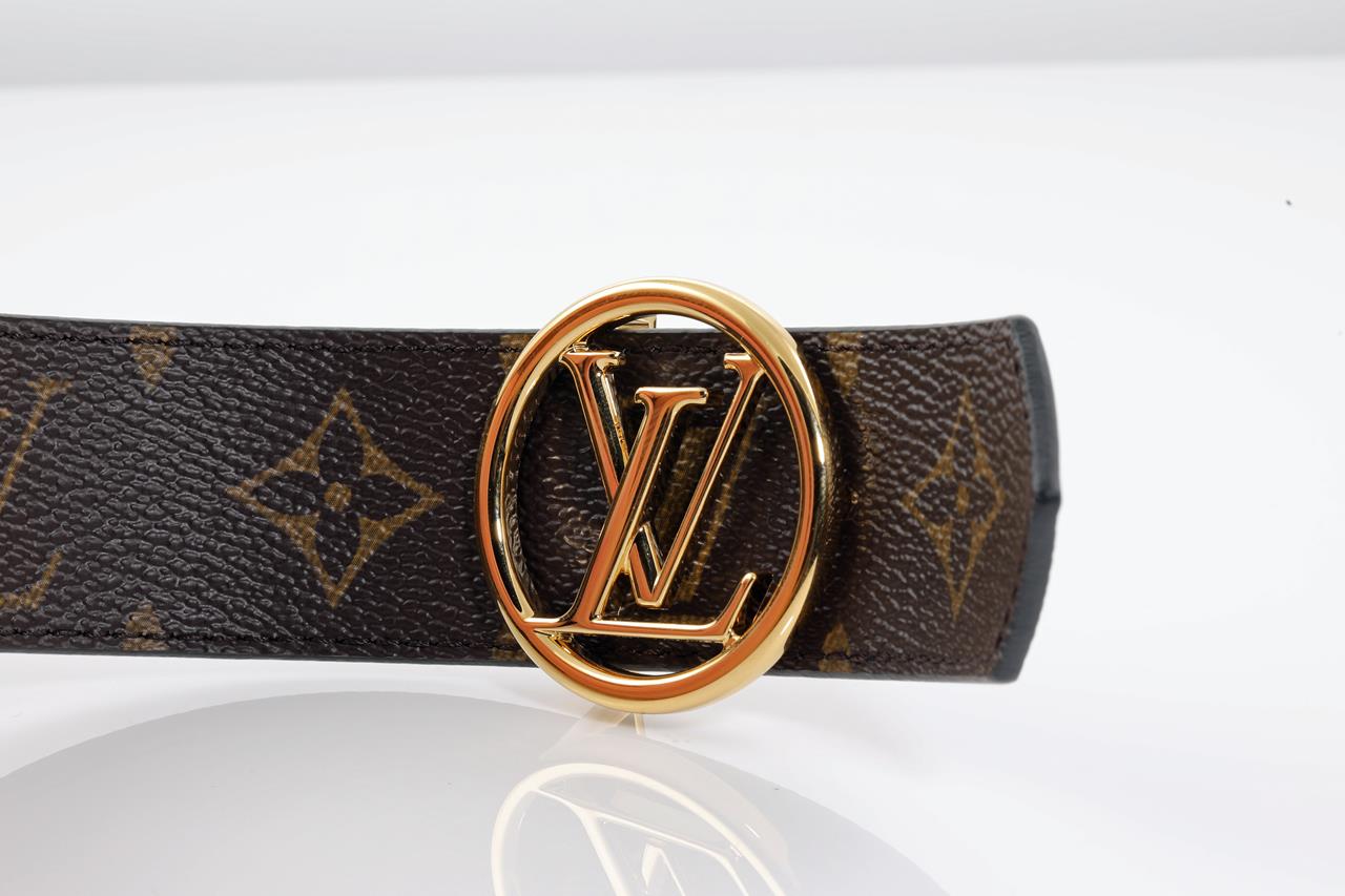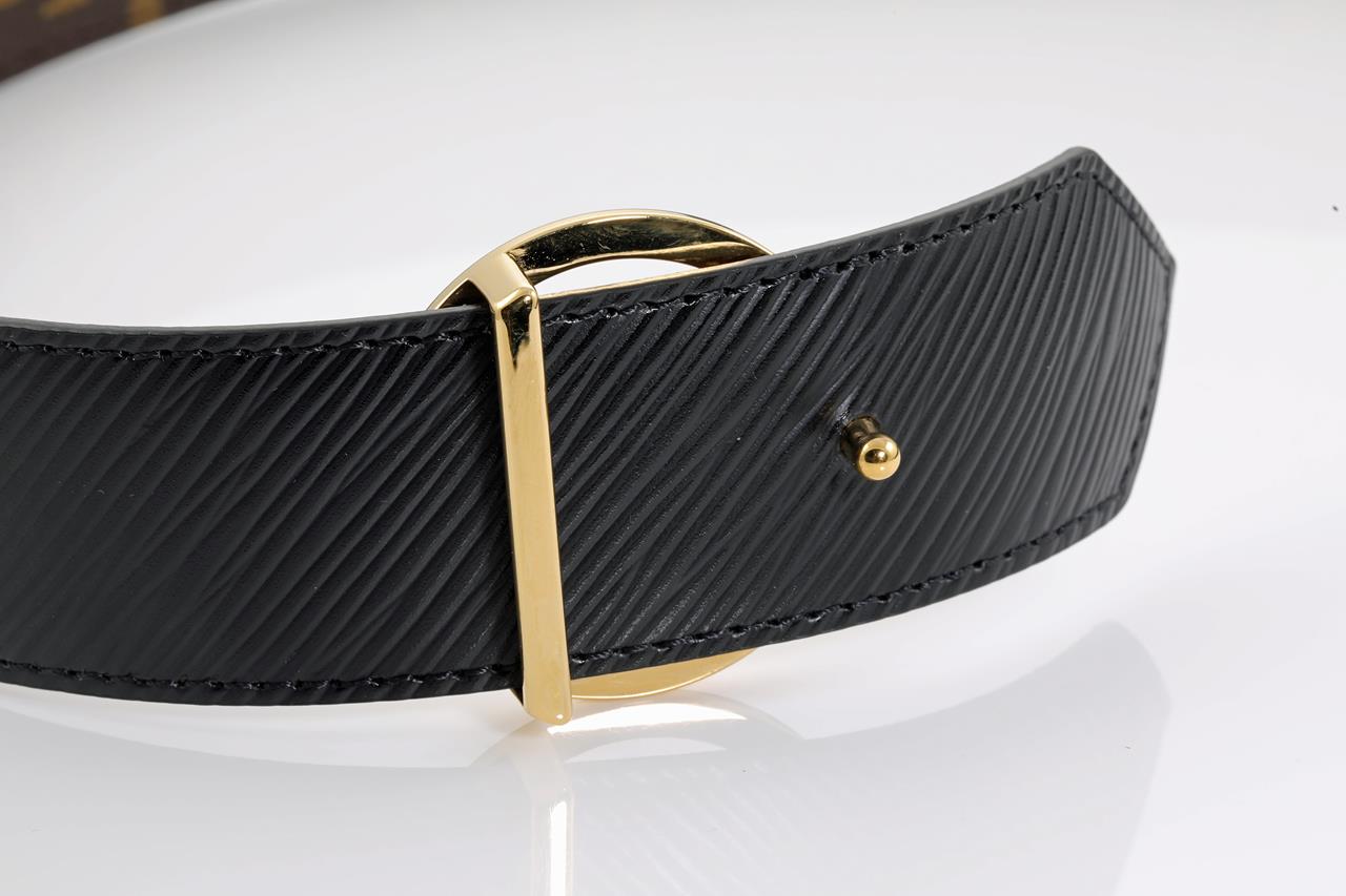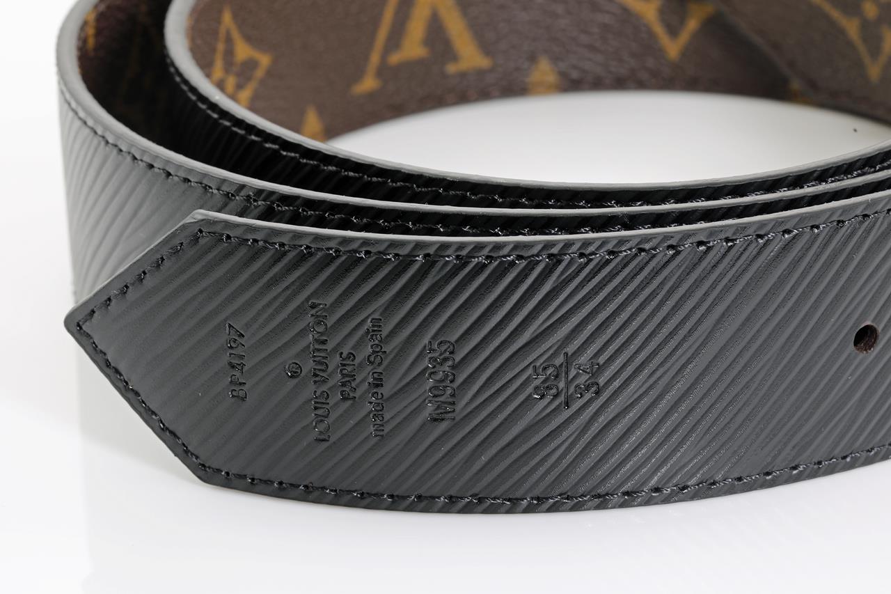 Louis Vuitton 35mm reversible belt with classic LV brass buckle with gold finishing. Epi leather and monogram canvas. Dimensions: 85 x 35cm. With copy of Louis Vuitton receipt and louis Vuitton box. (As New)