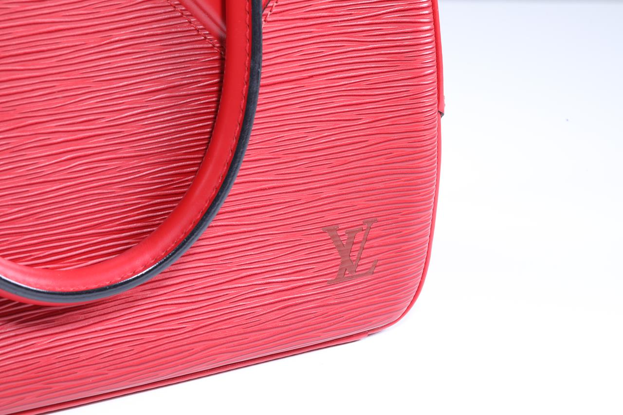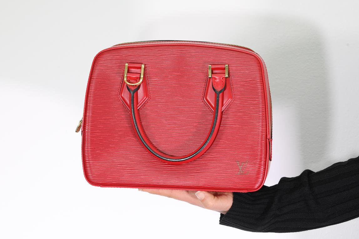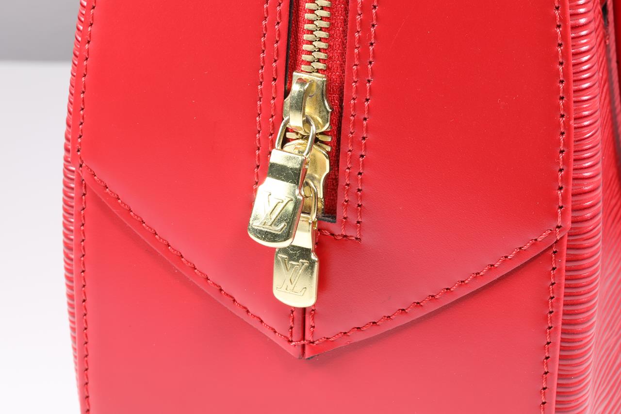 Louis Vuitton Sablons red epi leather handbag. Gold tone hardware. Hand Drop: 12cm. Dimensions: 26 x 21 x 11cm. Made in France. With Louis Vuitton dustbag. With Entrupy Certificate of Authenticity. (Pre-owned)