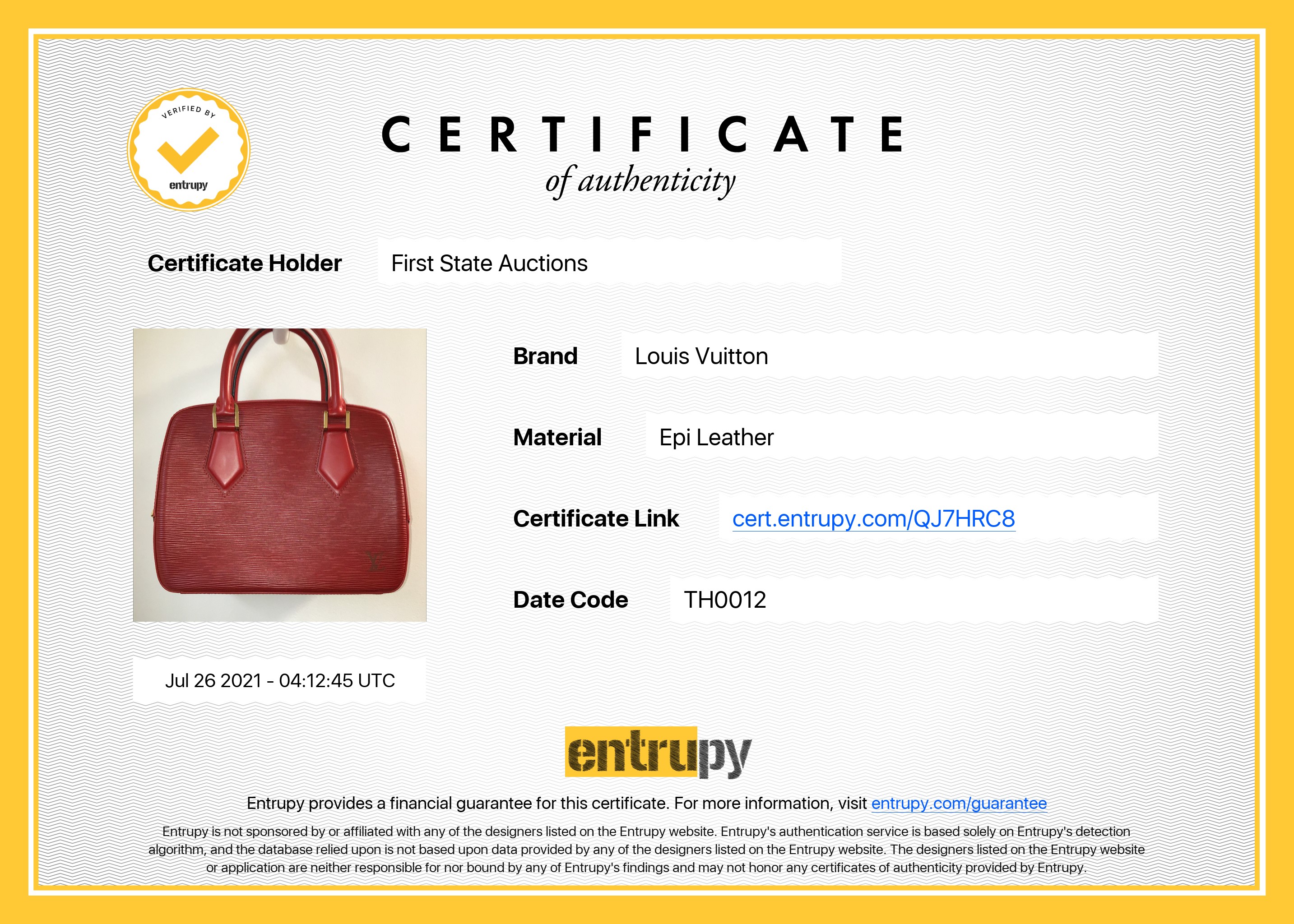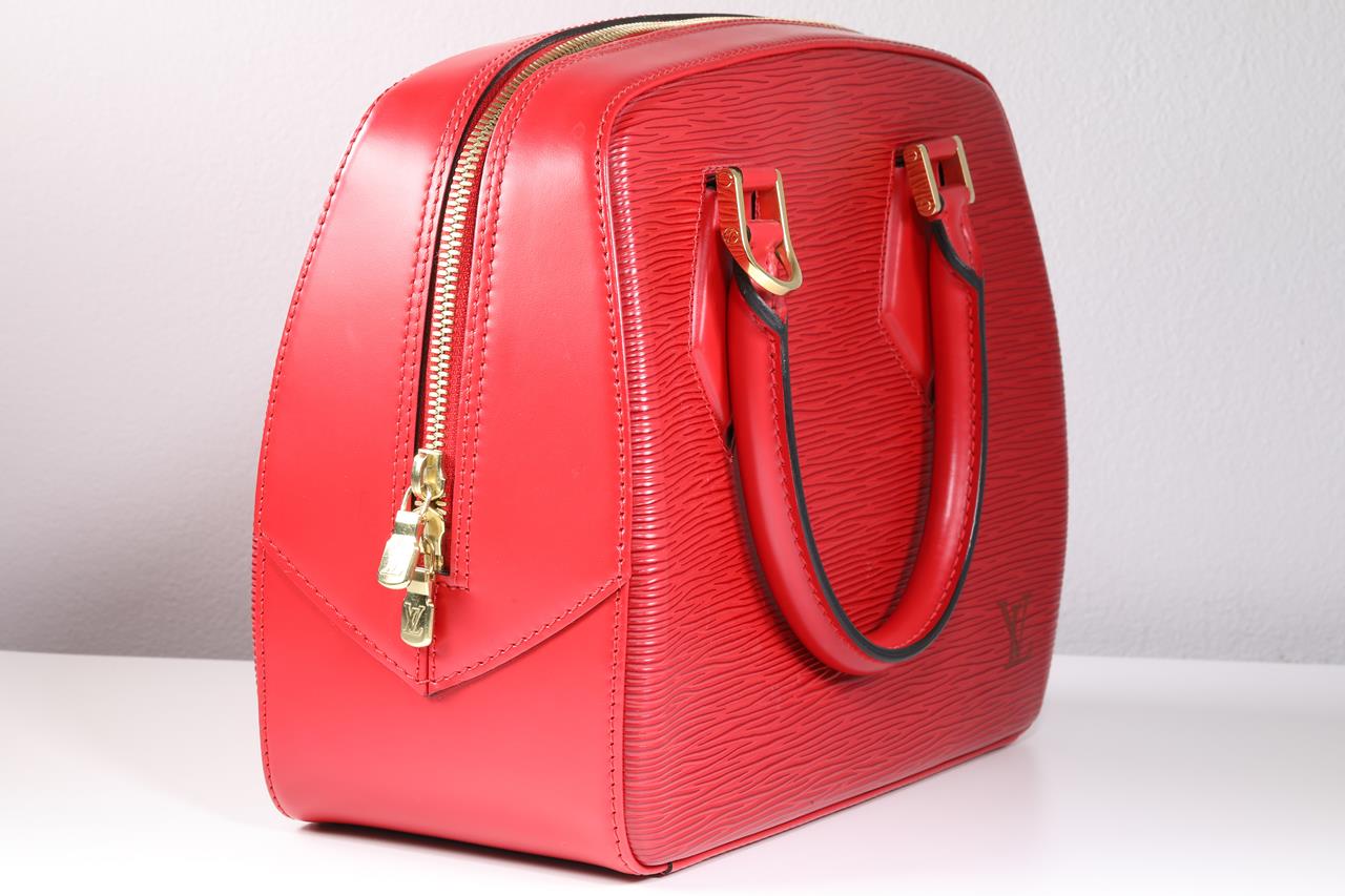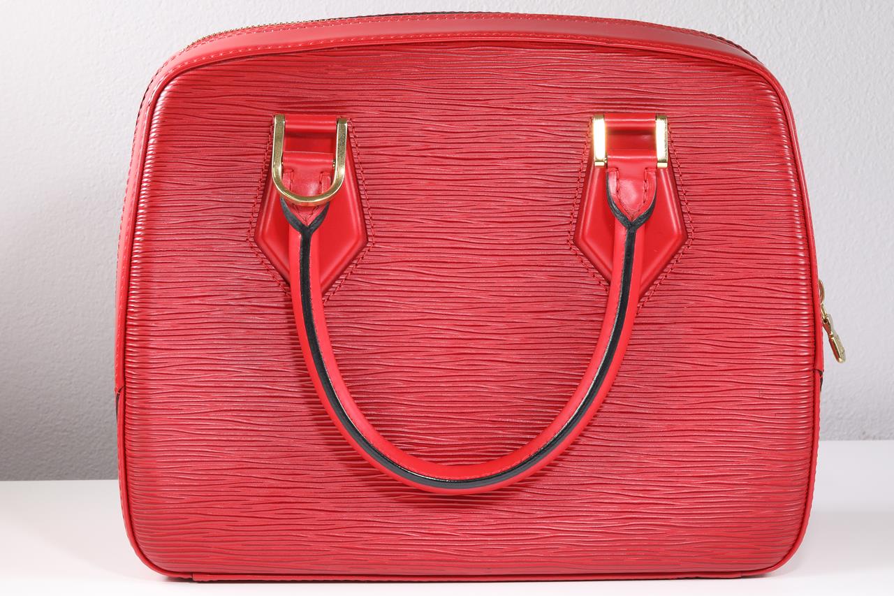 Louis Vuitton Sablons red epi leather handbag. Gold tone hardware. Hand Drop: 12cm. Dimensions: 26 x 21 x 11cm. Made in France. With Louis Vuitton dustbag. With Entrupy Certificate of Authenticity. (Pre-owned)