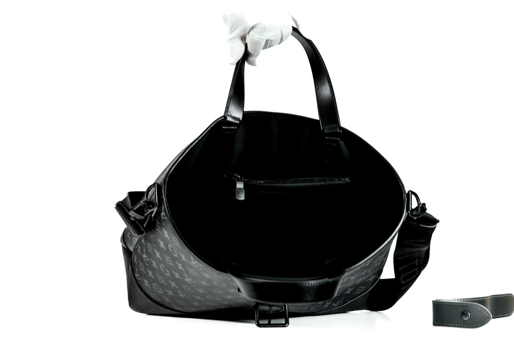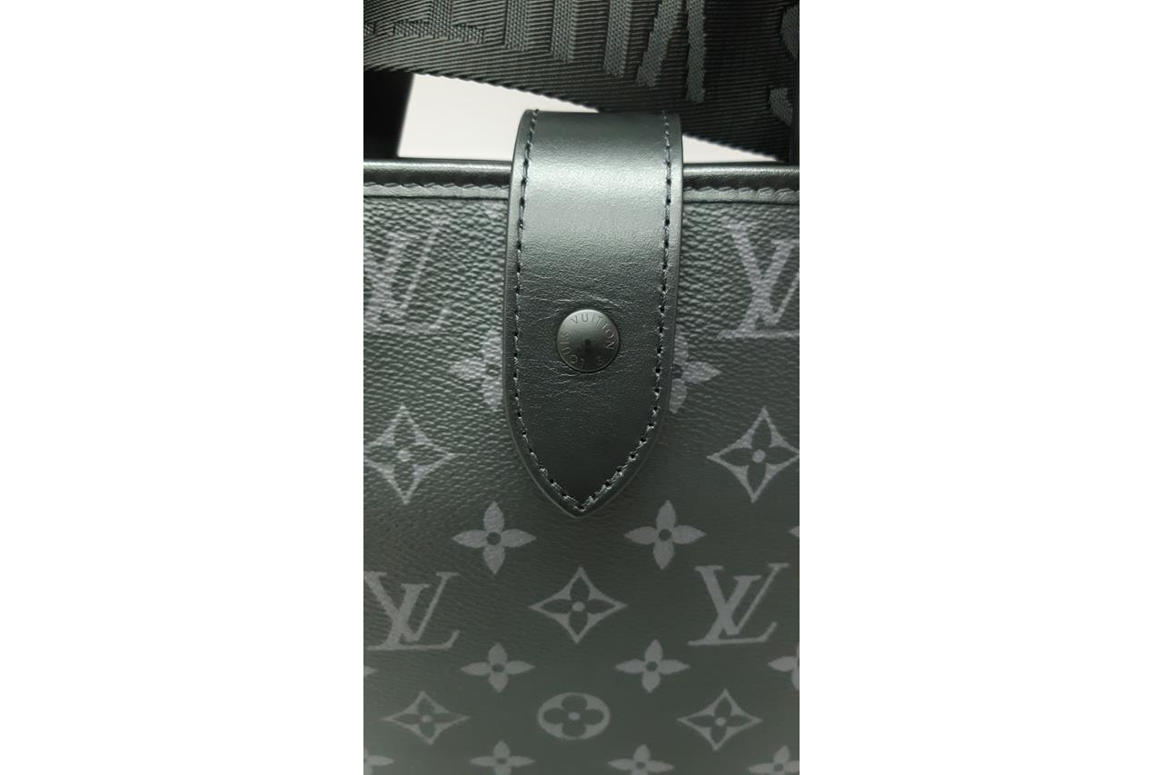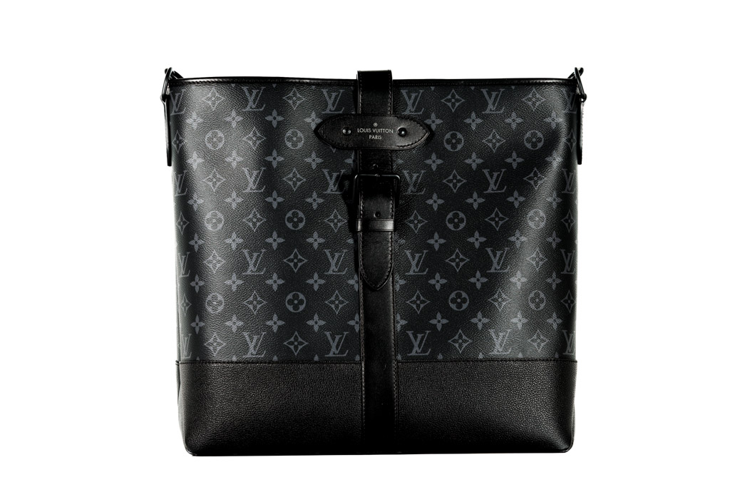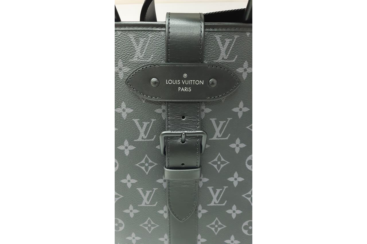 Louis Vuitton Saumur Tote Bag. Featuring black and grey monogram canvas and black leather trim, black-toned hardware, black textile lining, and belt with snap button closure on top. Approximate dimensions: 38cm (W) x 37cm (H) *13cm (D), 13cm handle drop height, and 50cm adjustable and detachable shoulder strap. Accompanied by Louis Vuitton dust bag and box. With Entrupy Certificate of Authenticity. (Pre-owned)