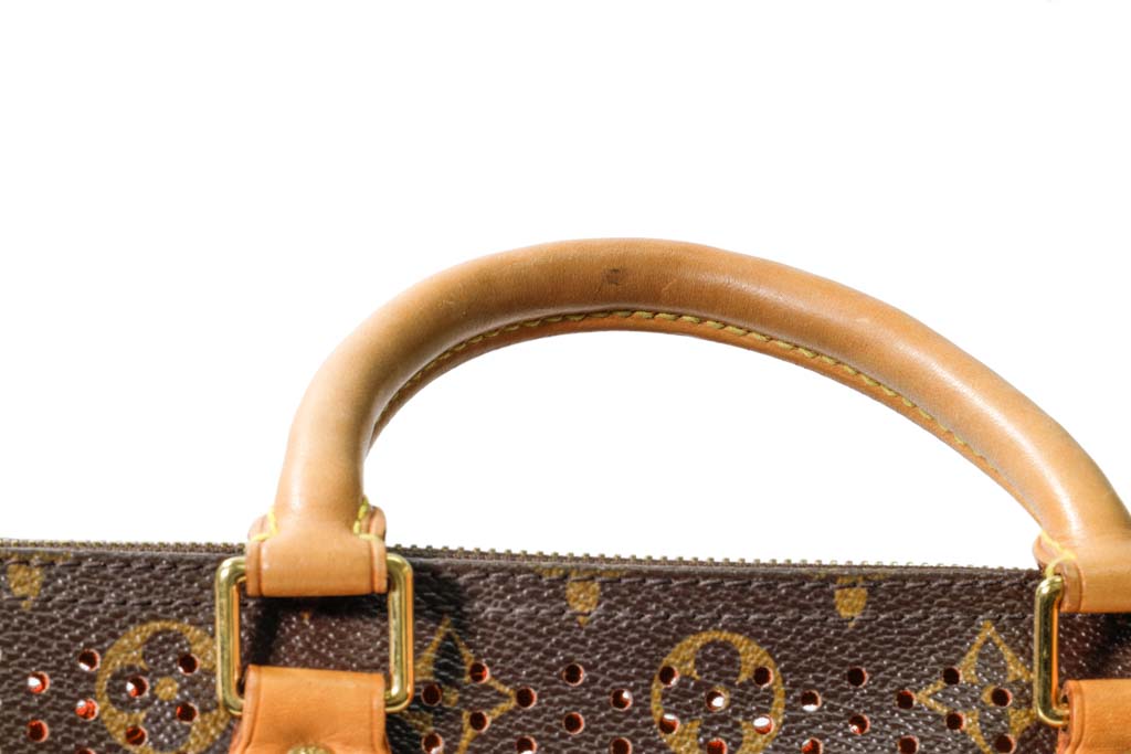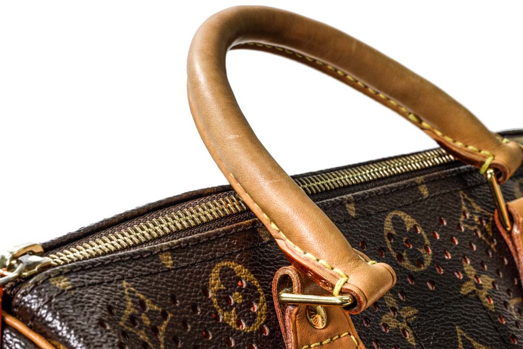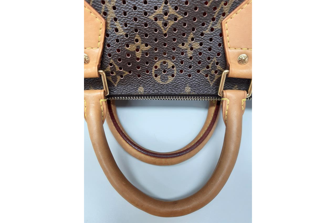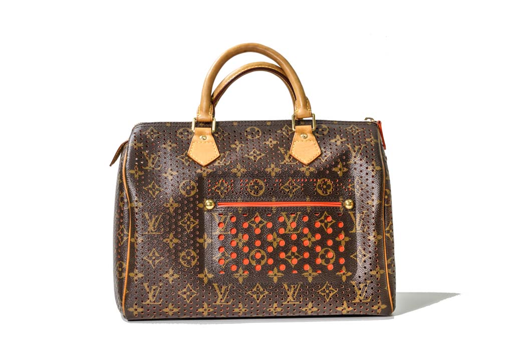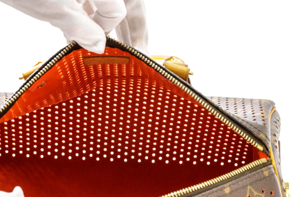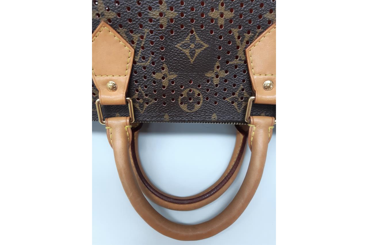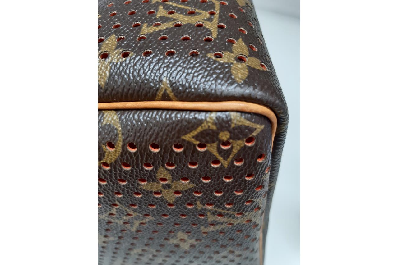 Louis Vuitton Speedy 30 Tote Bag. Circa: 2006. Featuring the Louis Vuitton signature Monogram canvas, perforated design, orange suede-lined interior, gold-tone hardware, and top zip closure. Approximate dimensions: 30cm (W) x 25cm (H) x 17.5cm (D), and 11cm handle height. Accompanied by Louis Vuitton padlock, dust bag and box. With Entrupy certificate of authenticity. (Pre-owned)