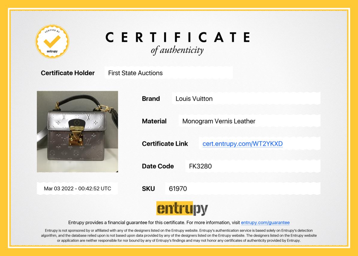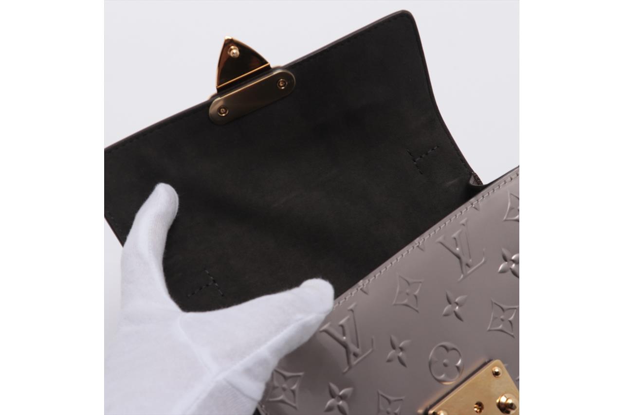 Louis Vuitton Spring Street Vernis Monogram Bitume Metallise PM. Gold-tone hardware. Approximate dimensions: 19cm (L) x 16cm (H) x 8.5cm (D), 9cm handle height and 51cm strap length. Accompanied by Louis Vuitton papers, dust bag, detachable shoulder strap and luggage tag. With Entrupy Certificate of Authenticity. (Pre-owned)