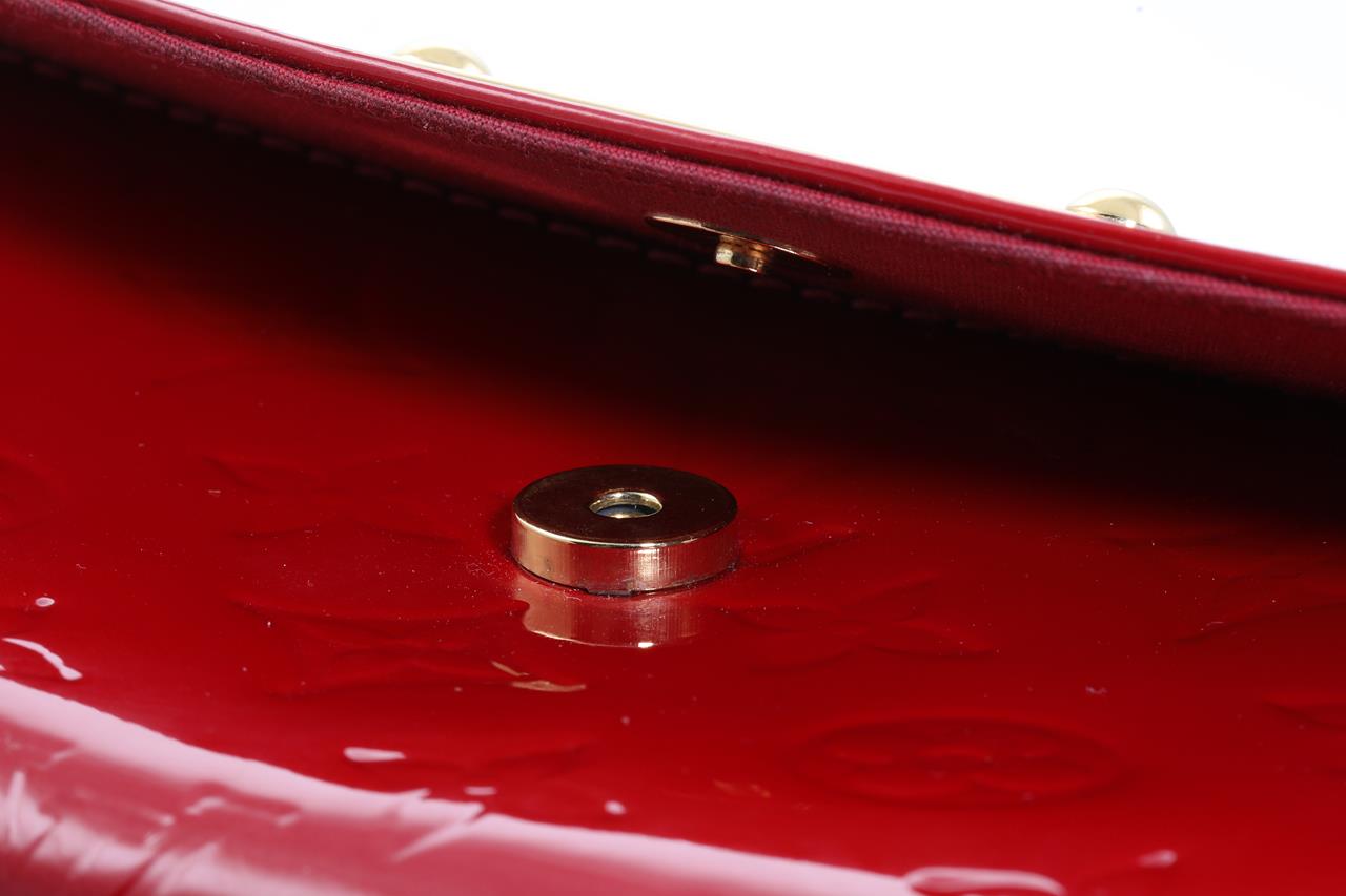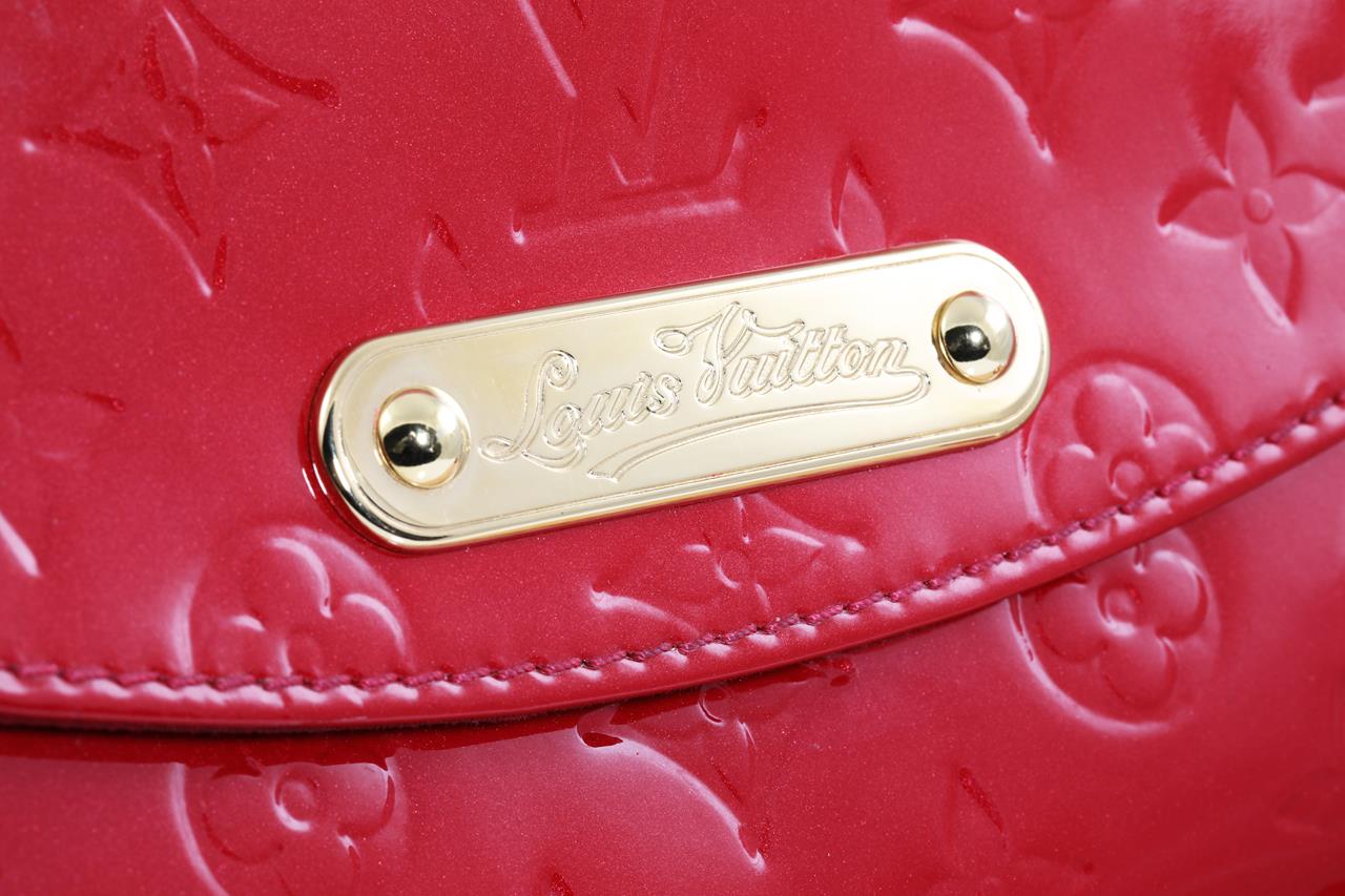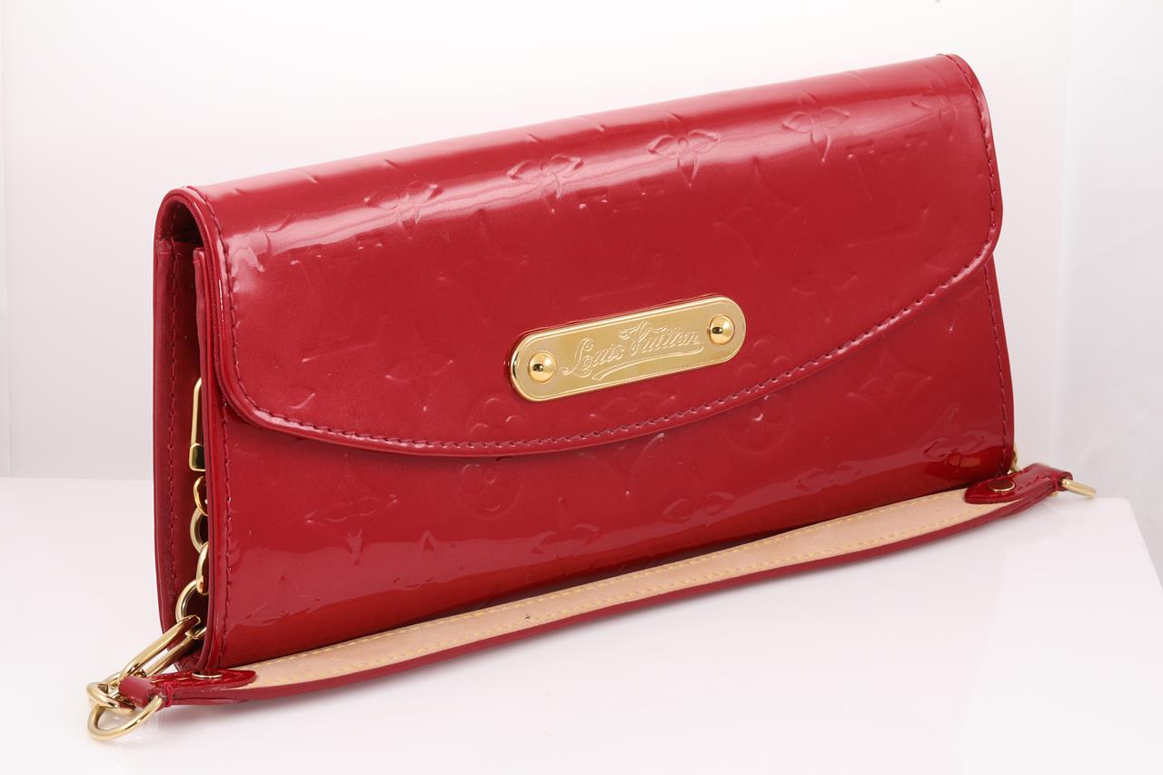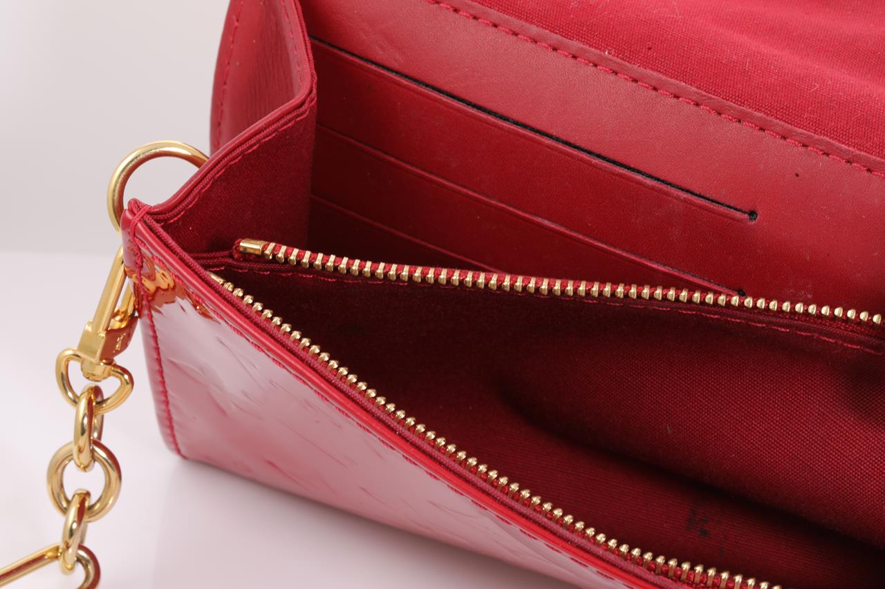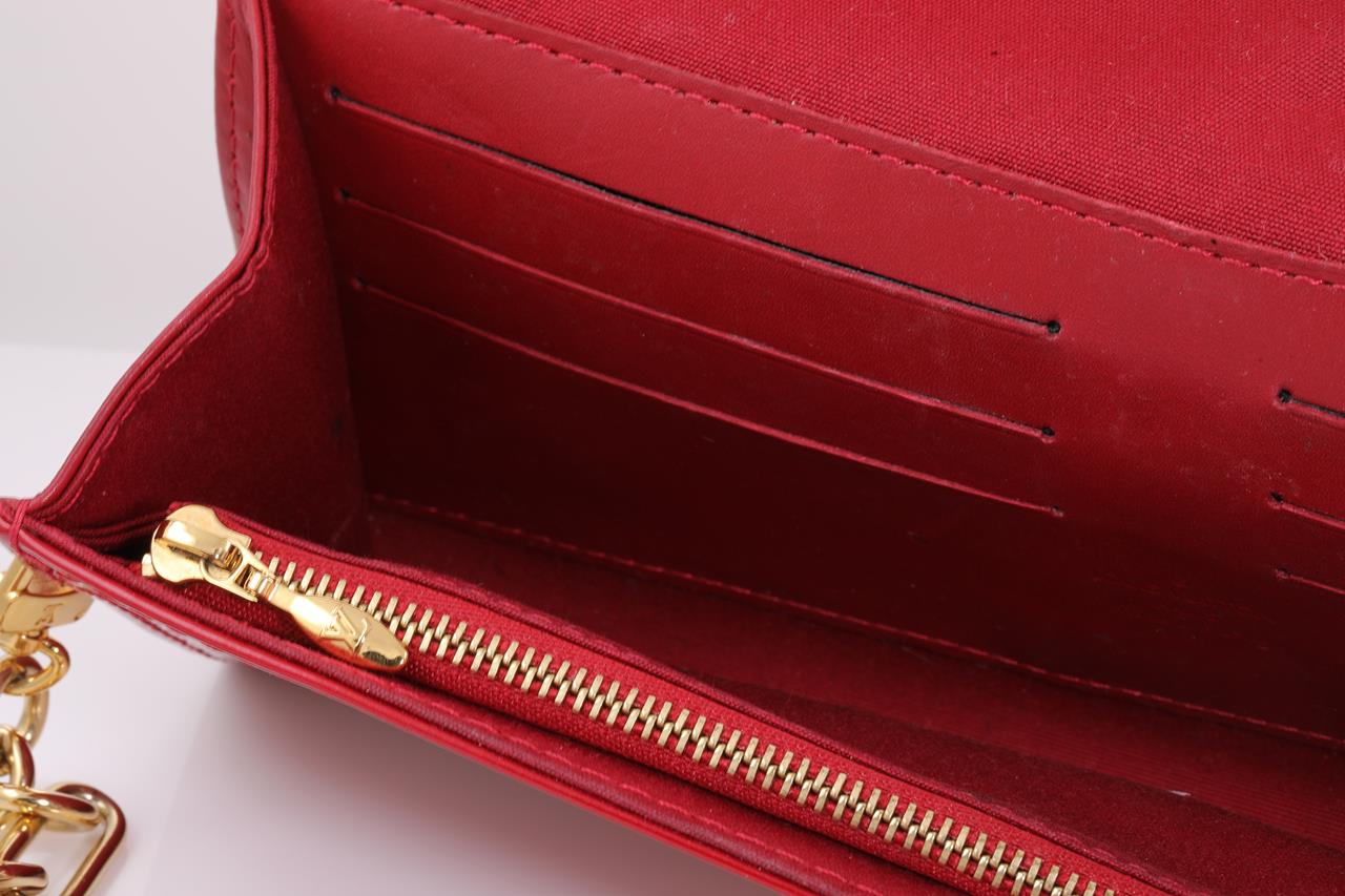 Louis Vuitton Sunset Boulevard 'Pomme d'amour' Pochette, red Vernis leather. Approximate dimensions: 24cm (L) x 12cm (H) x 3.5cm (D). Chain and leather strap. With Entrupy Certificate of Authenticity. Made in France. (Pre-owned)