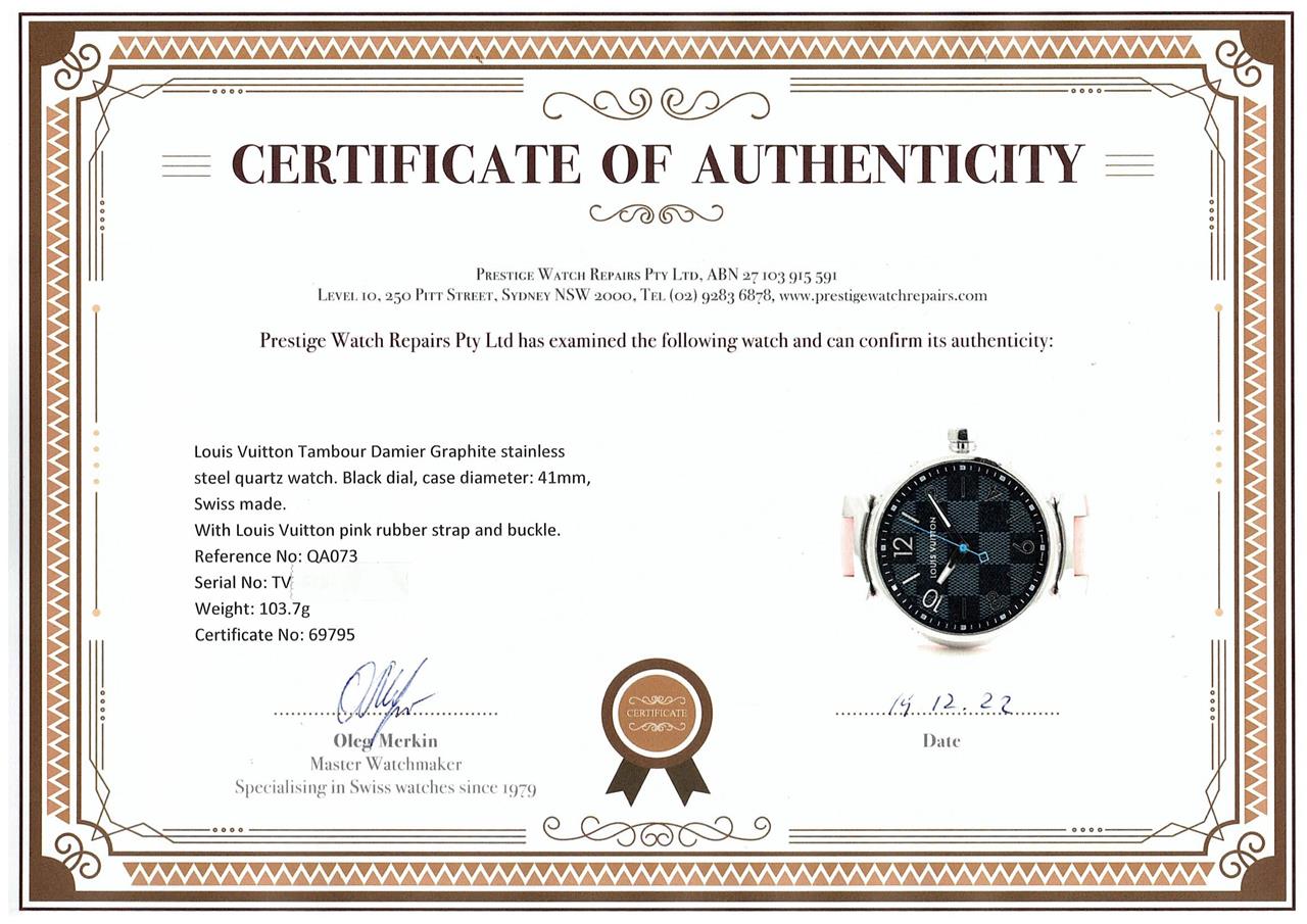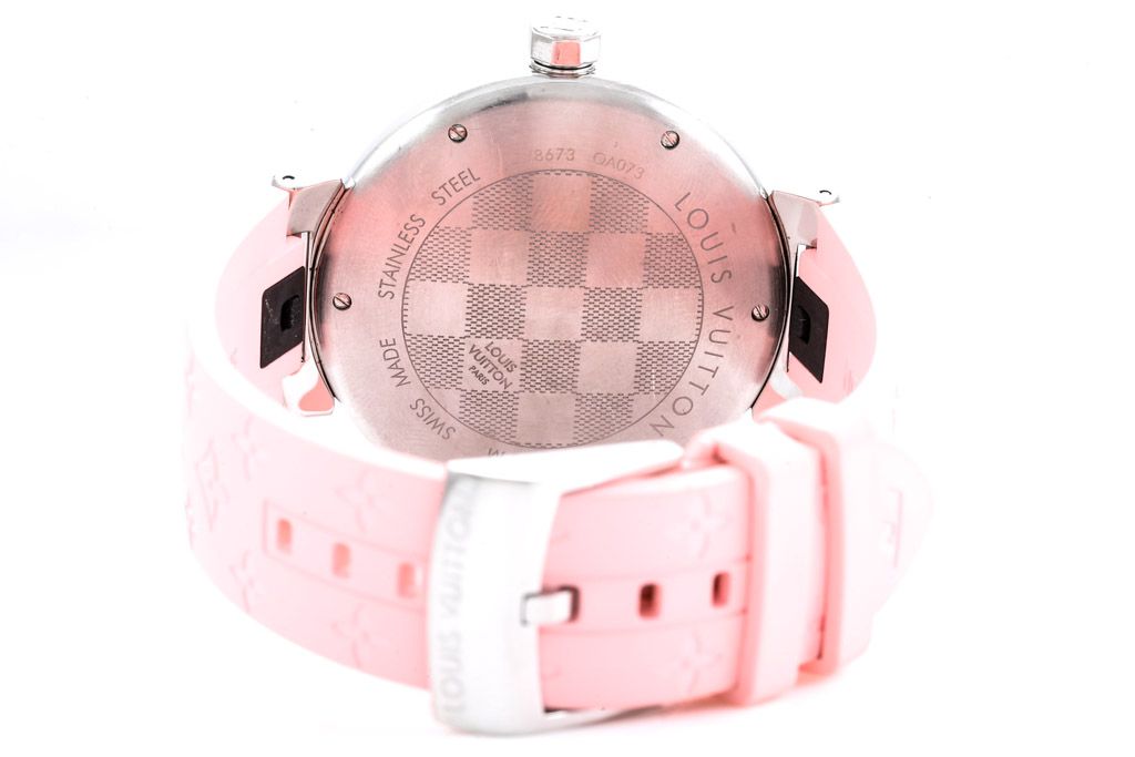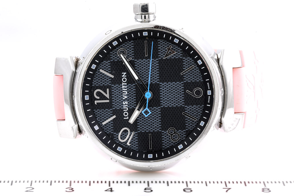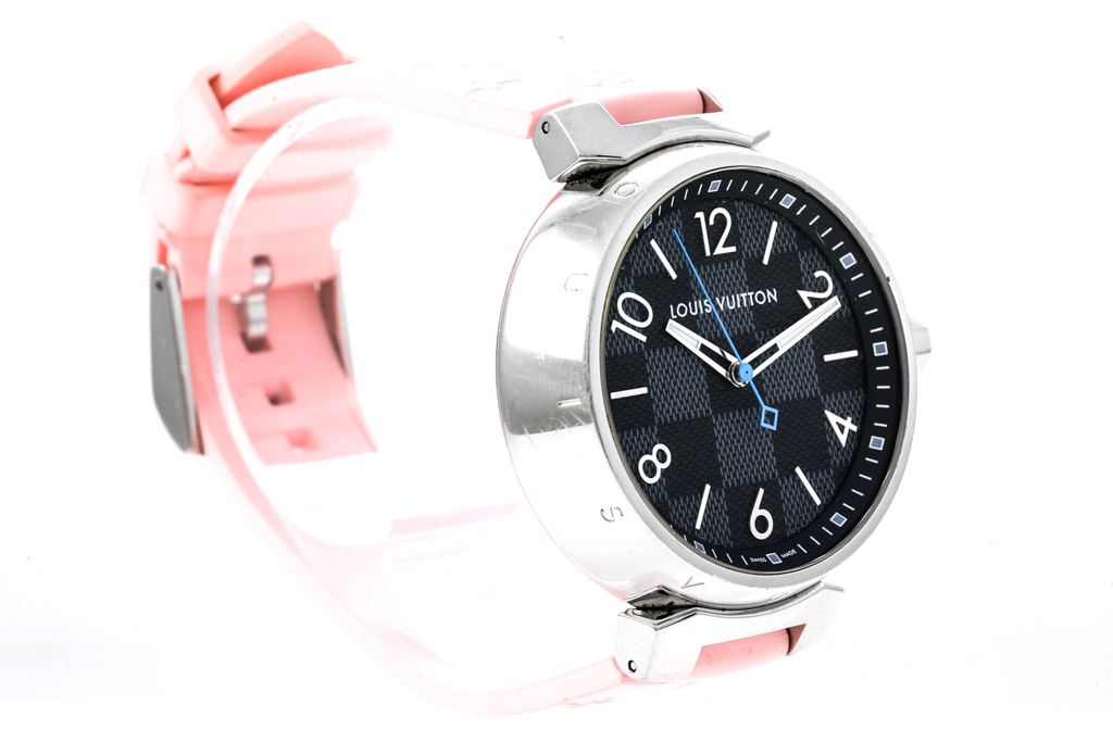 Louis Vuitton Tambour Damier Graphite stainless steel quartz watch. Black dial, case diameter: 41mm, strap length: 20.5cm, Swiss made. Ref# QA073. With Louis Vuitton pink rubber strap and buckle. With Certificate of Authenticity. 3 month FSA warranty. (Pre-owned)