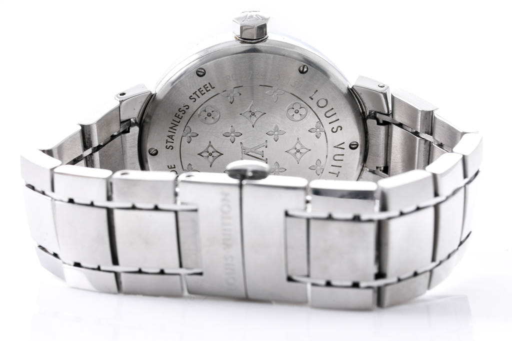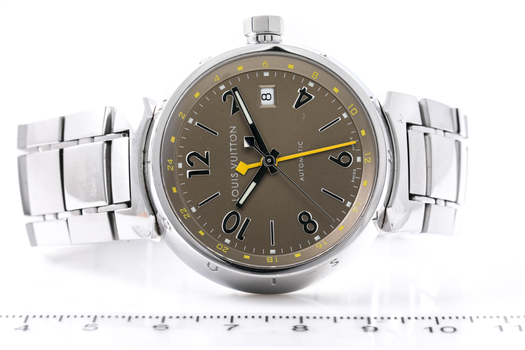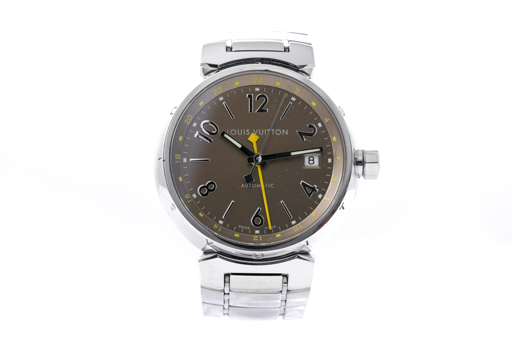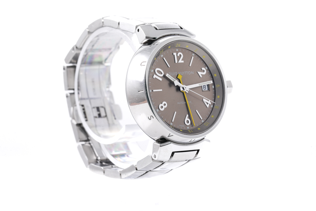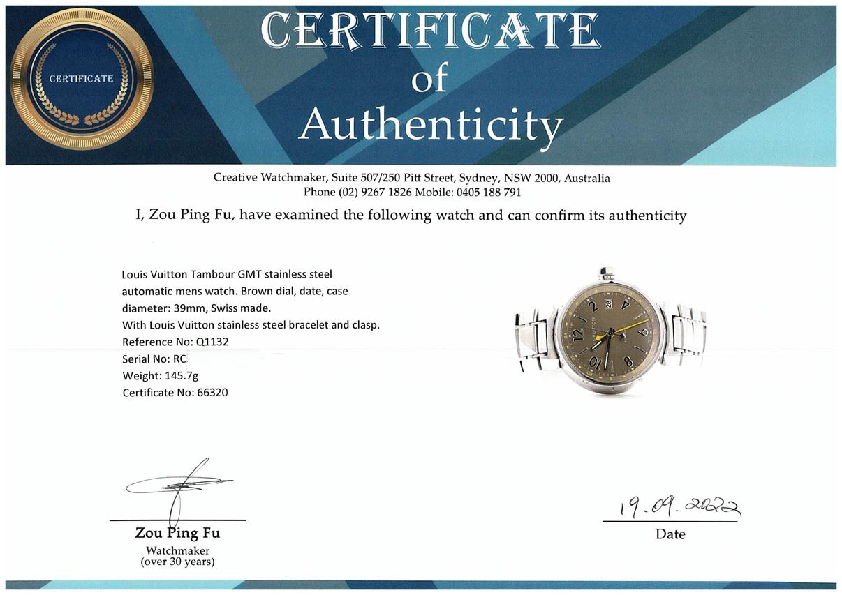 Louis Vuitton Tambour GMT stainless steel automatic mens watch. Brown dial, date, case diameter: 39mm, wrist size: 16cm, Swiss made. Ref# Q1132. With Louis Vuitton stainless steel bracelet and clasp. With Certificate of Authenticity. 3 month FSA warranty. (Pre-owned)