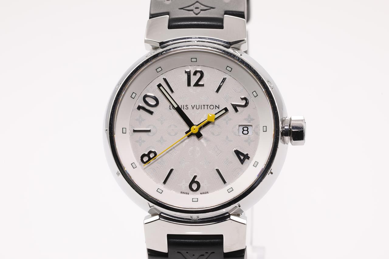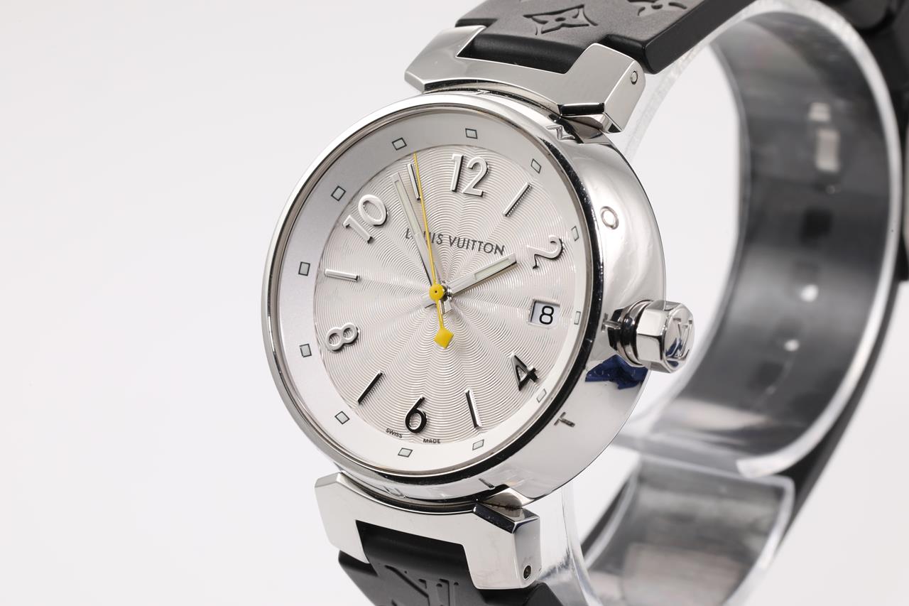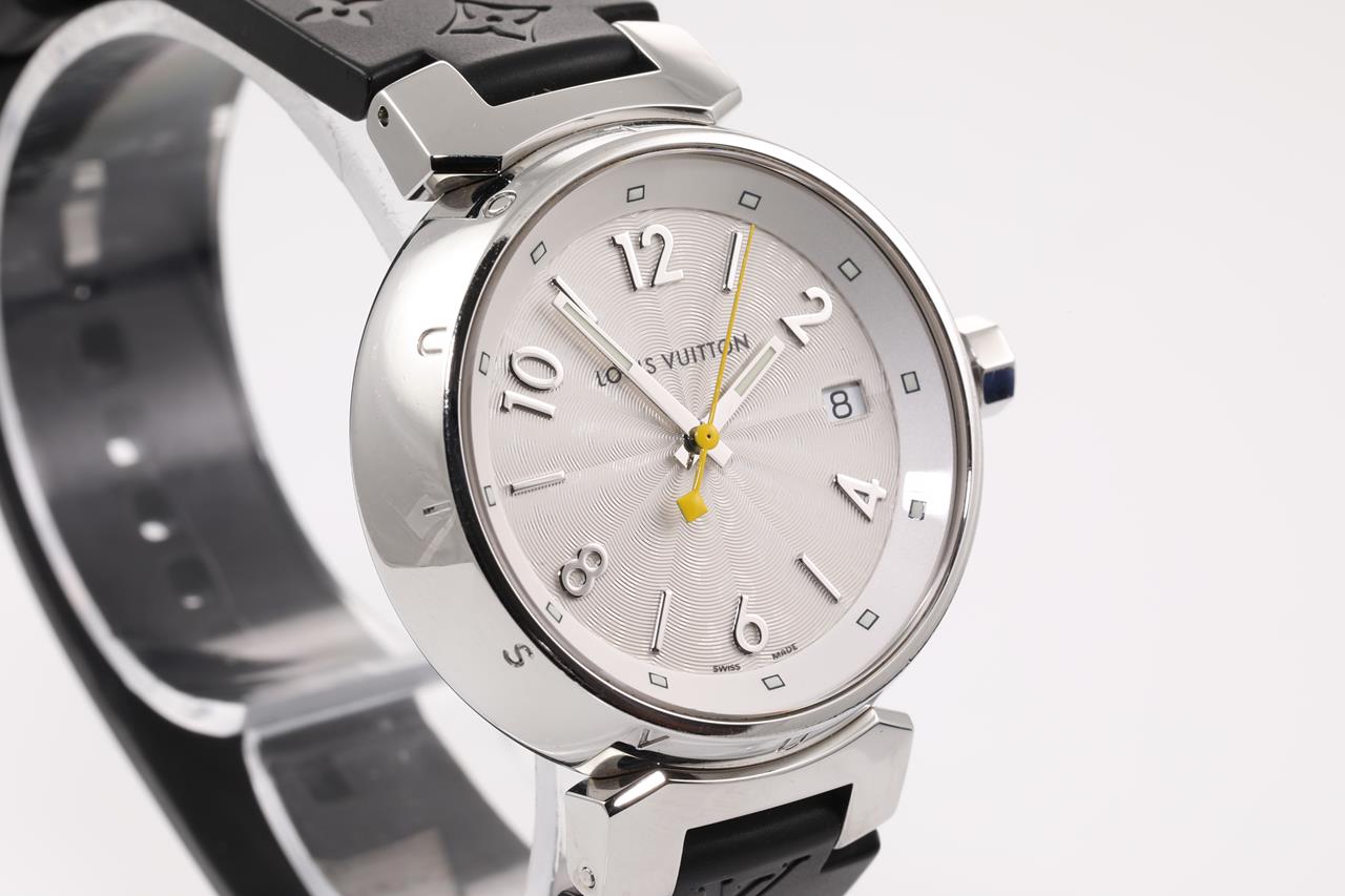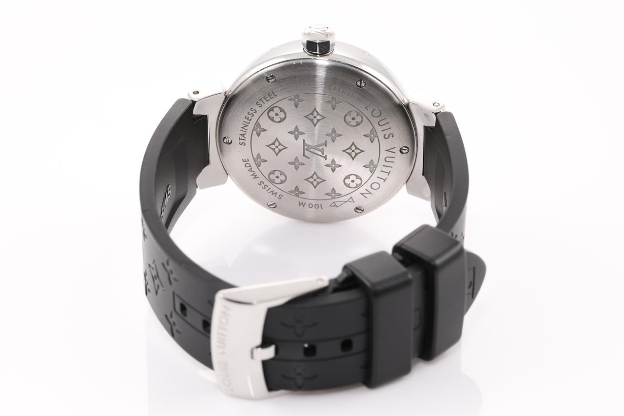 Louis Vuitton Tambour stainless steel quartz ladies watch. Silver hologram dial, date, case diameter: 34mm, length: 18.5cm, Swiss made. Ref# Q1313. With Louis Vuitton black rubber strap and clasp. With Certificate of Authenticity and Louis Vuitton box. 3 month FSA warranty. (Pre-owned)