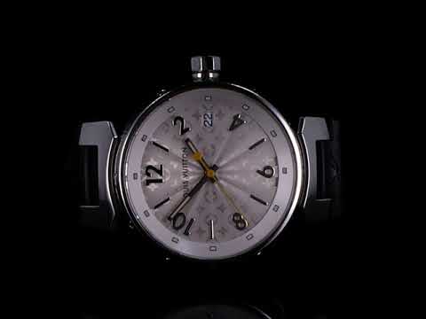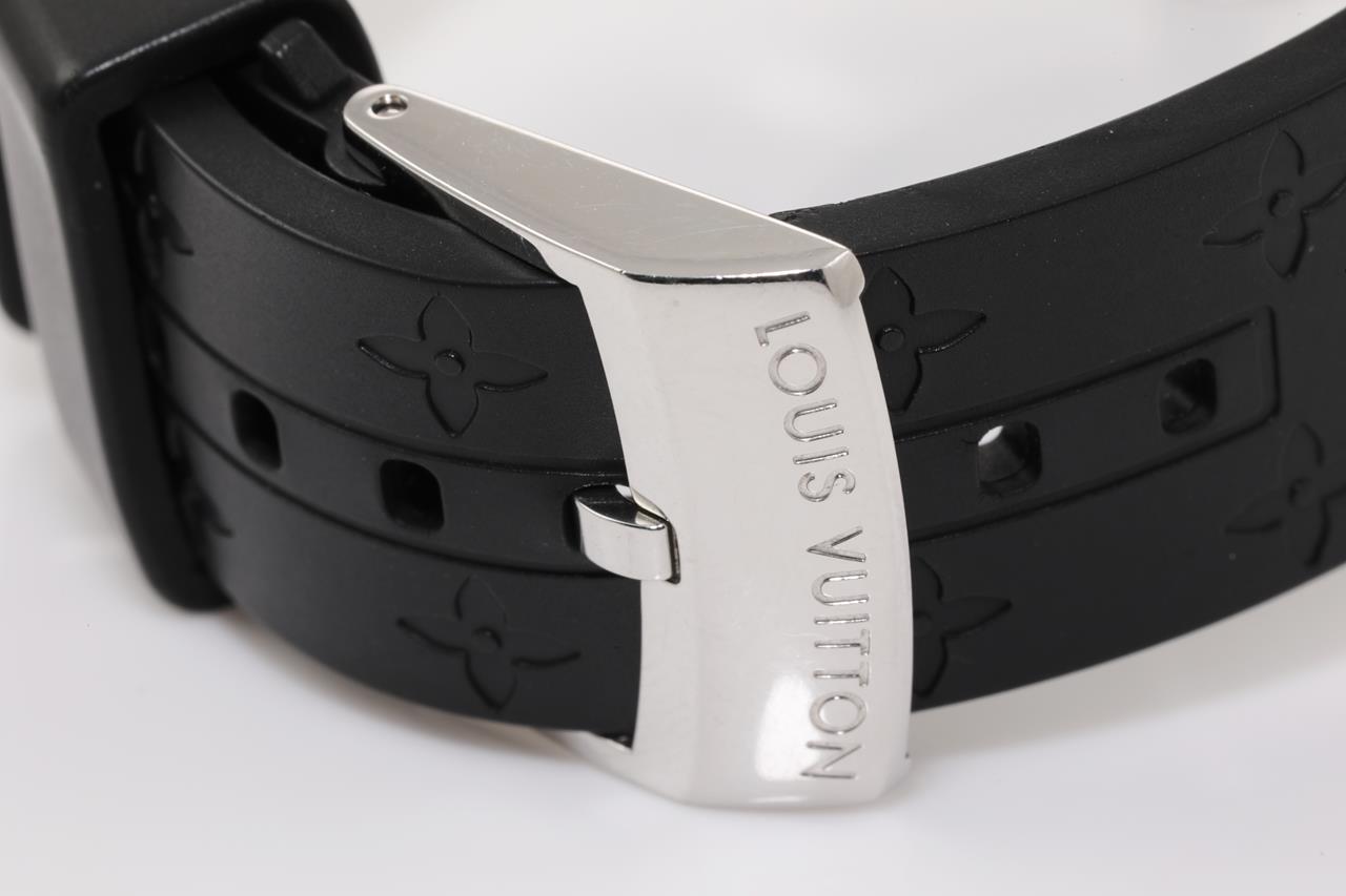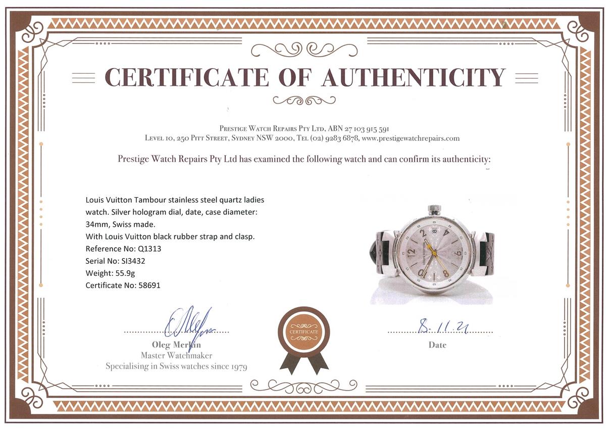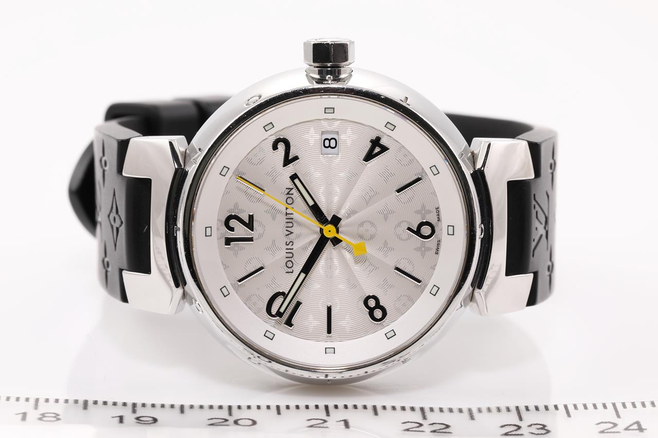 Louis Vuitton Tambour stainless steel quartz ladies watch. Silver hologram dial, date, case diameter: 34mm, length: 18.5cm, Swiss made. Ref# Q1313. With Louis Vuitton black rubber strap and clasp. With Certificate of Authenticity and Louis Vuitton box. 3 month FSA warranty. (Pre-owned)
