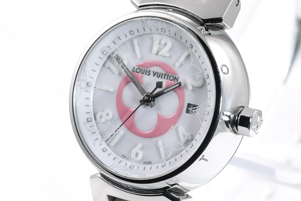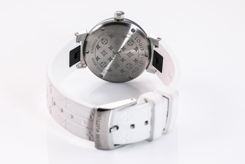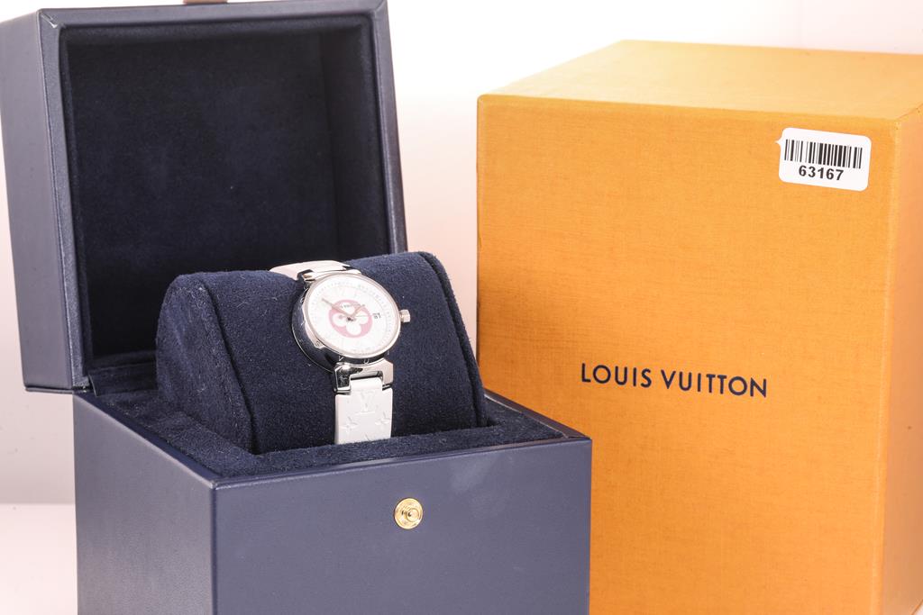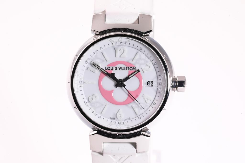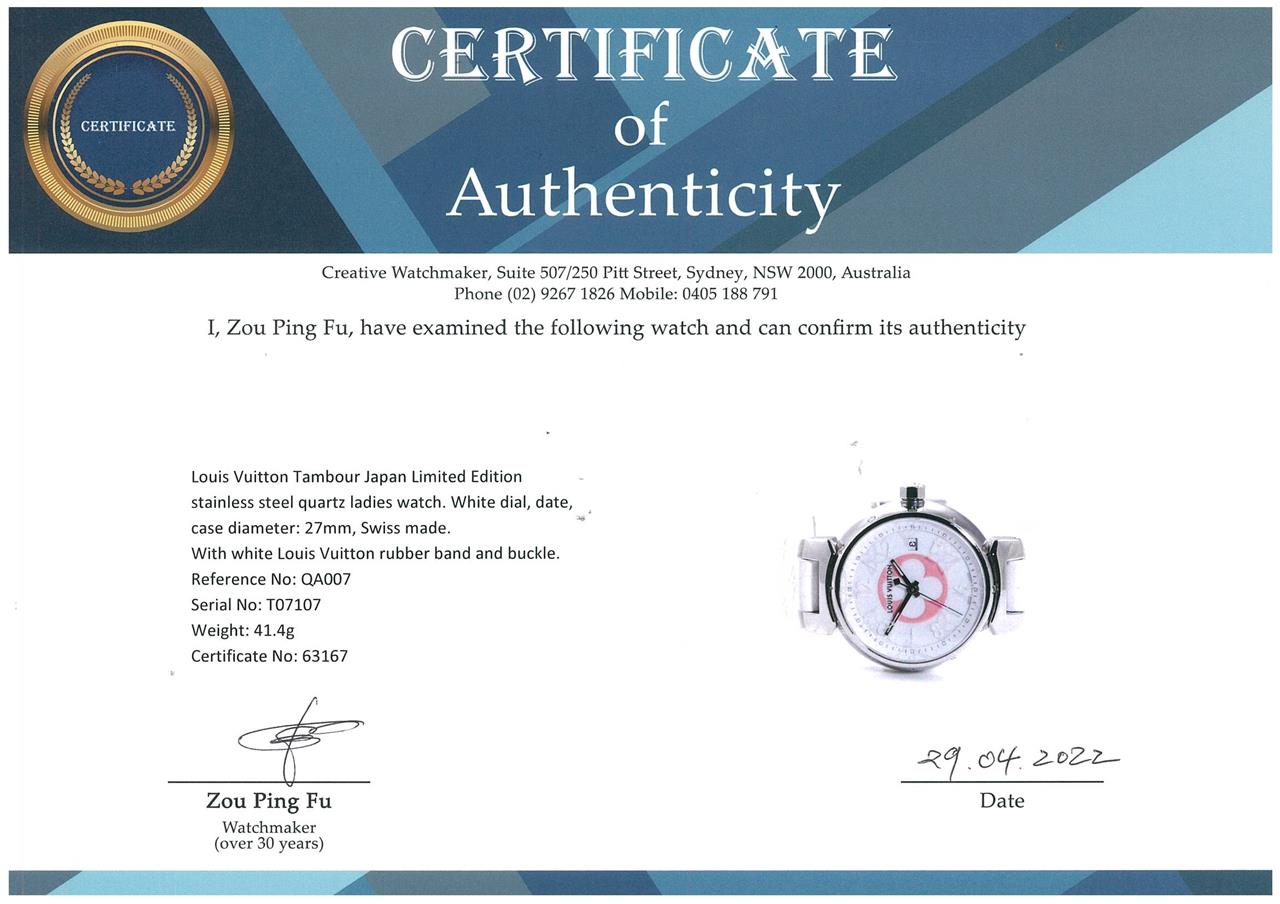 Louis Vuitton Tambour Japan Limited Edition stainless steel quartz ladies watch. White dial, date, case diameter: 27mm, strap length: 18.5cm, Swiss made. With white Louis Vuitton rubber band and buckle. Ref# QA007. With Certificate of Authenticity, Louis Vuitton International Guarantee Booklet dated 13/10/2018 and Louis Vuitton box. 3 month FSA warranty. (Pre-owned)