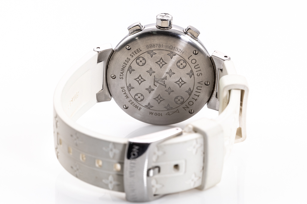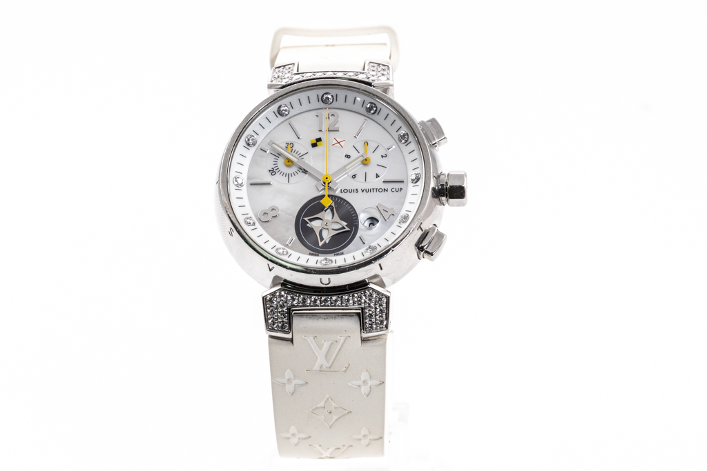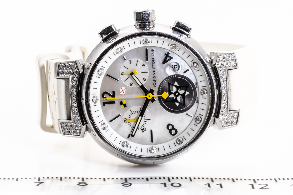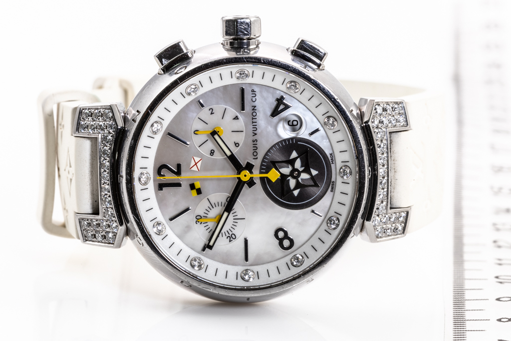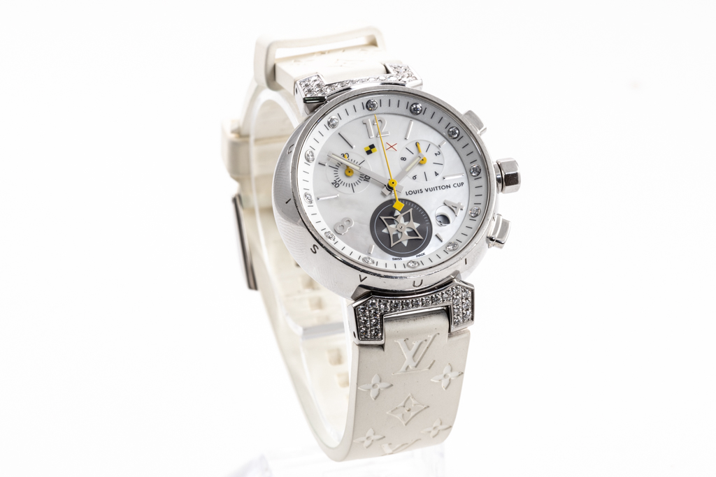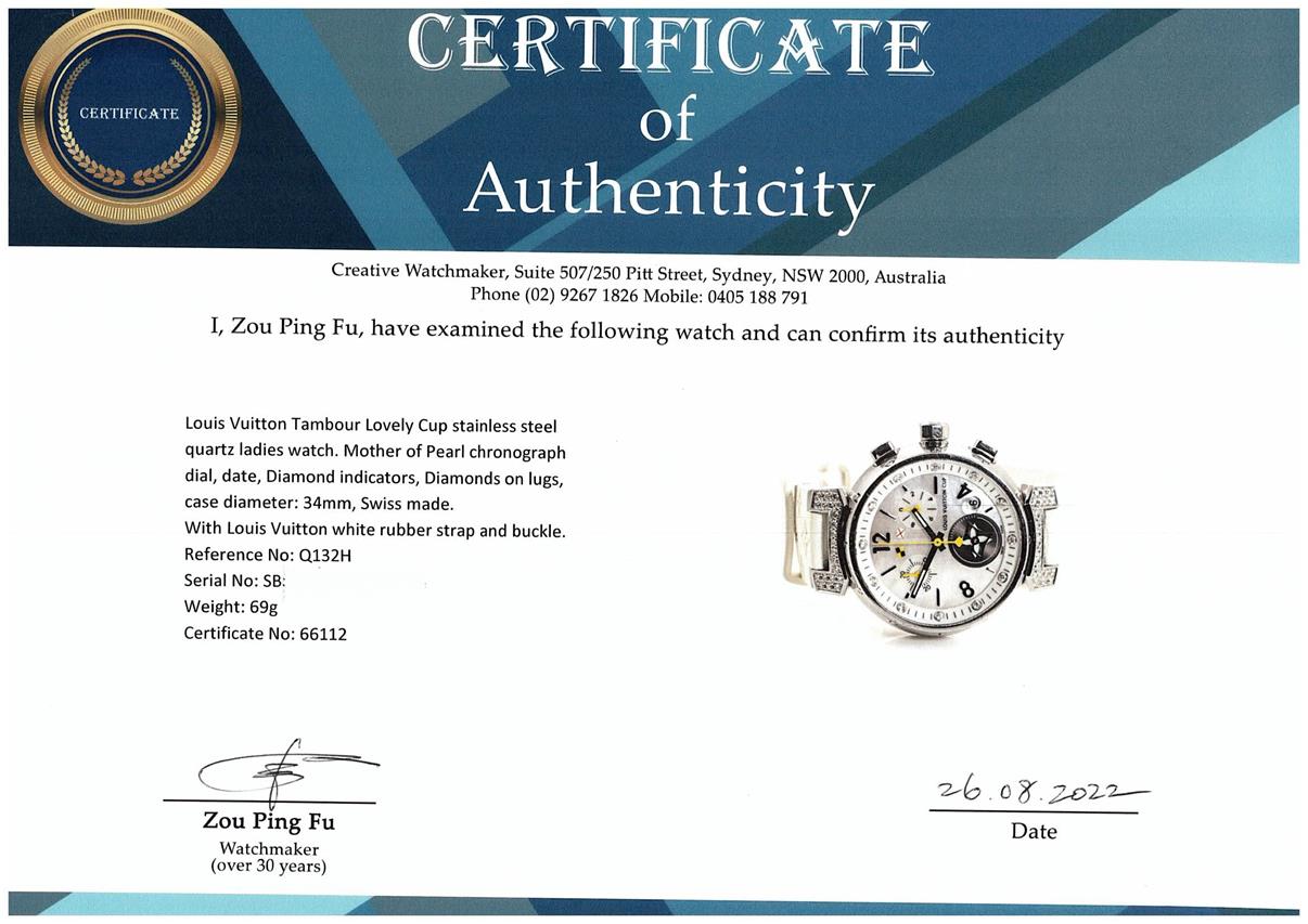 Louis Vuitton Tambour Lovely Cup stainless steel quartz ladies watch. Mother of Pearl chronograph dial, date, Diamond indicators, Diamonds on lugs, case diameter: 34mm, strap length: 18cm, Swiss made. Ref# Q132H. With Louis Vuitton white rubber strap and buckle. With Certificate of Authenticity and Louis Vuitton box. 3 month FSA warranty. (Pre-owned)