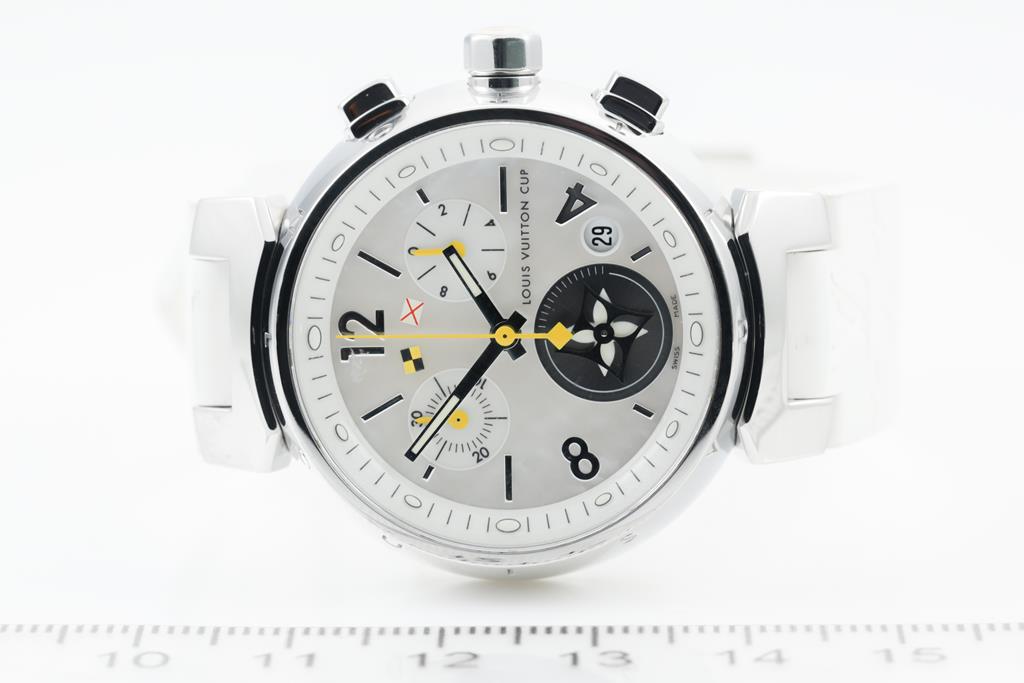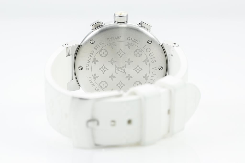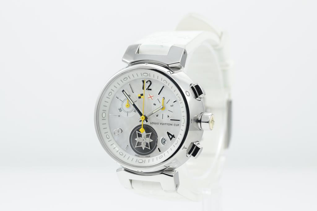 Louis Vuitton Tambour Lovely Cup stainless steel quartz watch. Mother of Pearl dial, date, small second, case diameter: 34mm, length: 18cm, Swiss made. Ref# Q132C. With Louis Vuitton white rubber strap and buckle. With Certificate of Authenticity and Louis Vuitton box. 3 month FSA warranty. (Pre-owned)