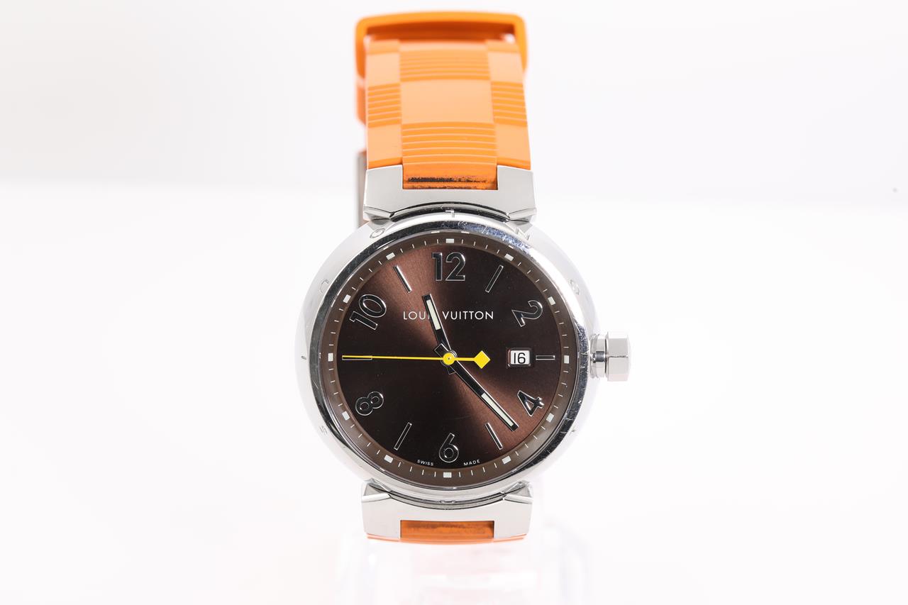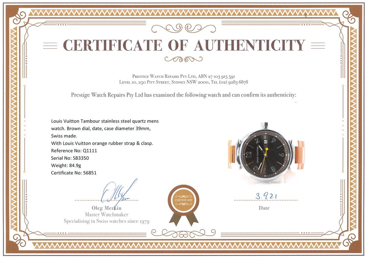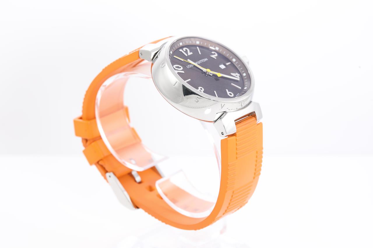 Louis Vuitton Tambour stainless steel quartz mens watch. Brown dial, date, length: 21cm, case diameter 39mm, Swiss made. Ref# Q1111, With Louis Vuitton orange rubber strap & clasp. With certificate of authenticity. 3 month FSA warranty. (Pre-owned)
