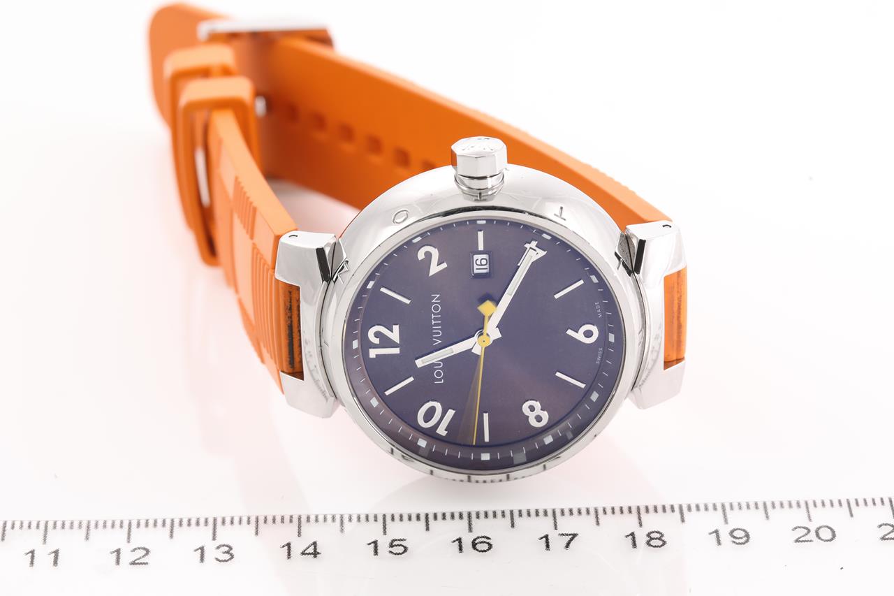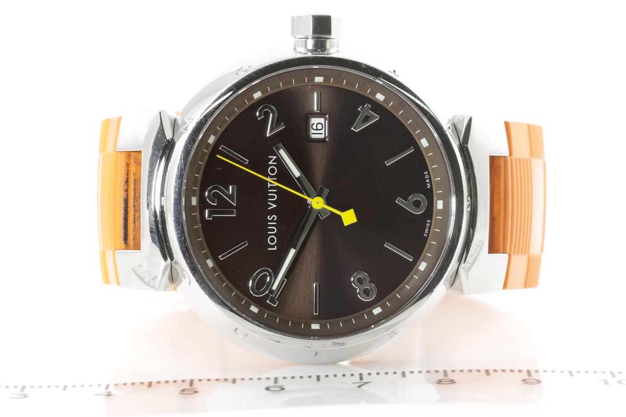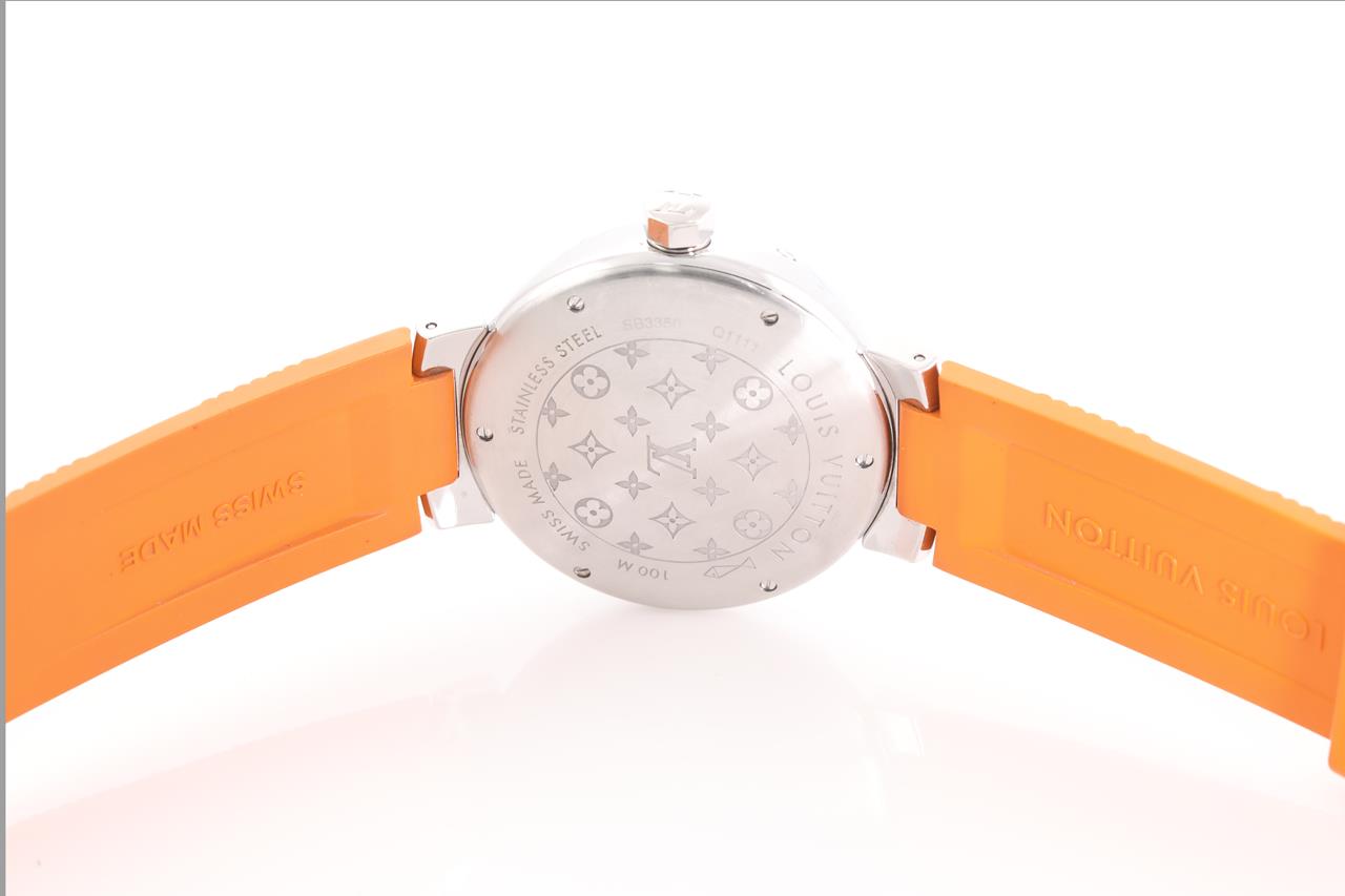 Louis Vuitton Tambour stainless steel quartz mens watch. Brown dial, date, length: 21cm, case diameter 39mm, Swiss made. Ref# Q1111, With Louis Vuitton orange rubber strap & clasp. With certificate of authenticity. 3 month FSA warranty. (Pre-owned)