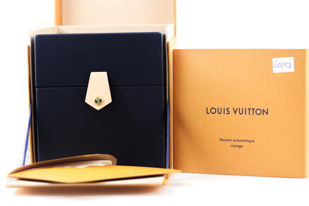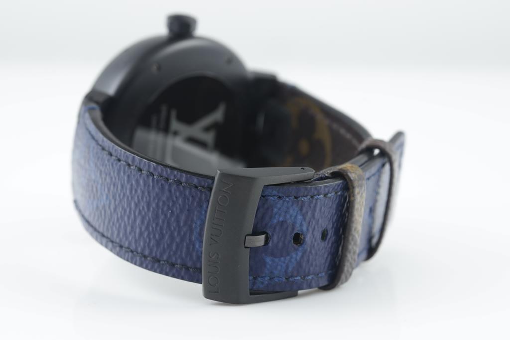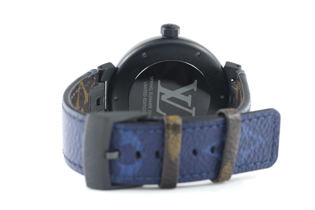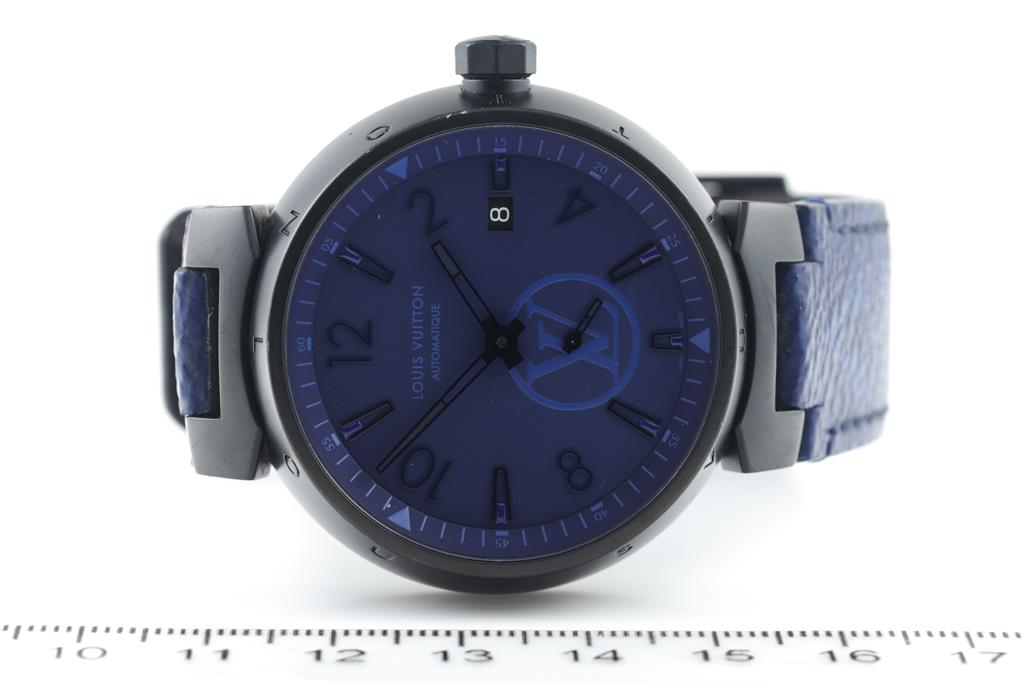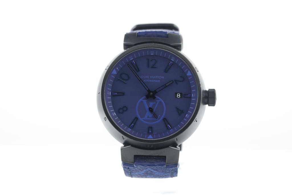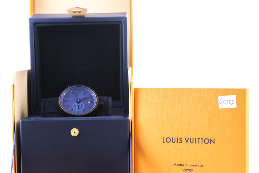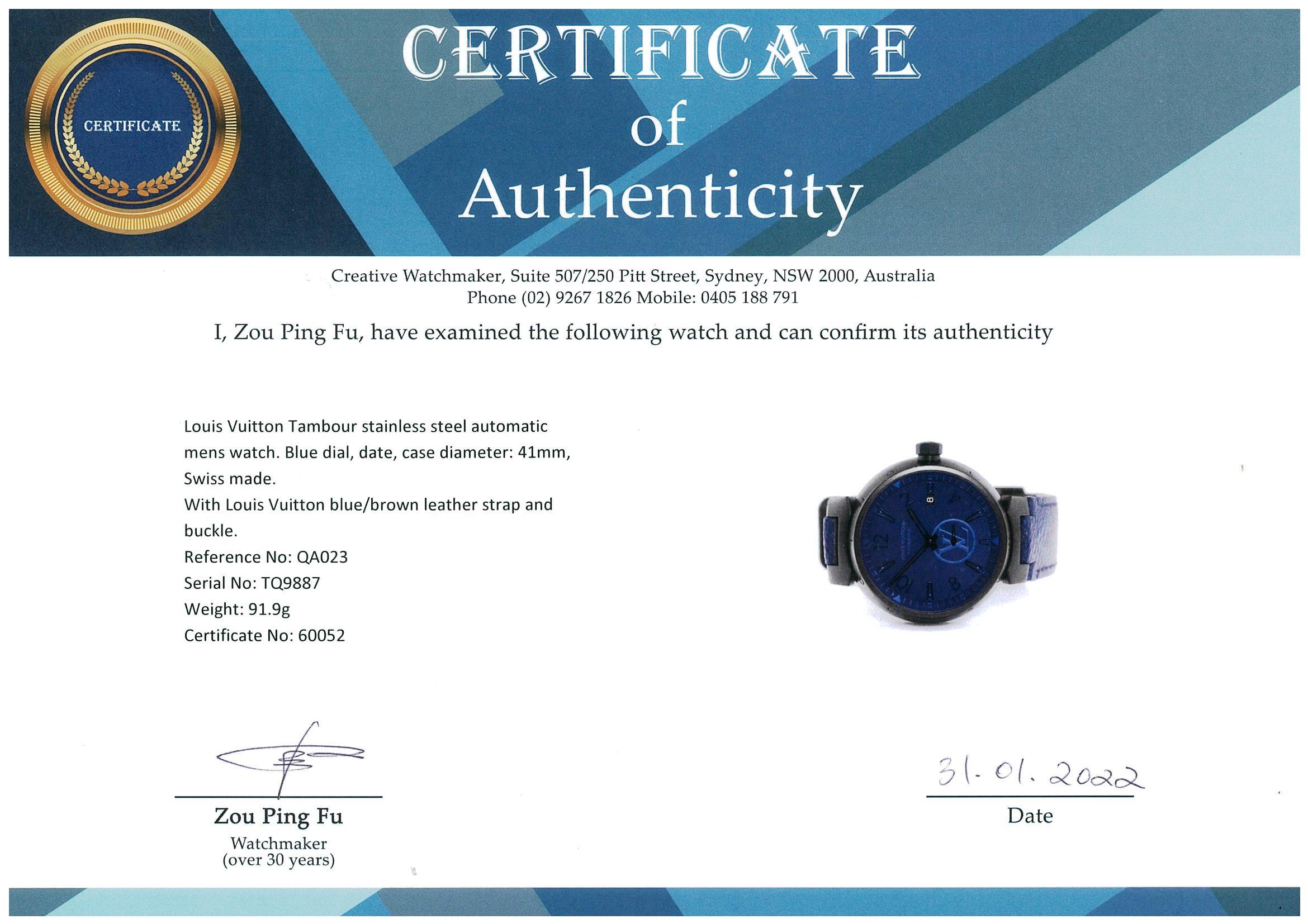 Louis Vuitton Tambour stainless steel automatic mens watch. Blue dial, date, case diameter: 41mm, strap length: 21cm, Swiss made. Ref# QA023. With Louis Vuitton blue/brown leather strap and buckle. With Certificate of Authenticity, Louis Vuitton International Guarantee booklet dated 27/06/2018 and Louis Vuitton box. 3 month FSA warranty. (Pre-owned)