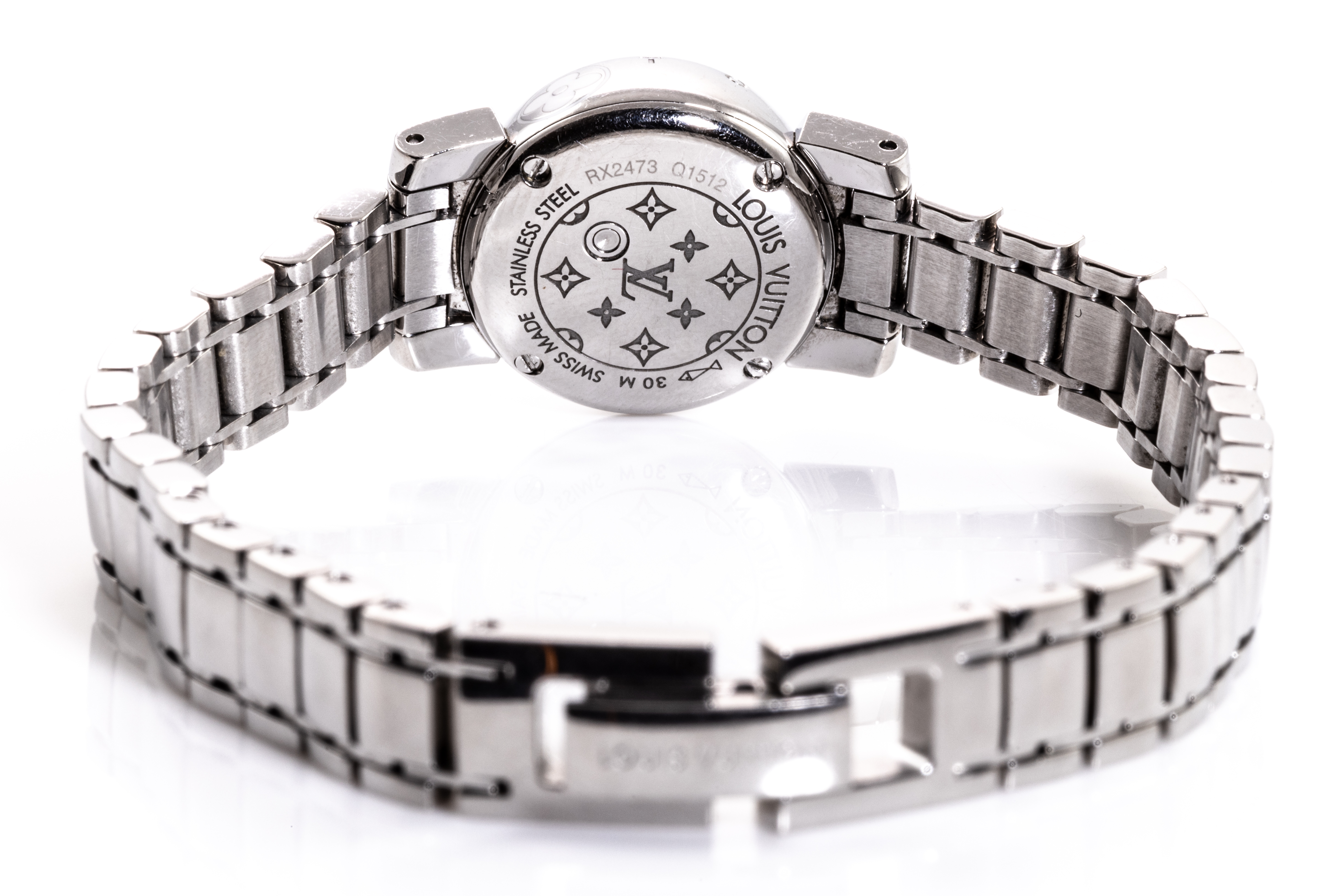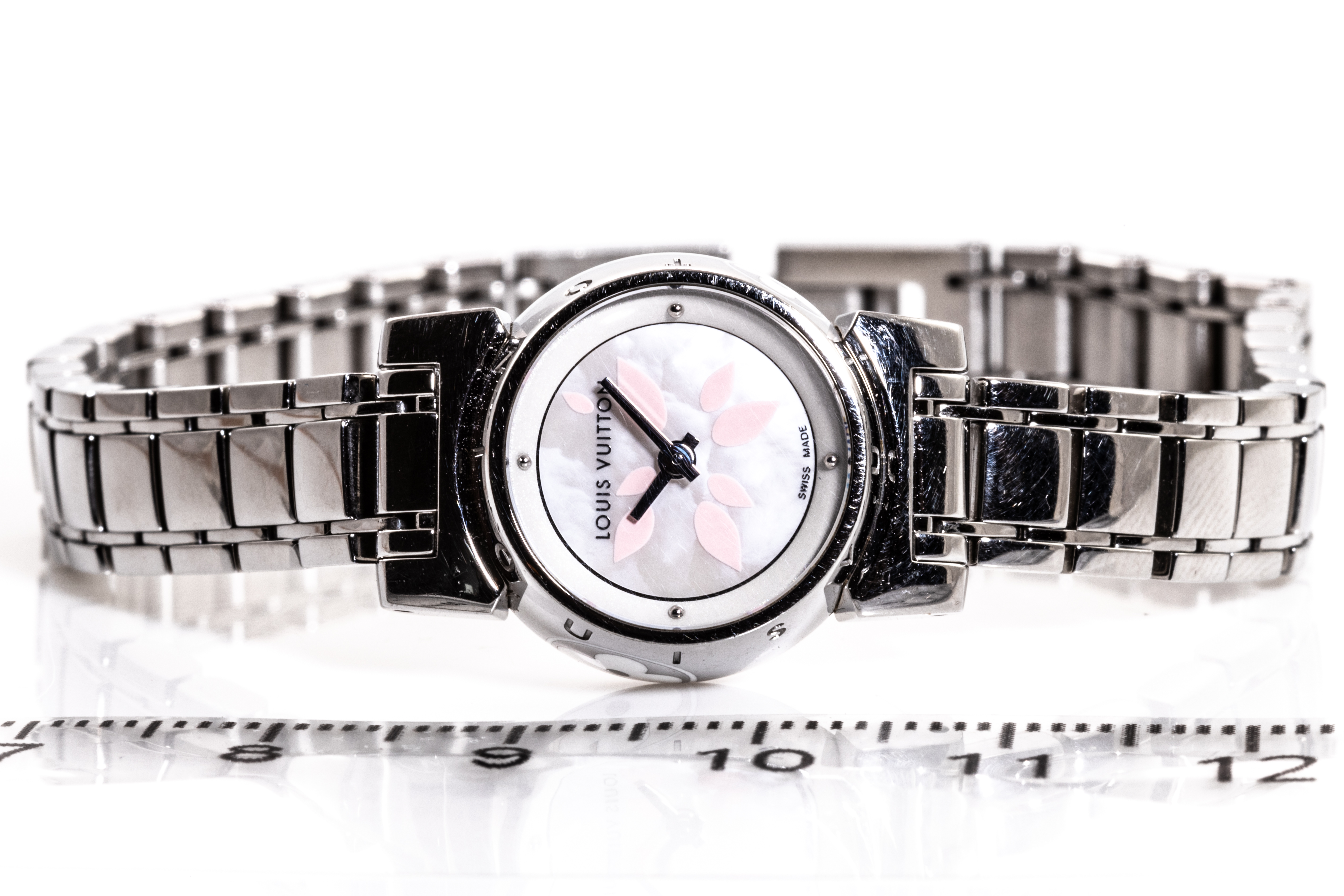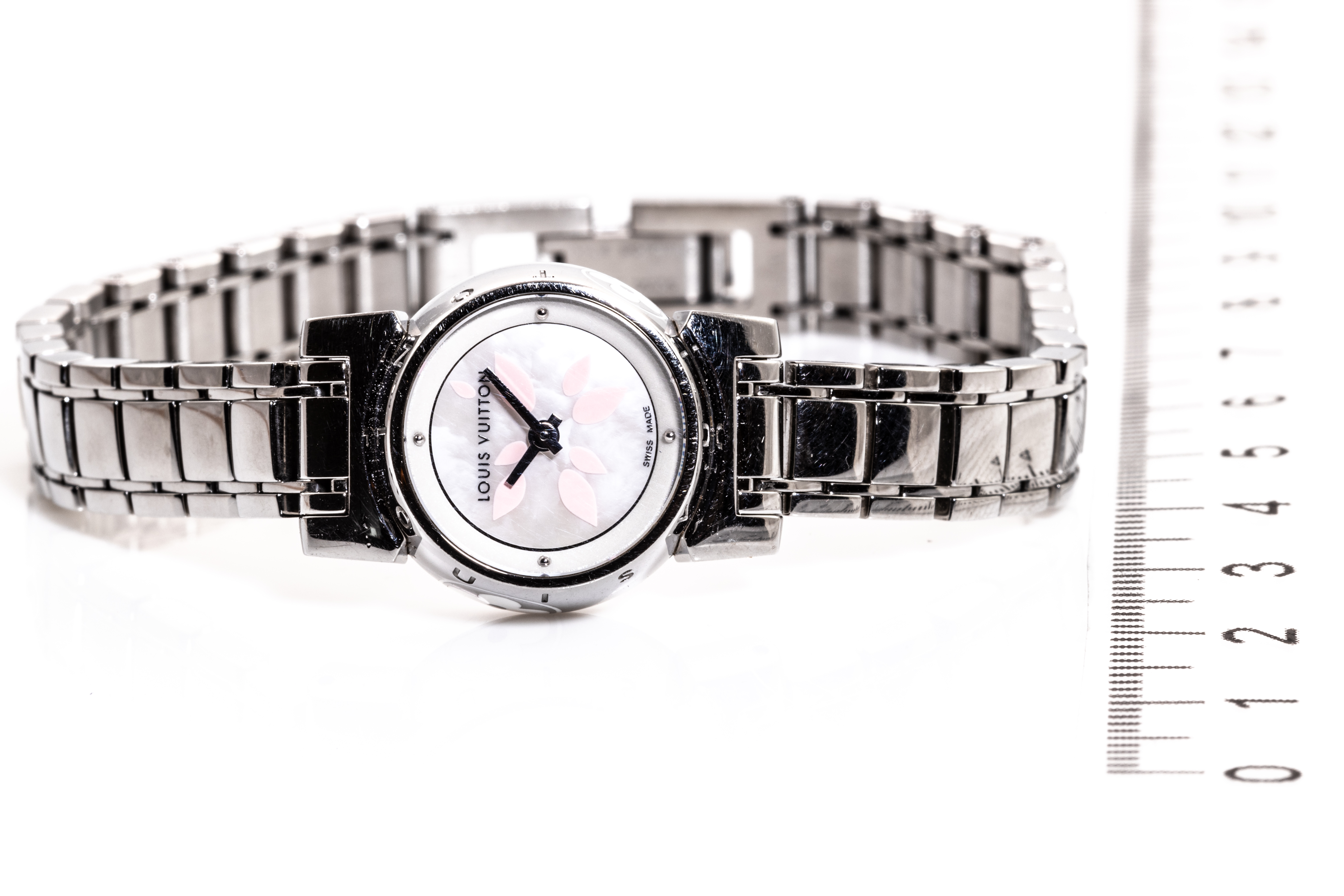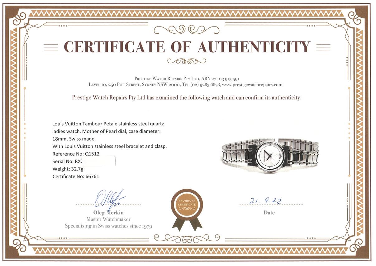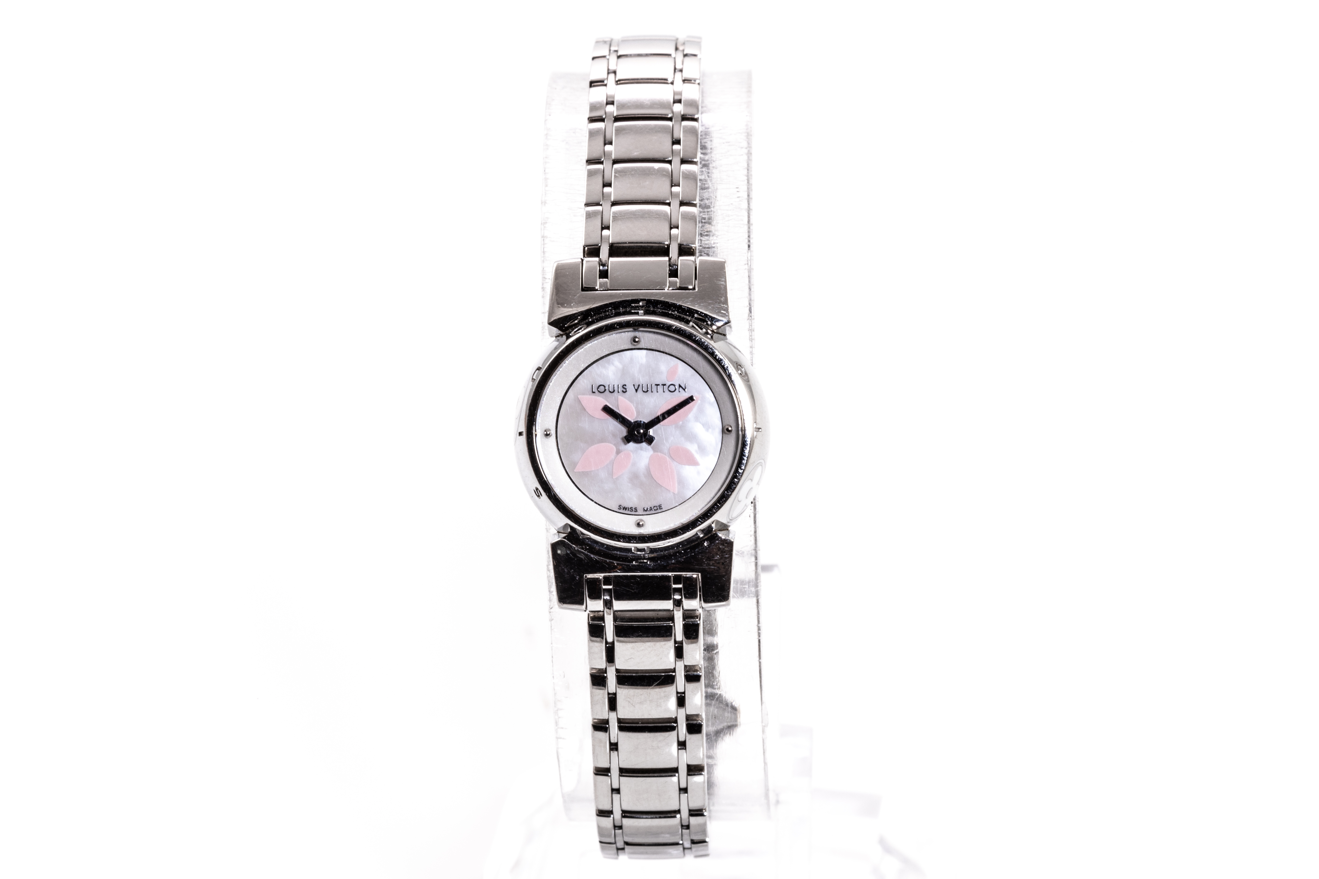 Louis Vuitton Tambour Petale stainless steel quartz ladies watch. Mother of Pearl dial, case diameter: 18mm, wrist size: 16cm, Swiss made. Ref# Q1512. With Louis Vuitton stainless steel bracelet and clasp. With Certificate of Authenticity and Louis Vuitton case. 3 month FSA warranty. (Pre-owned)