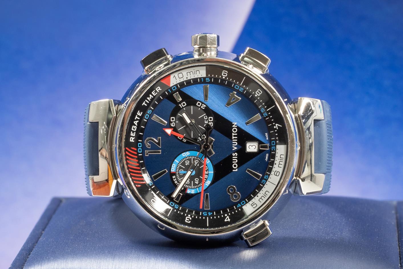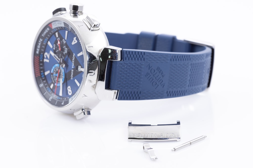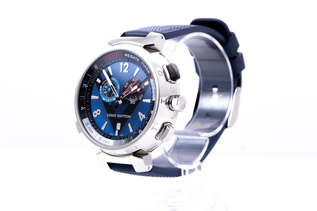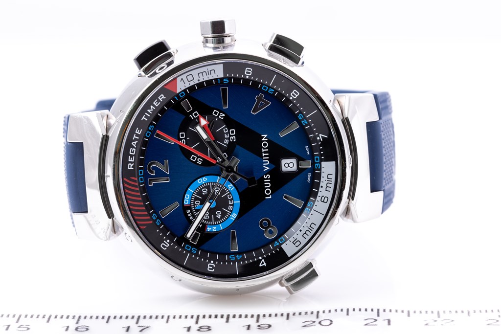 Louis Vuitton Tambour Regatta stainless steel quartz mens watch. Blue chronograph dial, date, case diameter: 44mm, wrist lenght: 21cm, Swiss made. Ref# Q102D. With Louis Vuitton blue rubber strap and buckle. With spare Louis vuitton buckle. With Certificate of Authenticity and Louis Vuitton box. 3 month FSA warranty. (Pre-owned)