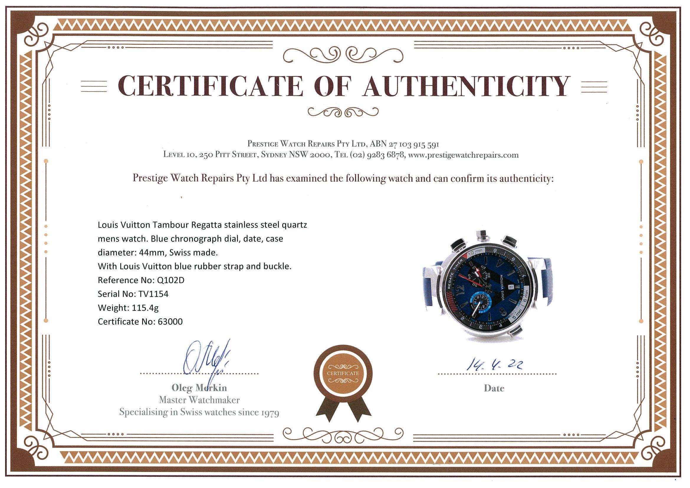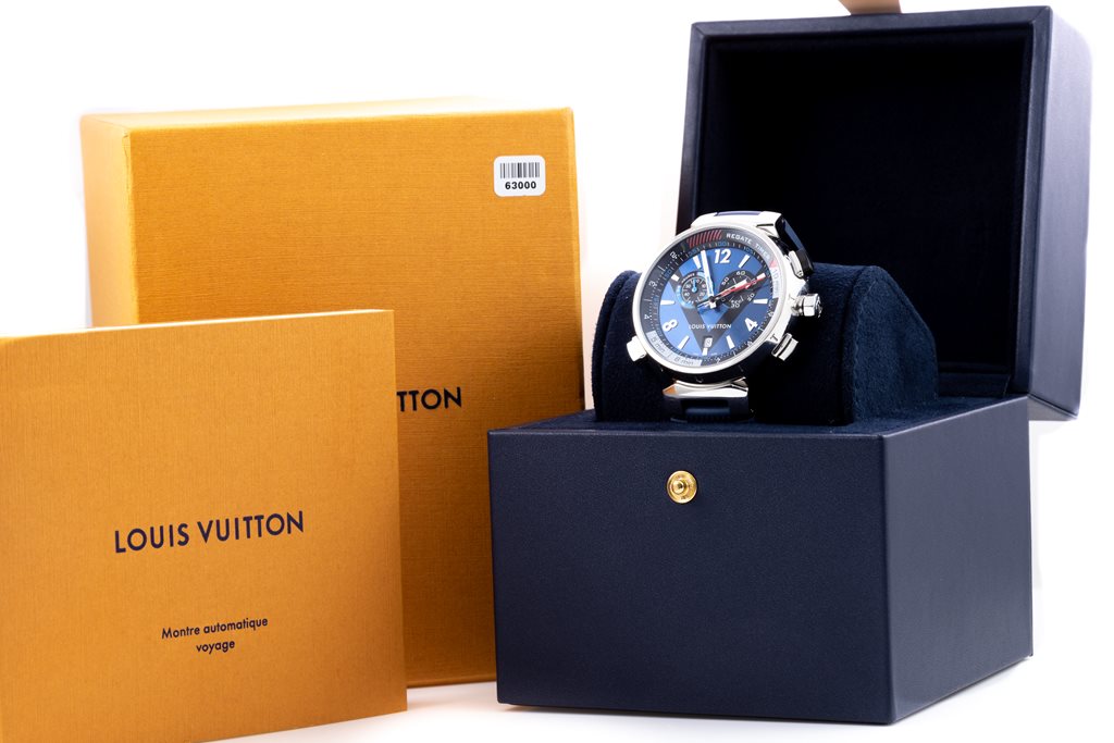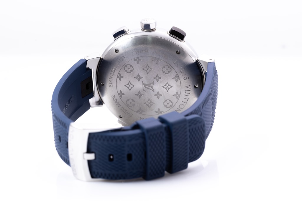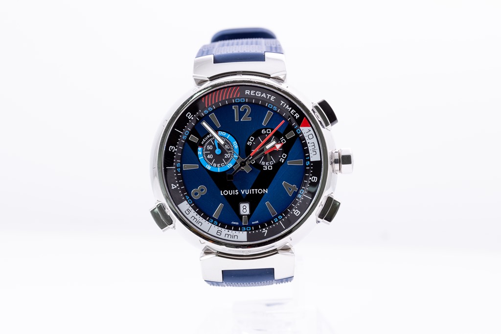 Louis Vuitton Tambour Regatta stainless steel quartz mens watch. Blue chronograph dial, date, case diameter: 44mm, wrist lenght: 21cm, Swiss made. Ref# Q102D. With Louis Vuitton blue rubber strap and buckle. With spare Louis vuitton buckle. With Certificate of Authenticity and Louis Vuitton box. 3 month FSA warranty. (Pre-owned)