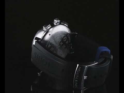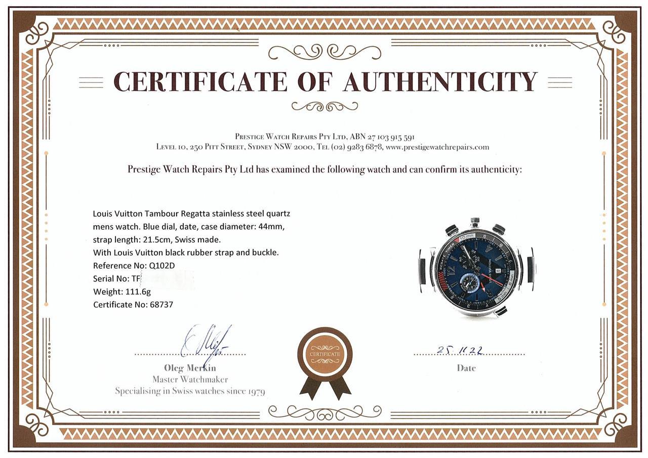 Louis Vuitton Tambour Regatta stainless steel quartz mens watch. Blue dial, date, case diameter: 44mm, strap length: 21.5cm, Swiss made. Ref# Q102D. With Louis Vuitton black rubber strap and buckle. With Certificate of Authenticity, Louis Vuitton International Guarantee Booklet dated 17/04/2017, Louis Vuitton case and Louis Vuitton box. 3 month FSA warranty. (Pre-owned)