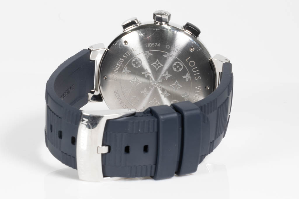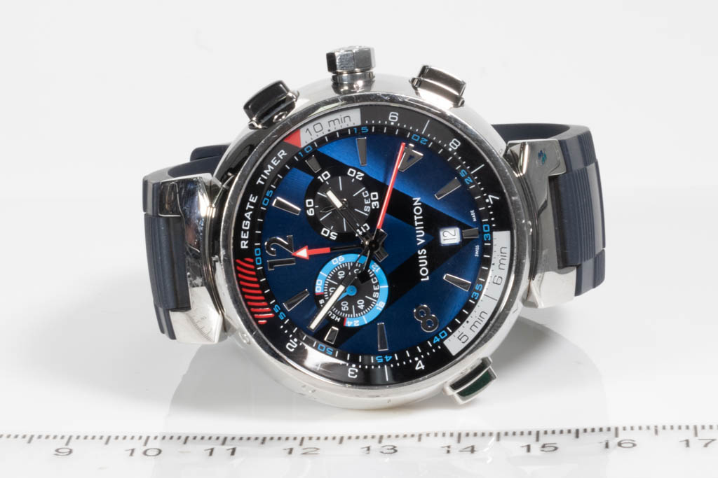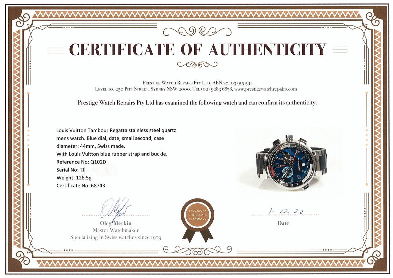 Louis Vuitton Tambour Regatta stainless steel quartz mens watch. Blue dial, date, small second, case diameter: 44mm, strap length: 21cm, Swiss made. Ref# Q102D. With Louis Vuitton blue rubber strap and buckle. With Certificate of Authenticity and Louis Vitton International Guarantee Booklet dated 22/10/2018. 3 month FSA warranty. (Pre-owned)