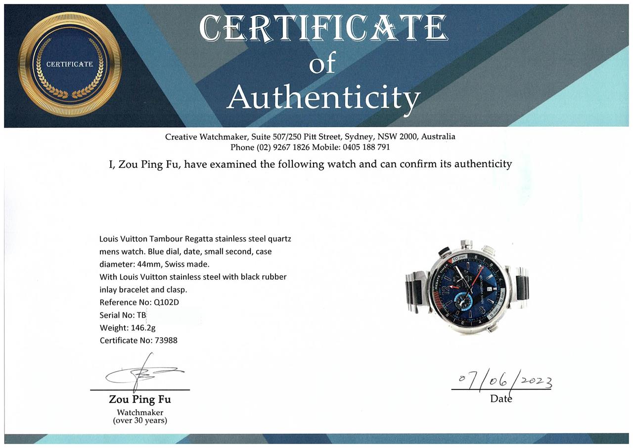 Louis Vuitton Tambour Regatta stainless steel quartz mens watch. Blue dial, date, small second, case diameter: 44mm, wrist size: 20cm, Swiss made. Ref# Q102D. With Louis Vuitton stainless steel with black rubber inlay bracelet and clasp. With Certificate of Authenticity. 3 month FSA warranty. (Pre-owned)