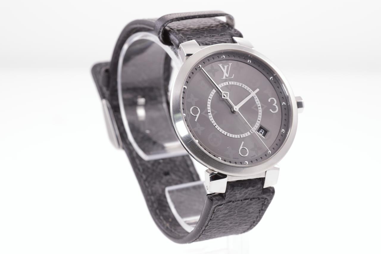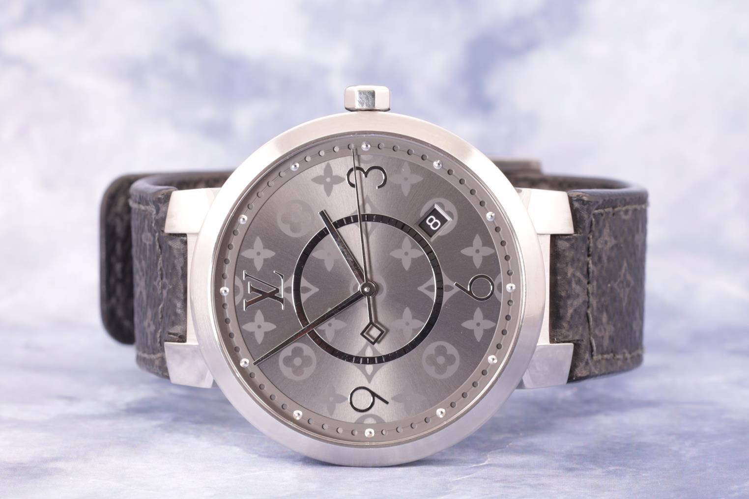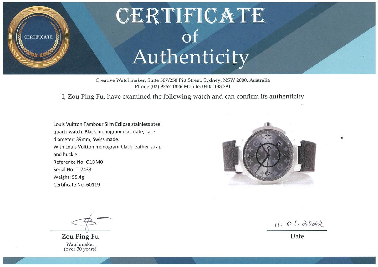Louis Vuitton Tambour Slim Eclipse stainless steel quartz mens watch. Black monogram dial, date, case diameter: 39mm, length: 20cm, Swiss made. Ref #Q1DM0. With Louis Vuitton monogram black leather strap and buckle. With Certificate of Authenticity, Louis Vuitton International Guarantee booklet dated 23/05/2017 and Louis Vuitton box. 3 month FSA warranty. (Pre-owned)