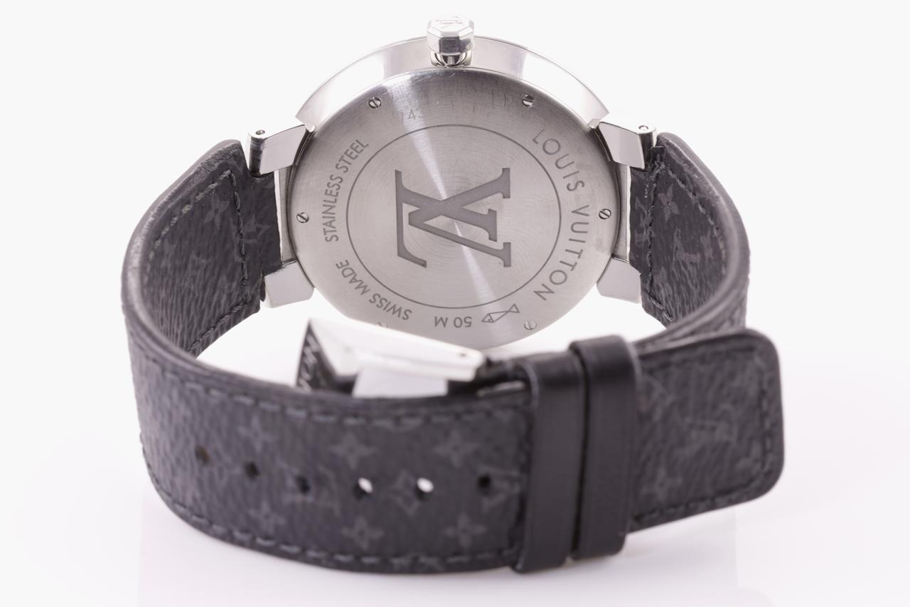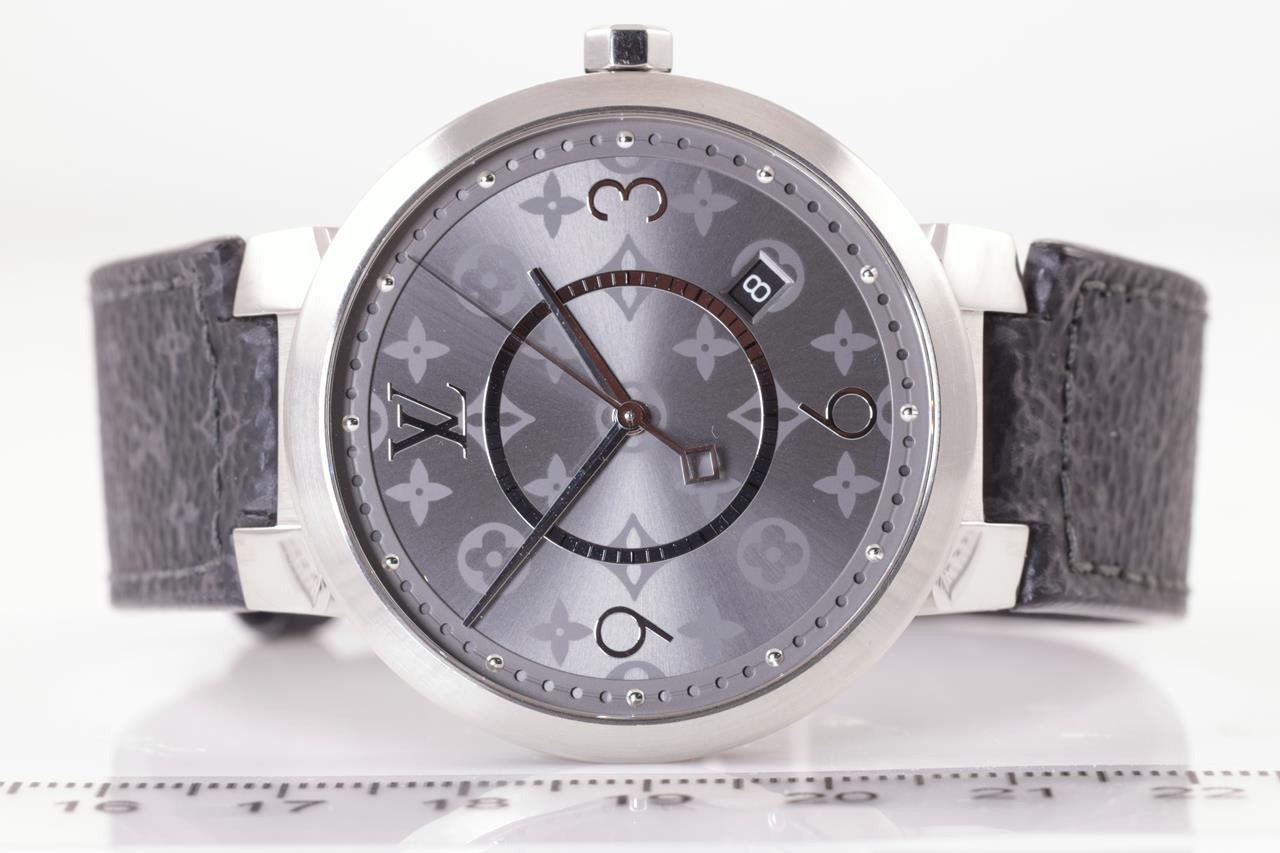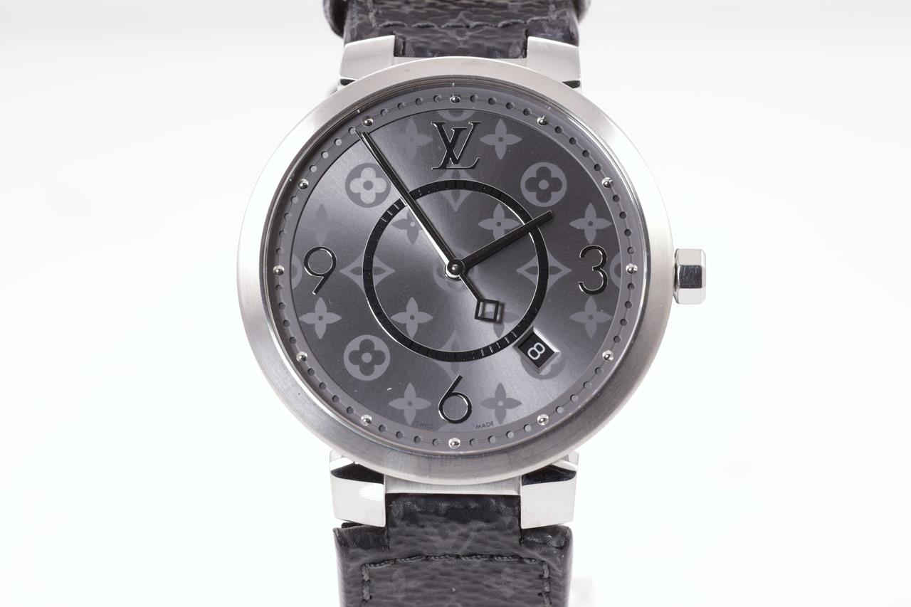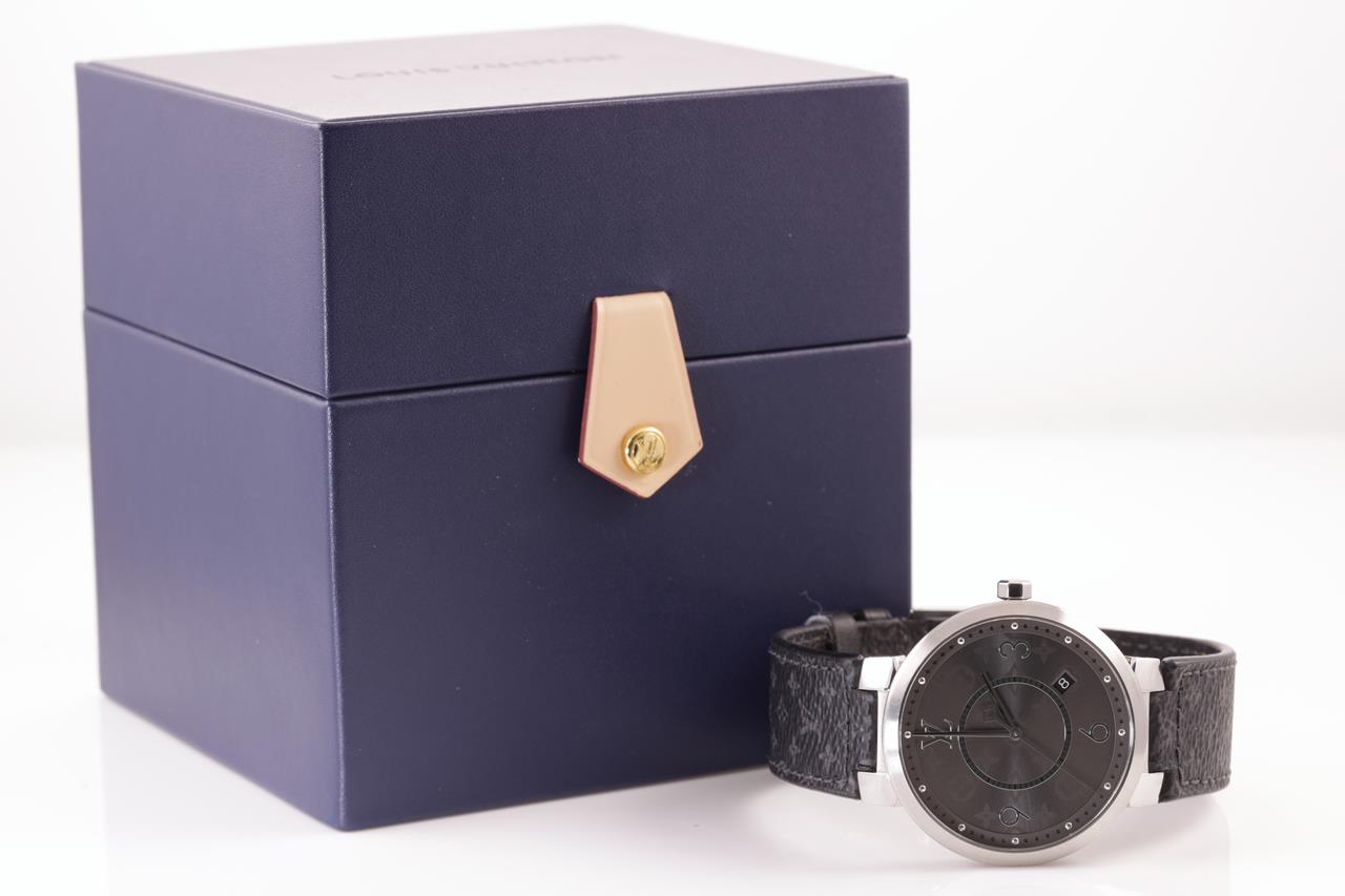 Louis Vuitton Tambour Slim Eclipse stainless steel quartz mens watch. Black monogram dial, date, case diameter: 39mm, length: 20cm, Swiss made. Ref #Q1DM0. With Louis Vuitton monogram black leather strap and buckle. With Certificate of Authenticity, Louis Vuitton International Guarantee booklet dated 23/05/2017 and Louis Vuitton box. 3 month FSA warranty. (Pre-owned)