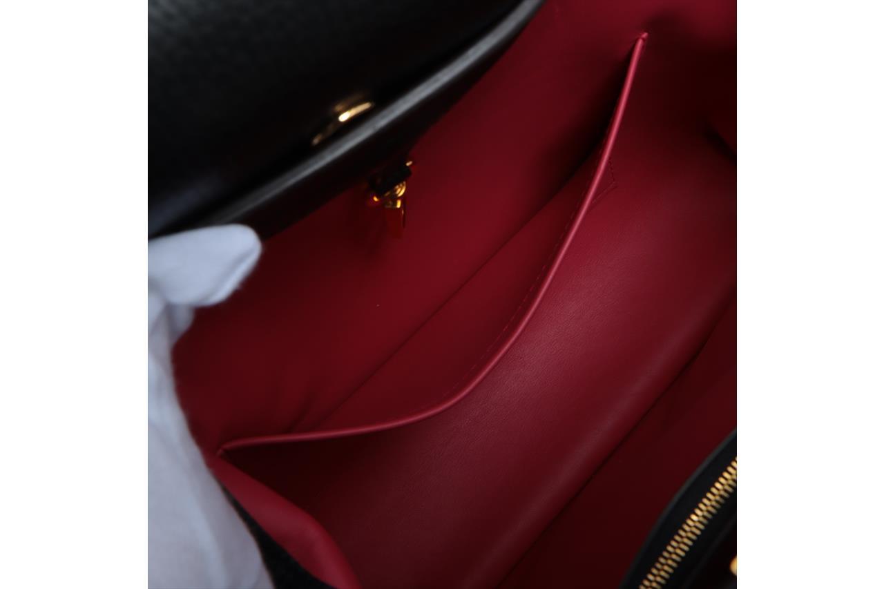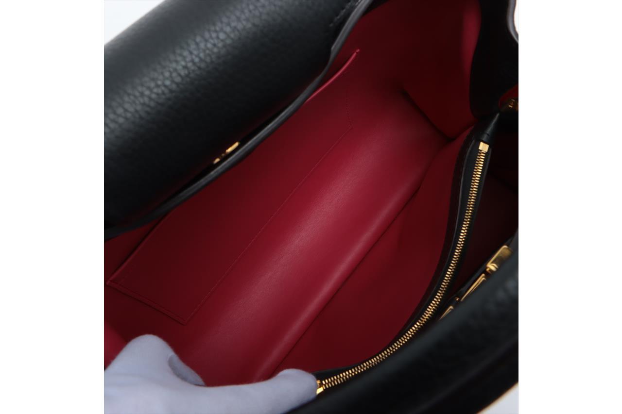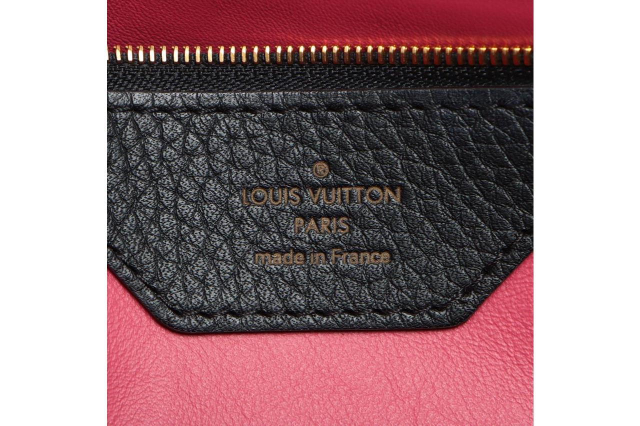 Louis Vuitton Taurillon Capucines Black MM bag. Featuring black exterior and pink interior leather, gold-tone hardware, rolled handle, flap closure at top. Apporximated dimensions: 36cm(L)-bottom x 23cm(H) x14cm(D), handle drop: 13cm. Accompanied by LV dust bag. With Entrupy Certificate of Authenticity. (Pre-owned)