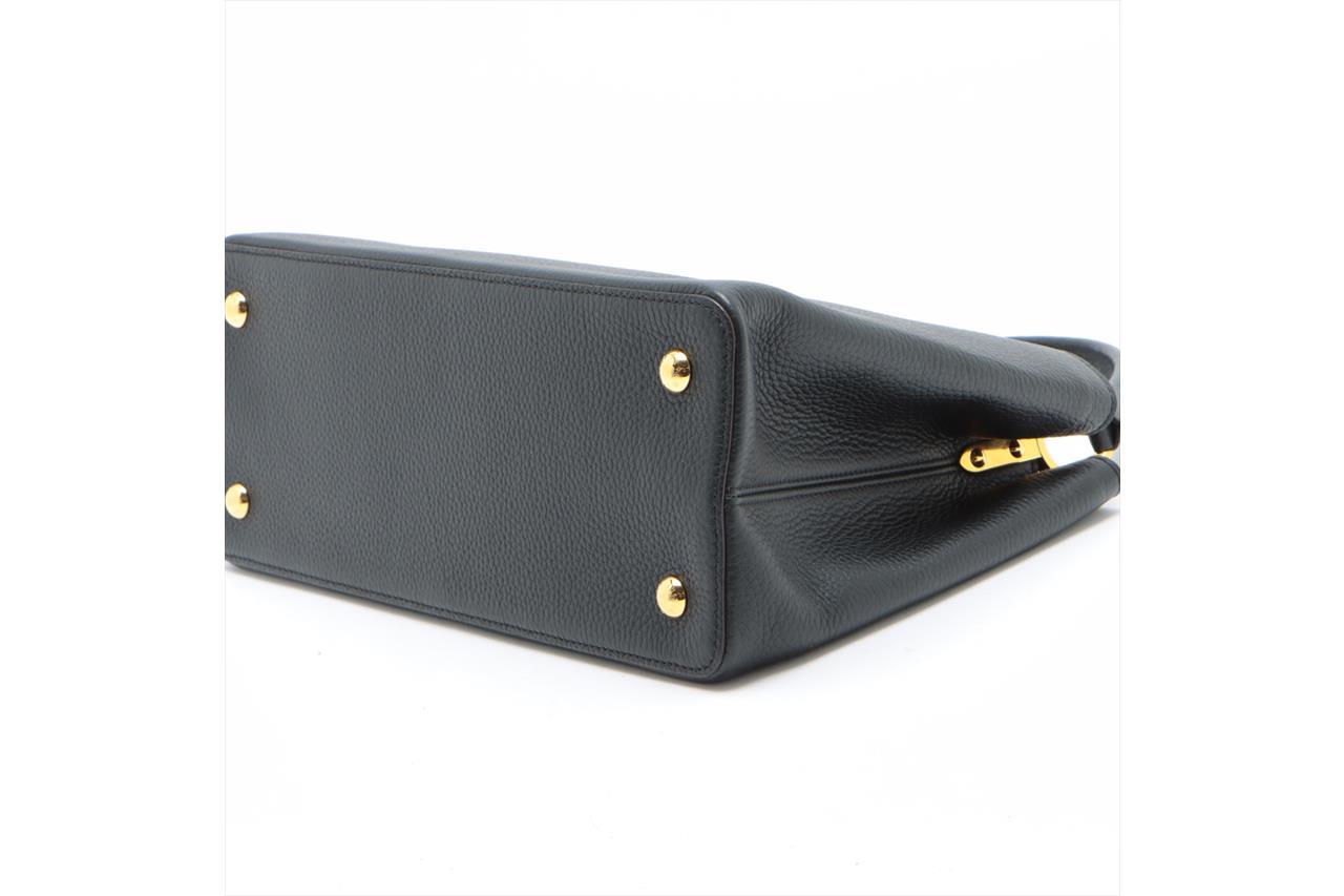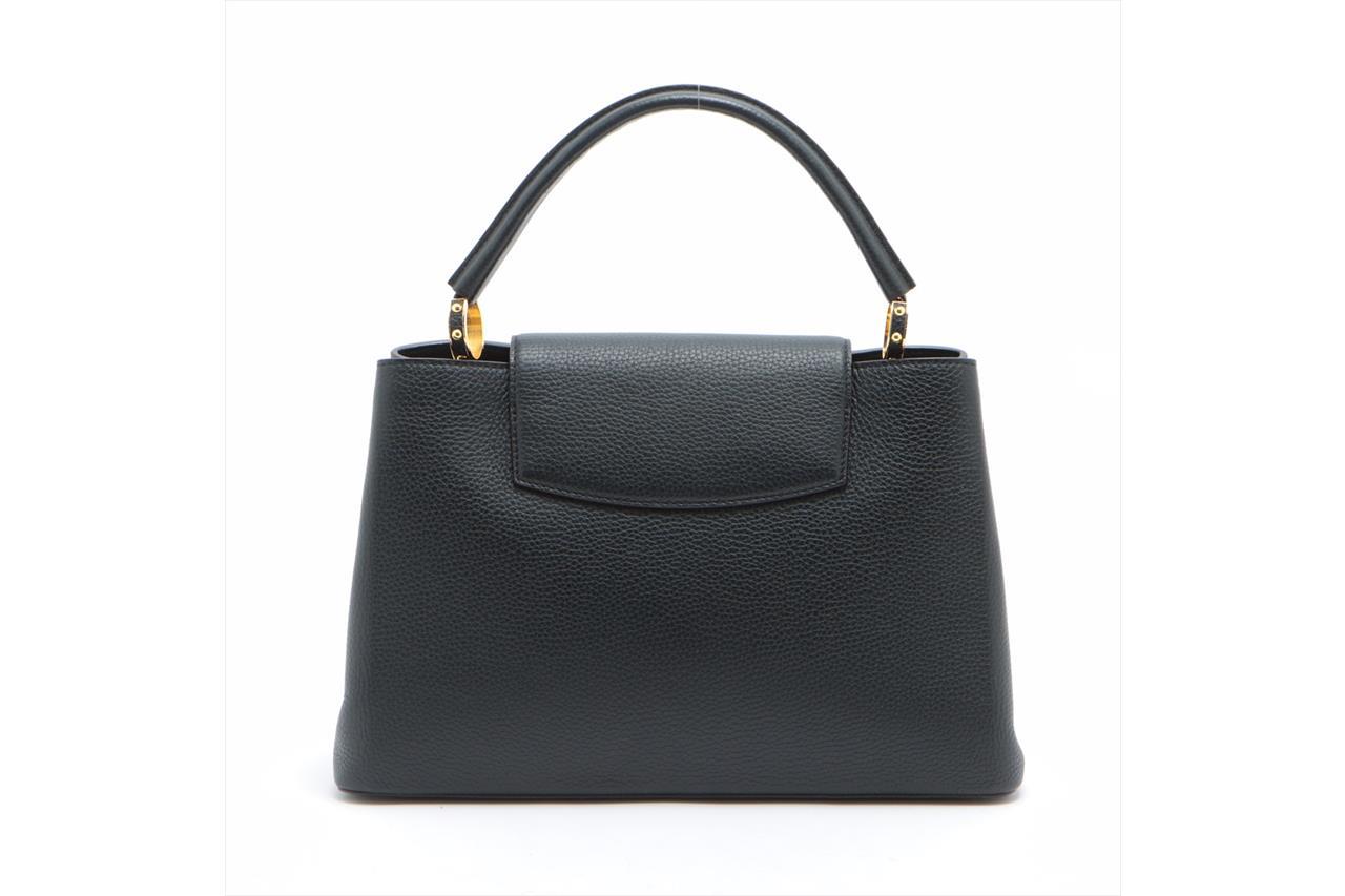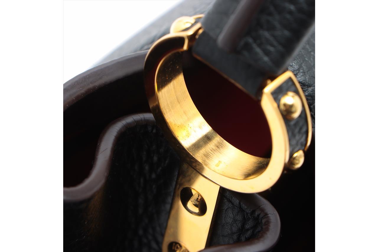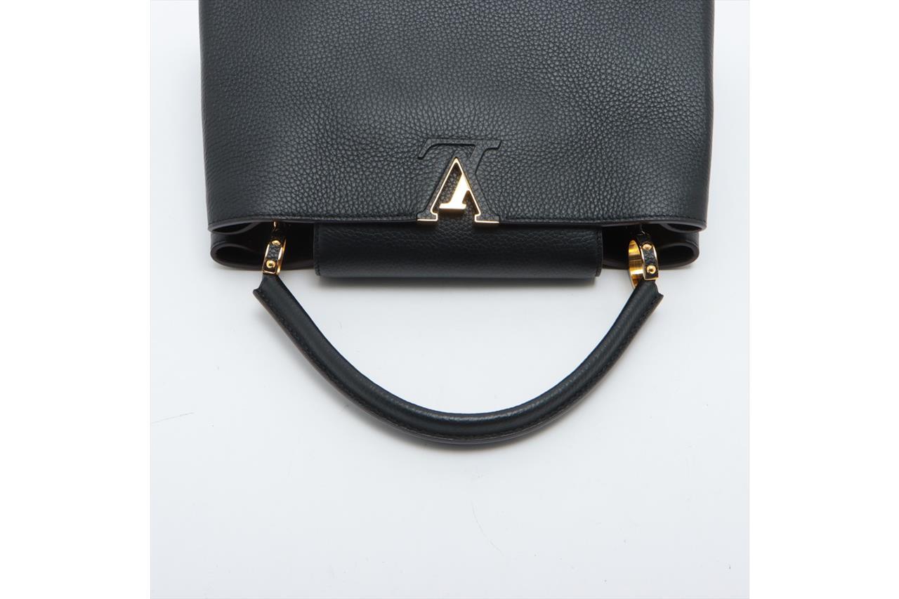 Louis Vuitton Taurillon Capucines Black MM bag. Featuring black exterior and pink interior leather, gold-tone hardware, rolled handle, flap closure at top. Apporximated dimensions: 36cm(L)-bottom x 23cm(H) x14cm(D), handle drop: 13cm. Accompanied by LV dust bag. With Entrupy Certificate of Authenticity. (Pre-owned)