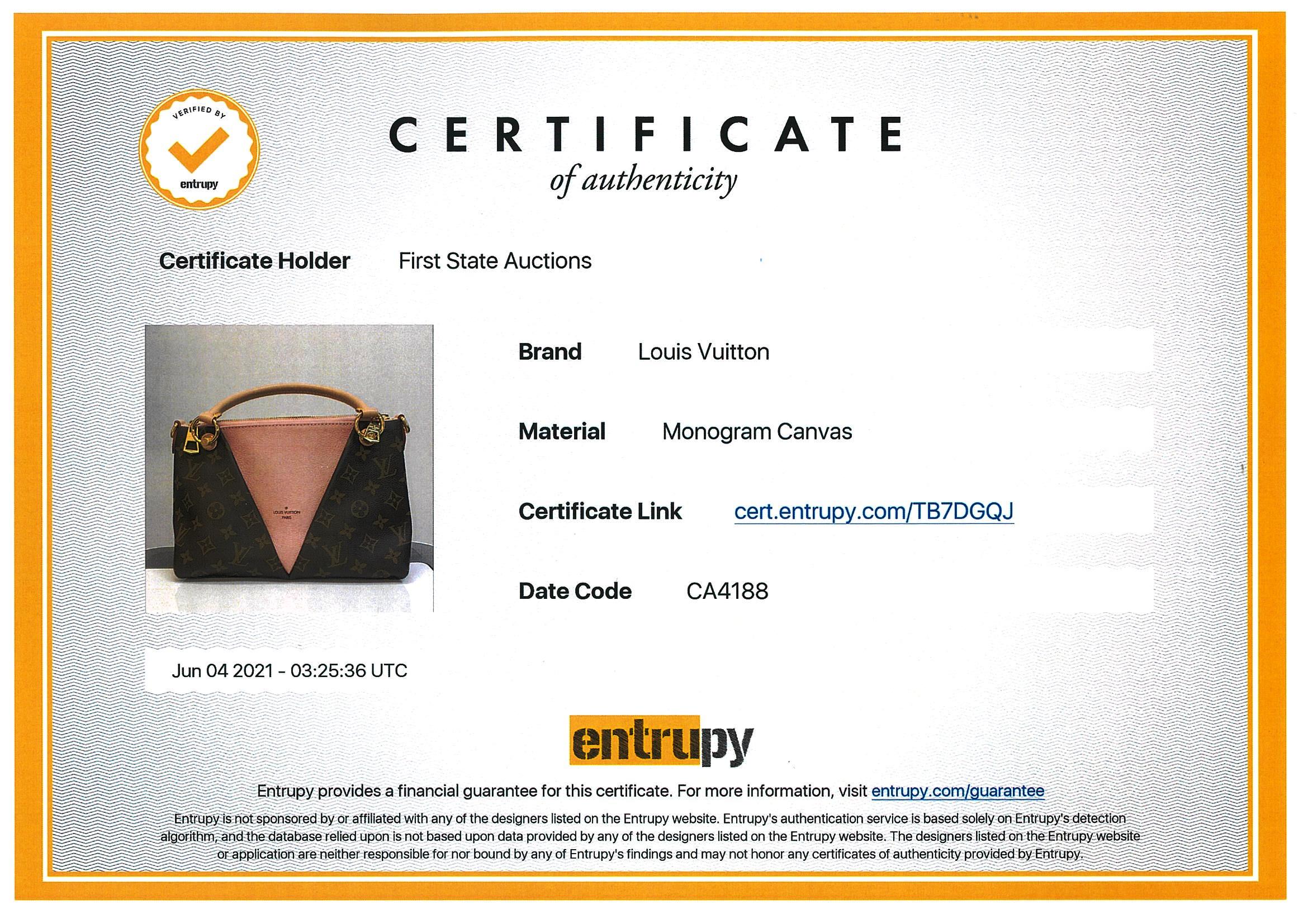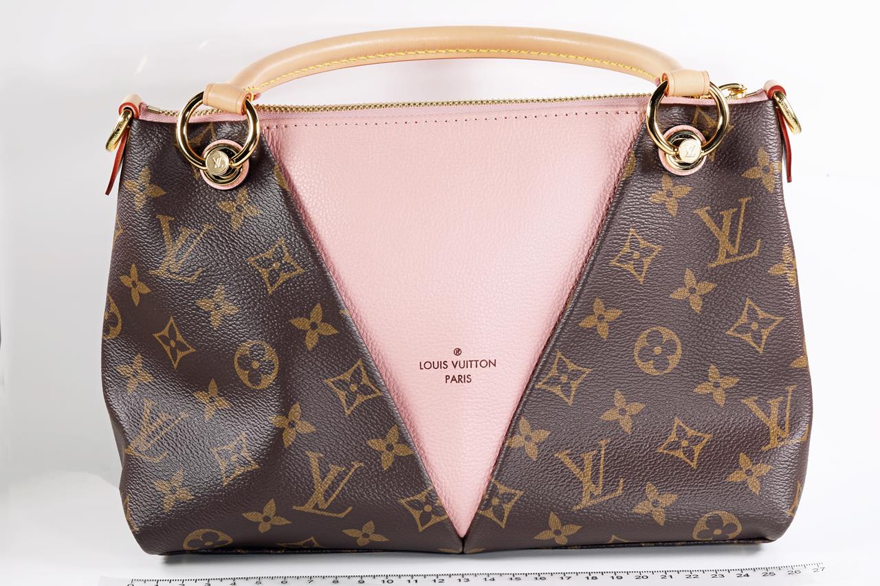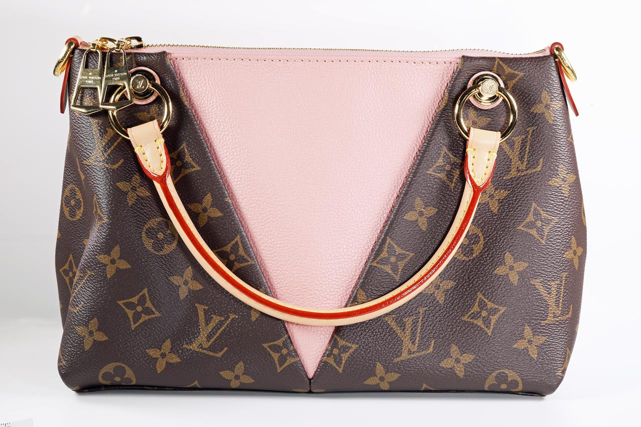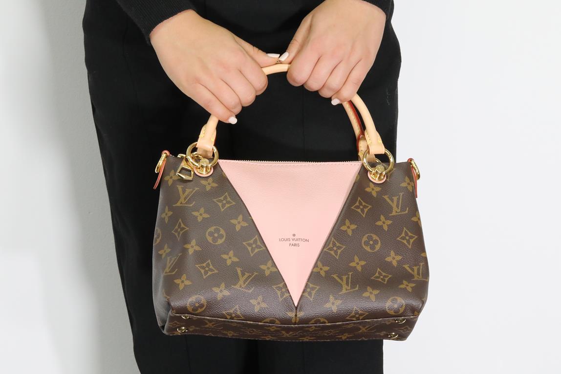 Louis Vuitton V Tote BB handbag with front V panel of pink leather. Made with Monogram coated canvas, exterior and microfiber internal lining. Approximate dimensions: 27cm (L) x 19cm (H) x 10.5cm (D). With copy of Louis Vuitton receipt and Entrupy Certificate of Authenticity.
