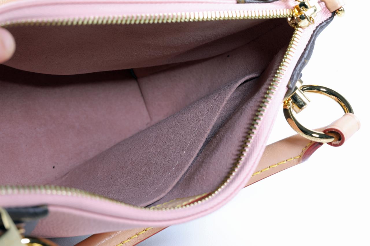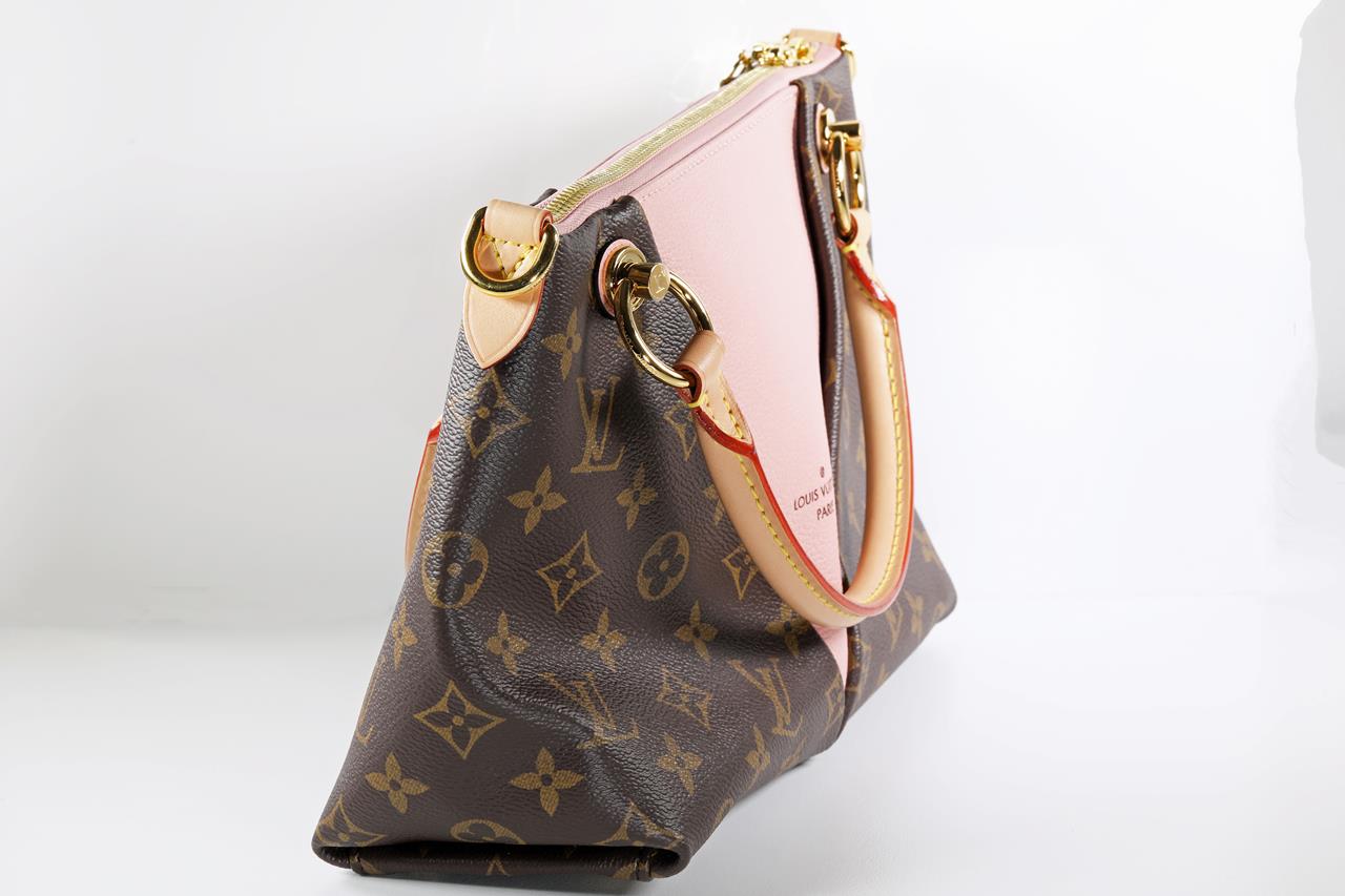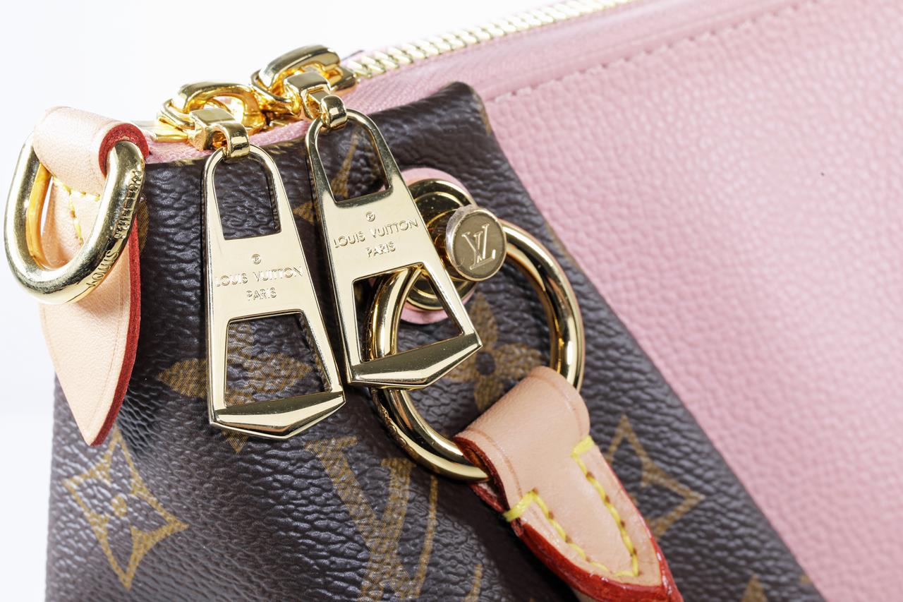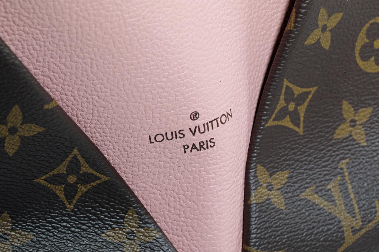 Louis Vuitton V Tote BB handbag with front V panel of pink leather. Made with Monogram coated canvas, exterior and microfiber internal lining. Approximate dimensions: 27cm (L) x 19cm (H) x 10.5cm (D). With copy of Louis Vuitton receipt and Entrupy Certificate of Authenticity.
