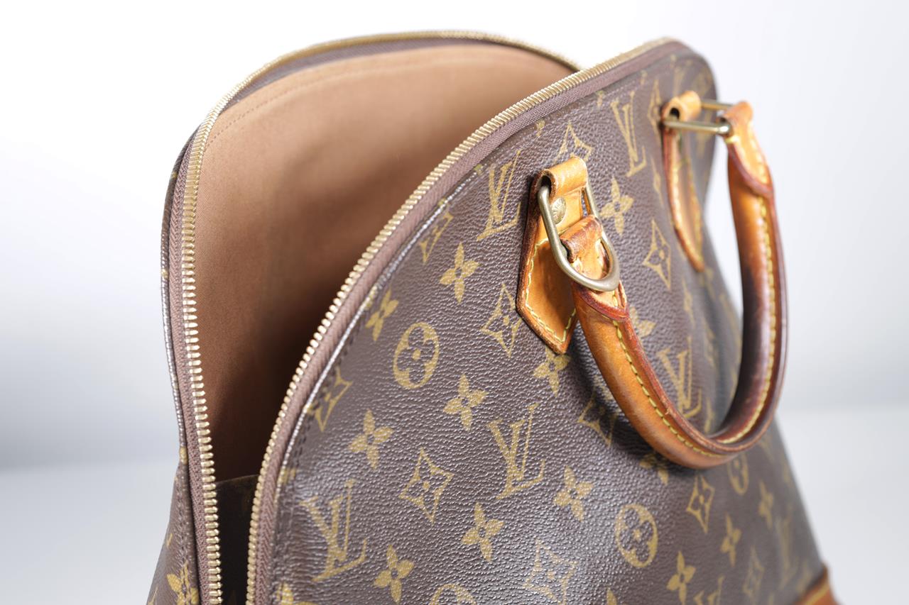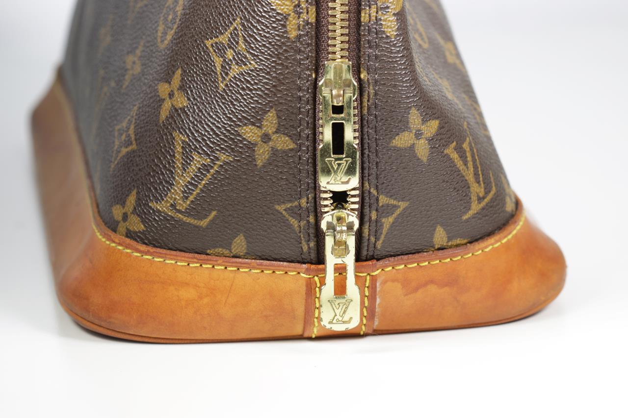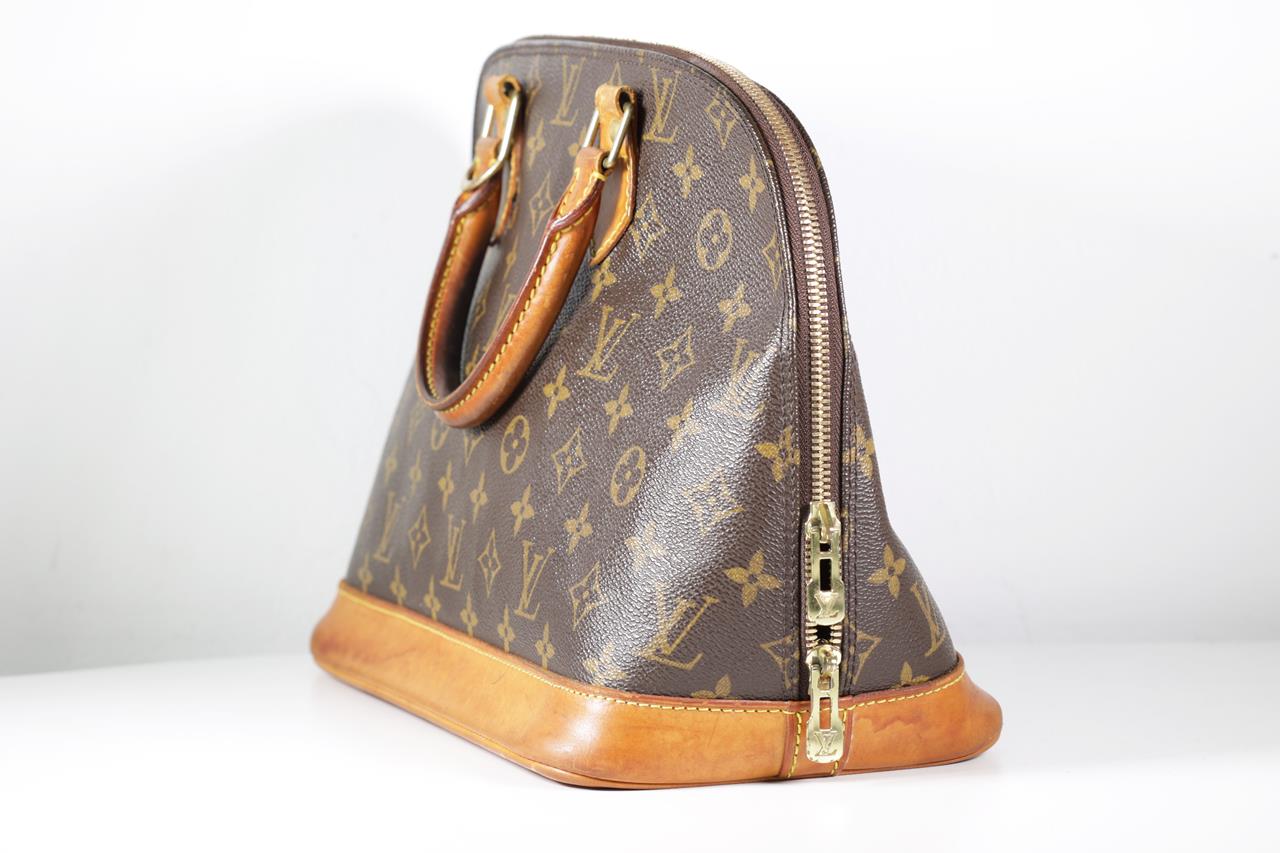 Louis Vuitton Vintage Alma Handbag PM in Monogram Canvas. Gold-tone hardware. Featuring dual rolled handles, leather trim, and a two-way zip closure opening to a brown fabric interior with slip pockets. Approximate dimensions: 30cm (L) x 24cm (H) x 15cm (D). With Entrupy Certificate of Authenticity. (Pre-owned)