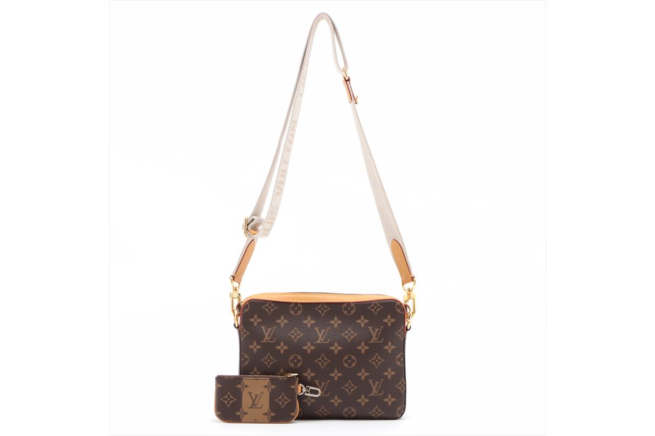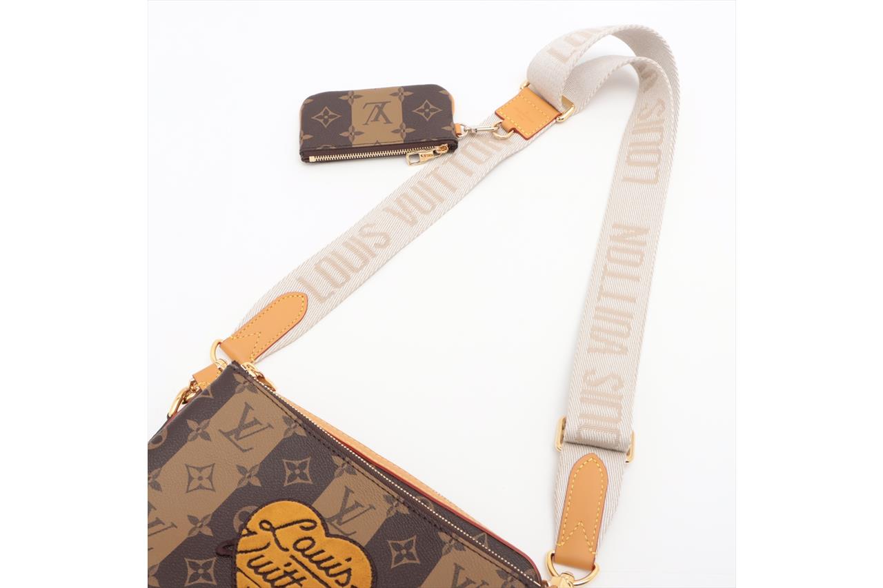 Louis Vuitton x NIGO Trio Messenger. Featuring Monogram stripes brown coated canvas, gold-tone hardware, a small coin purse and removable front zipped pocket. Approximate dimensions: 25.5cm (L) x 18.5cm (H) x 4.5cm (D), and 40-64cm adjustable strap drop. Accompanied by Louis Vuitton dust bag and box. With Entrupy Certificate of Authenticity. (Pre-owned)
