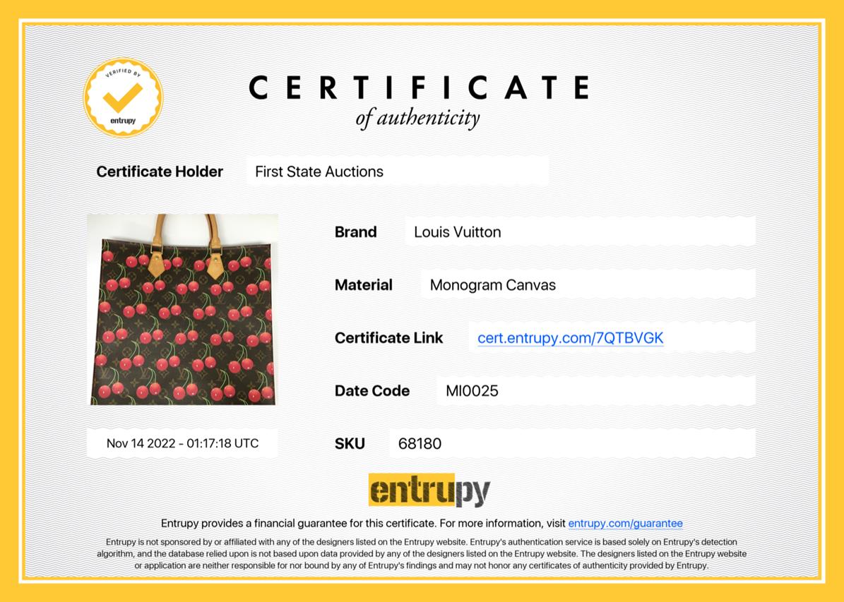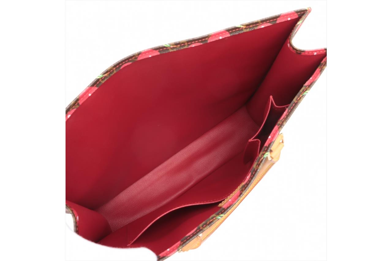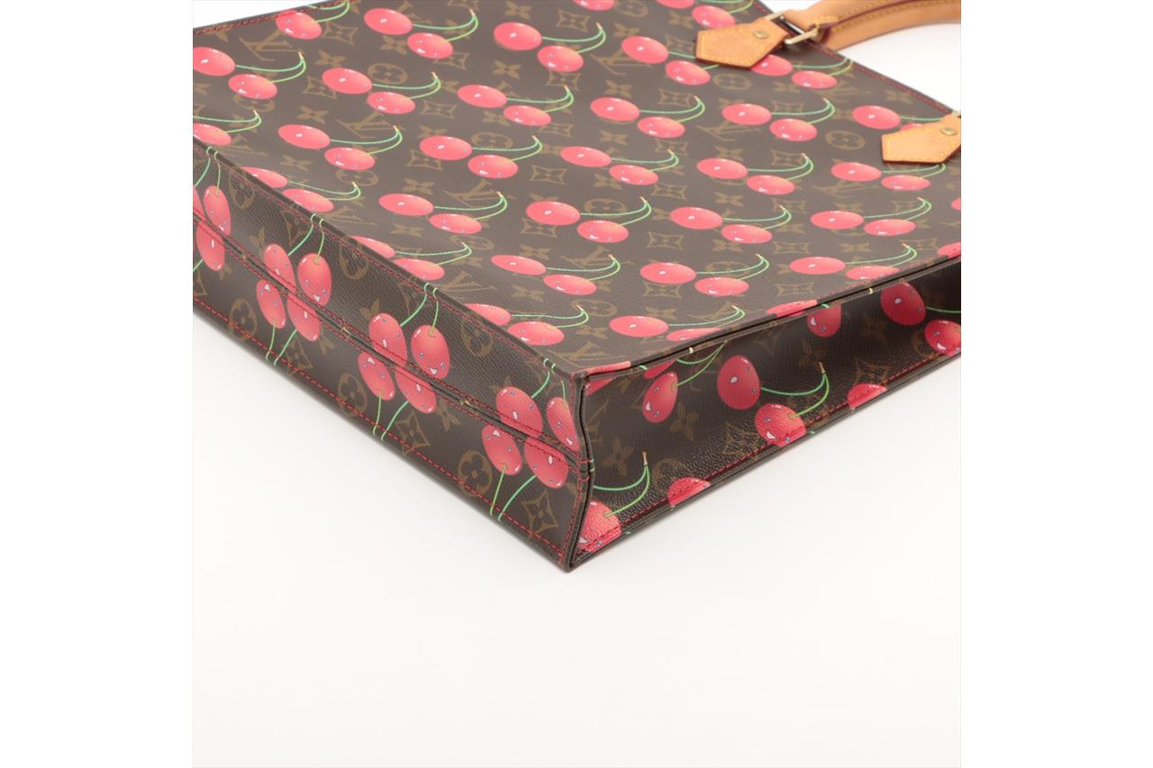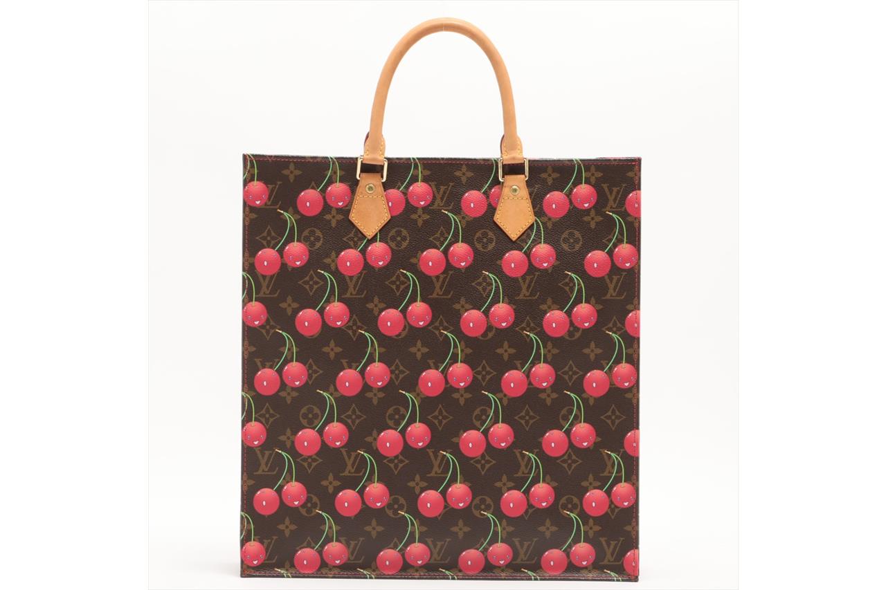 Louis Vuitton x Takashi Murakami 2005 Limited Edition Cherry Sac Plat. Featuring monogram canvas with cherry print exterior, leather trim, gold-tone hardware, red leather lining, main compartment with single slip pocket, and an open top. Approximate dimensions: 36cm (L) x 38cm (H) x 9.5cm (D), and 13cm handle height. Accompanied by Louis Vuitton dust bag. With Entrupy Certificate of Authenticity. (Pre-owned)