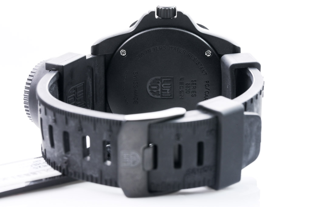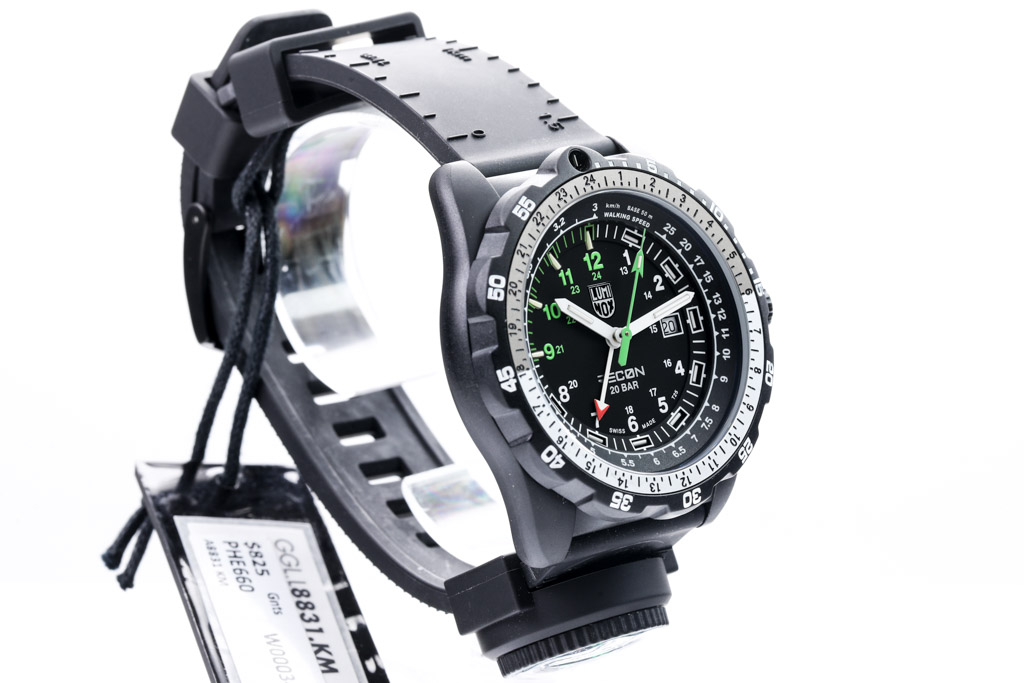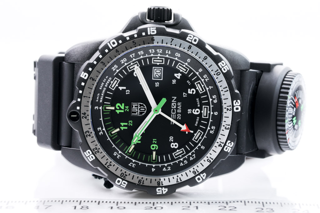 Luminox Recon Navigation Specialist Compass carbon quartz mens watch. Black dial, date, case diameter: 46mm, strap length: 23cm, Swiss made. Ref# A8831KM. With Luminox black rubber strap and buckle. With luminox International Warranty Card and Luminox box. Luminox 2 year warranty applies. (As New, Note: minor scratches on case and light wear on strap due to being display stock)