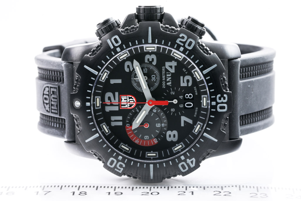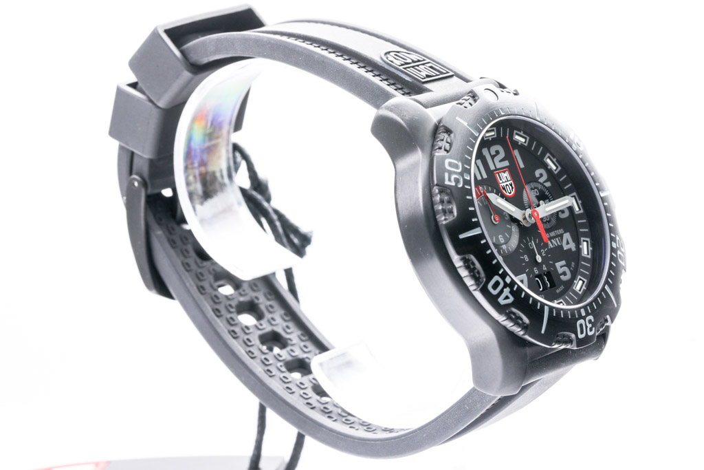 Luminox Sea Collection black PVD coating stainless steel quartz mens watch. Black chronograph dial, date, case diameter: 44mm, strap length: 23.5cm, Swiss made. Ref# A4241. With Luminox black rubber strap and buckle. With International Warranty card and Luminox box. Luminox warranty applies. (As New, Note: minor scratches on case due to being display stock)