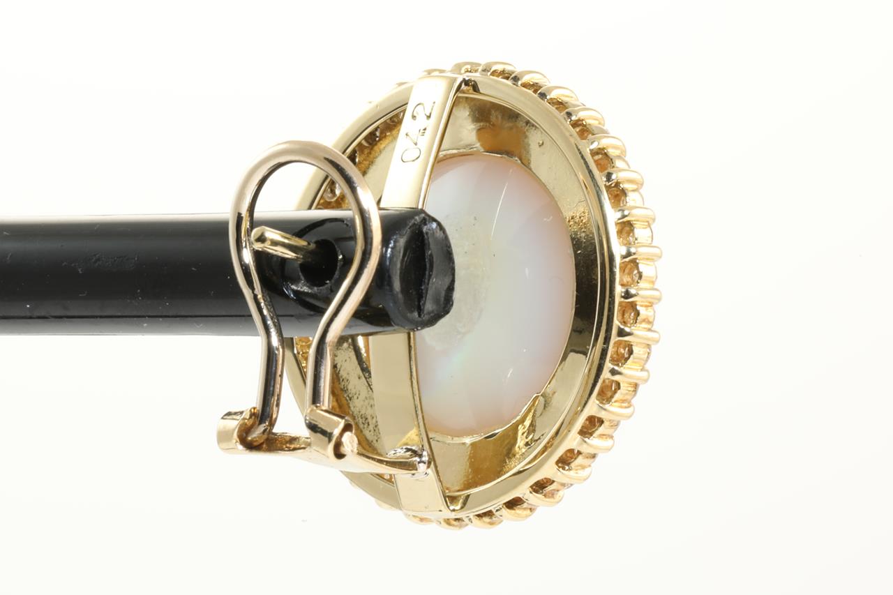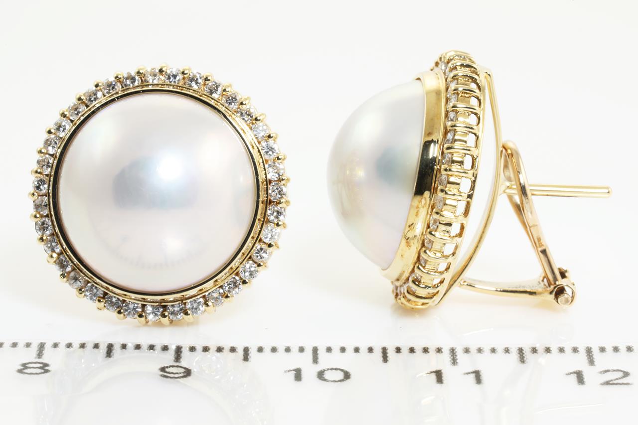 Pearl and Diamond clip-on earrings (for pierced ears) with Mabe Pearls of 15.0mm and Diamonds totalling 0.84cts (Estimated grading: G-H SI). 18ct yellow goold. Weight: 13.9g (Pre-owned)