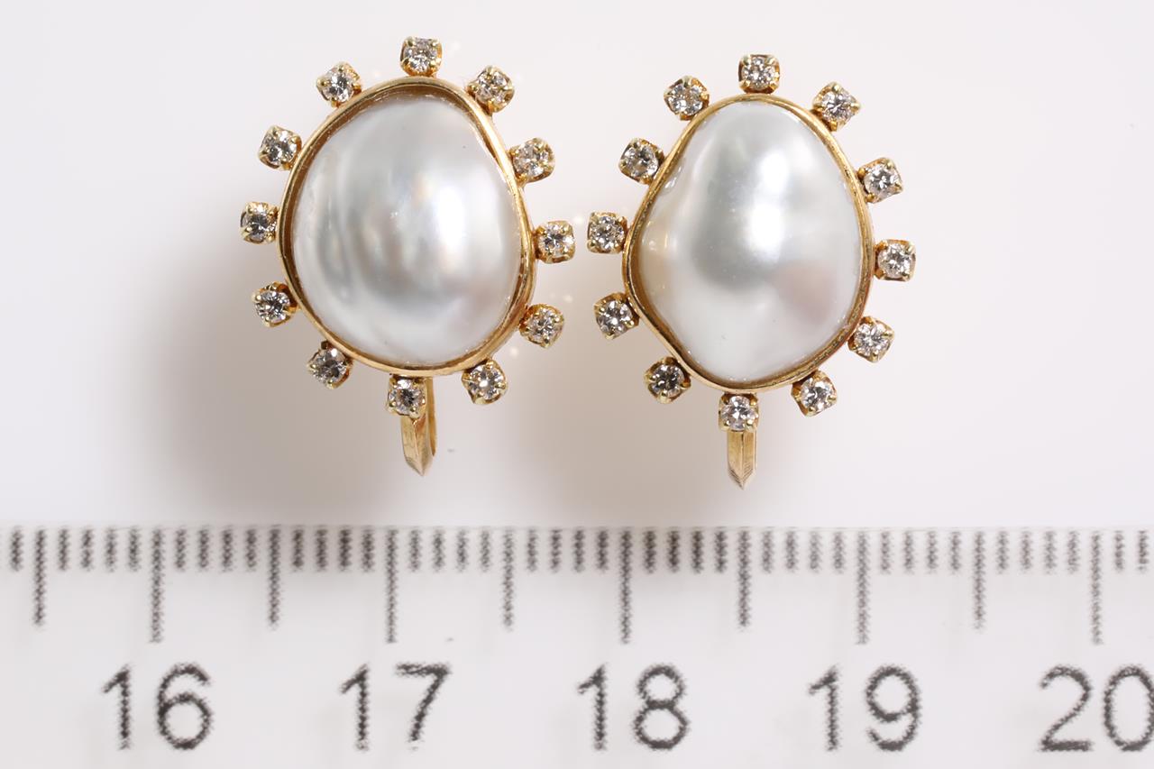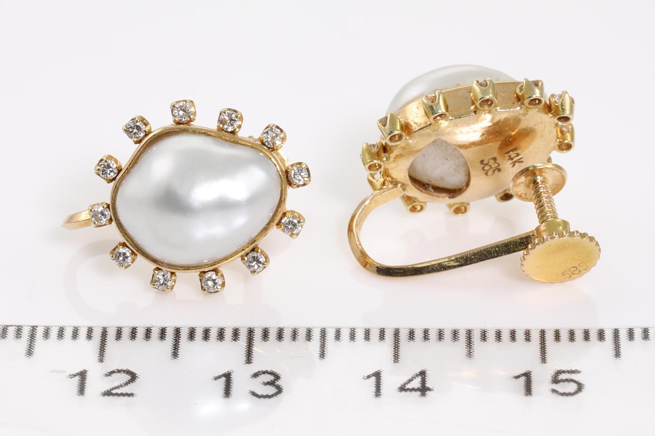 Mabe Pearls and Diamonds Screw back Earrings with two Baroque shaped Mabe Pearls of approximately 11.7 x 9.9mm and round Diamonds totalling approximately 0.24cts. 14ct yellow gold. Weight 5.7g. (pre-owned)