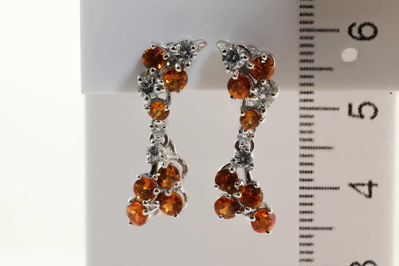 Garnet and Diamond earrings with round Mandarin Garnets totalling 2.20cts and Diamonds totalling 0.50cts (Estimated grading: G-H SI). 18ct white gold with gold & silicon backs. Weight: 6.6g. (Pre-owned)